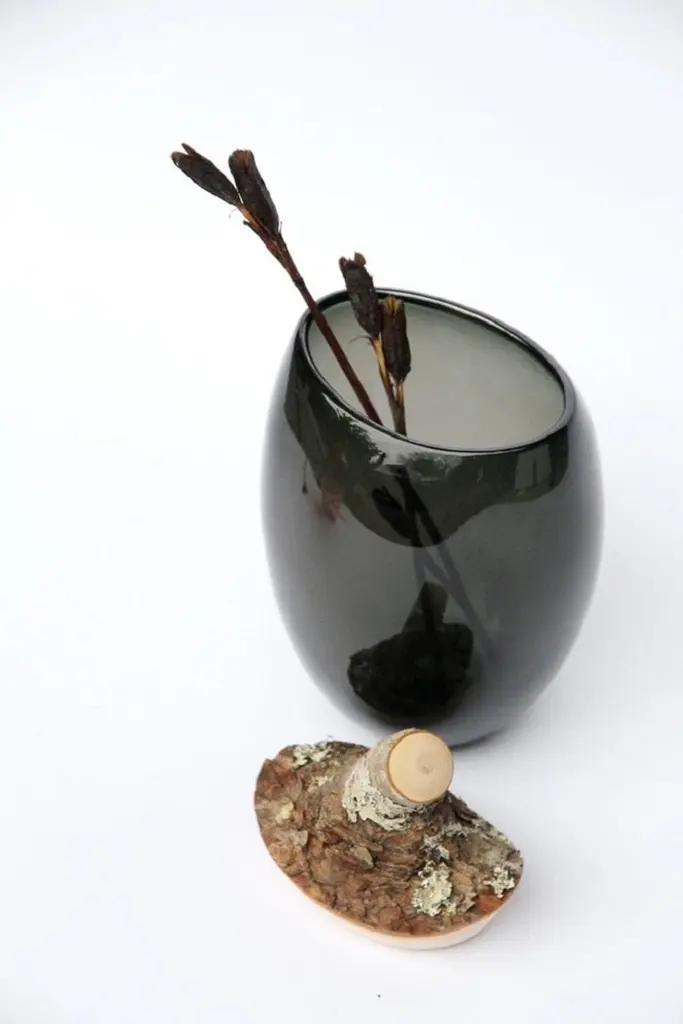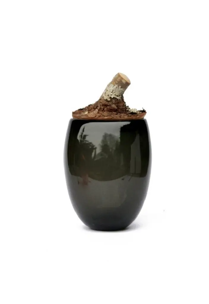 Big Smoke Branch Bowl, Pia Wüstenberg.Dimensions: D 18 x H 27.Materials: glass, wood.Available in other colors.A playful jar, with a lid made from a branch stub following the curvature of the glass. Branch Bowls are blown without a mould: their outer rim is originally the inside of the glass bubble, thus their round and soft edges, characteristic of this artistic process.Handmade in Europe: freehand blown glass (England), wood (Finland).The materials then come to our warehouse in North Germany where they are fitted and assembled.Pia Wüstenberg, UtopiaPia Wüstenberg is a creative with a passion for materials and craft. She graduated from the Royal College of Arts Design Products course in 2011 and was running her own freelance studio in East London till summer 2017. After this her studio relocated to rural North Germany, allowing better access to the European crafts and more time to dream. Pia is a freelance designer at Utopia and utility and owner of the brand (which involves everything from heavy lifting to drawing up new ideas).