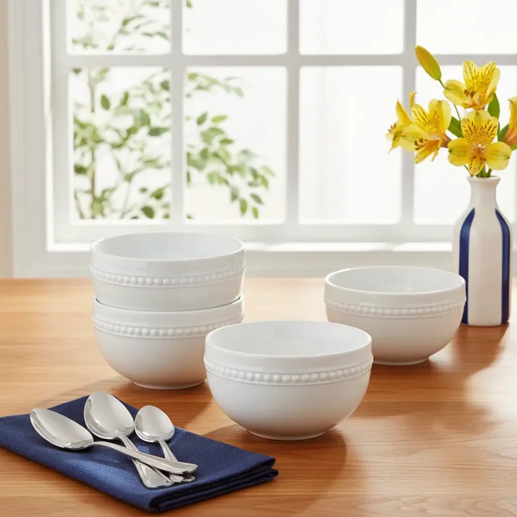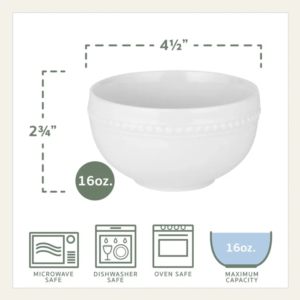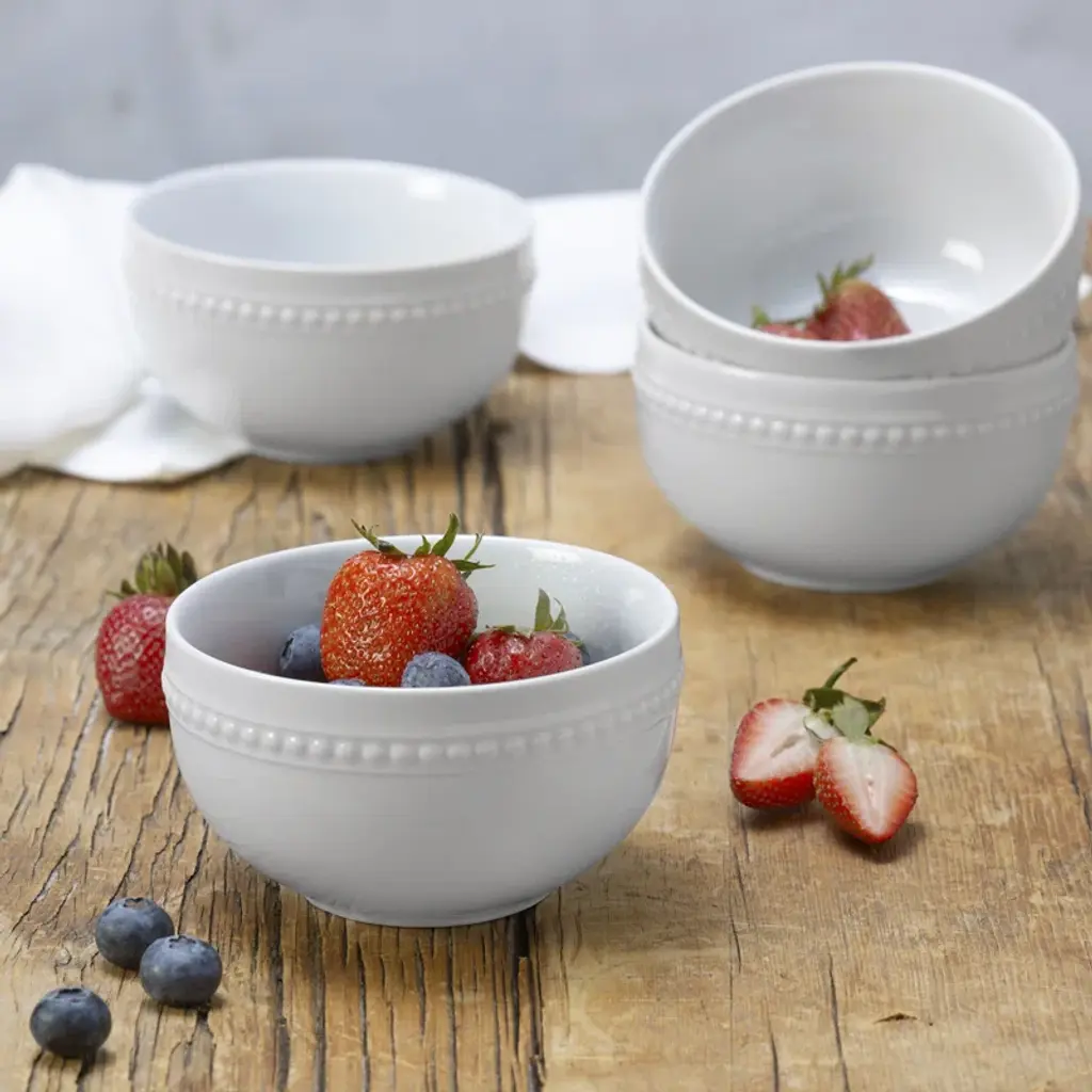 This Marque Set of 4 Beaded Fruit Bowls by Fitz and Floyd is ideal for serving fruit, ice cream, desserts, individual snacks, salsa, dips, and more. Crafted of porcelain, these elegant white bowls are detailed with an understated, raised bead pattern and are perfect for both everyday dining and formal occasions. Set of 4 bowls, each measuring 2 3/4-inches high and 4-1/2 inches in diameter with a 16-fluid ounce capacity. Dishwasher and microwave safe, and oven safe up to 450 degrees.