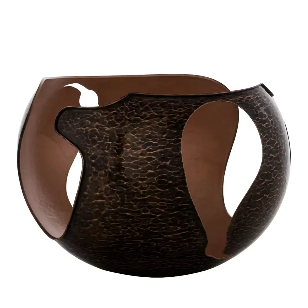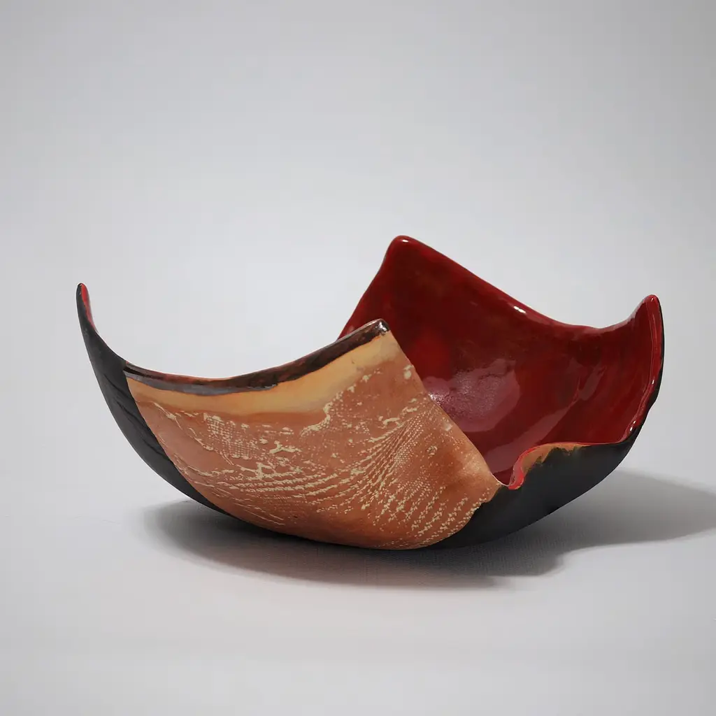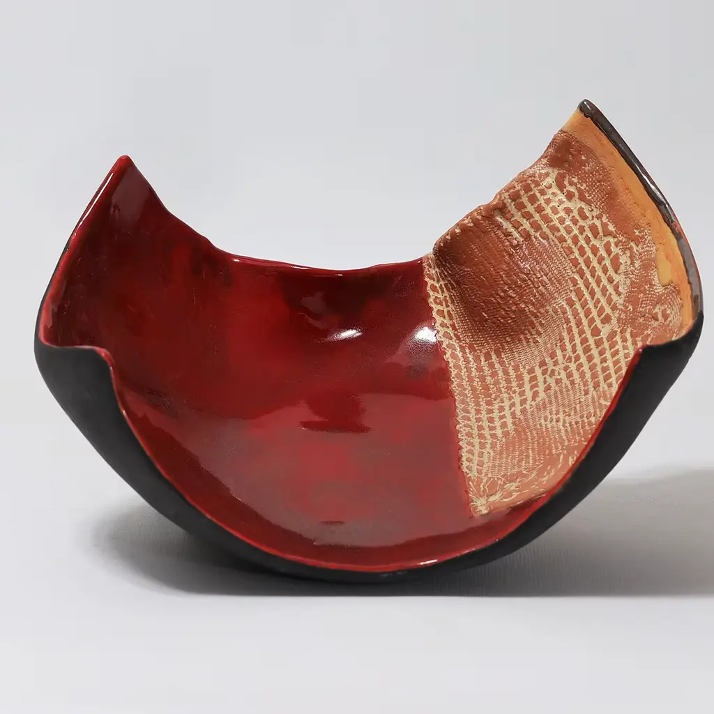 Part of a series of designs inspired by the traditional colors of Sardinia, this bowl states its contemporary flair at first glance thanks to its seemingly crumpled design. A singular piece, it is fashioned by following the slab building technique and decorated by hand with a matte black base that contrasts with a combination of red-purple glaze and lace-inspired texture on the inside.