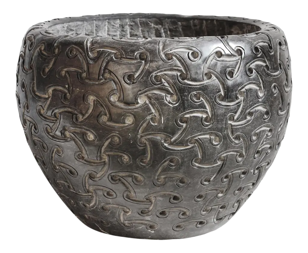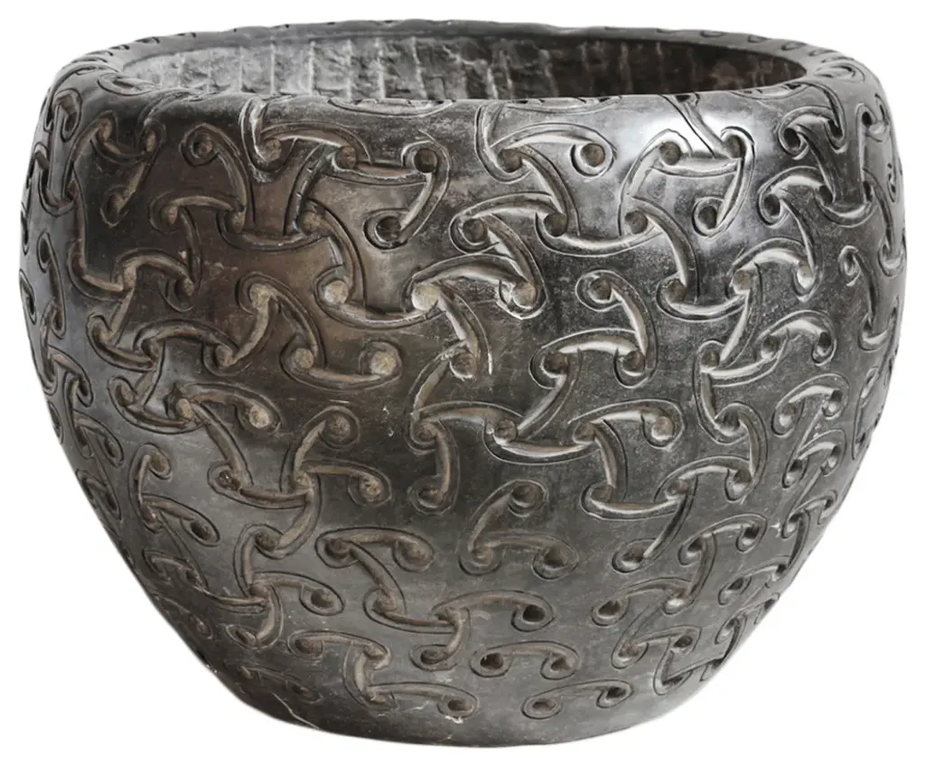 Hand carved solid black marble bowl with repeating woven geometric design. Opening at top measures 19" diameter. No drainage hole. Each may be slightly unique in exact finish and natural imperfections. This item is non-returnable - all sales are final.