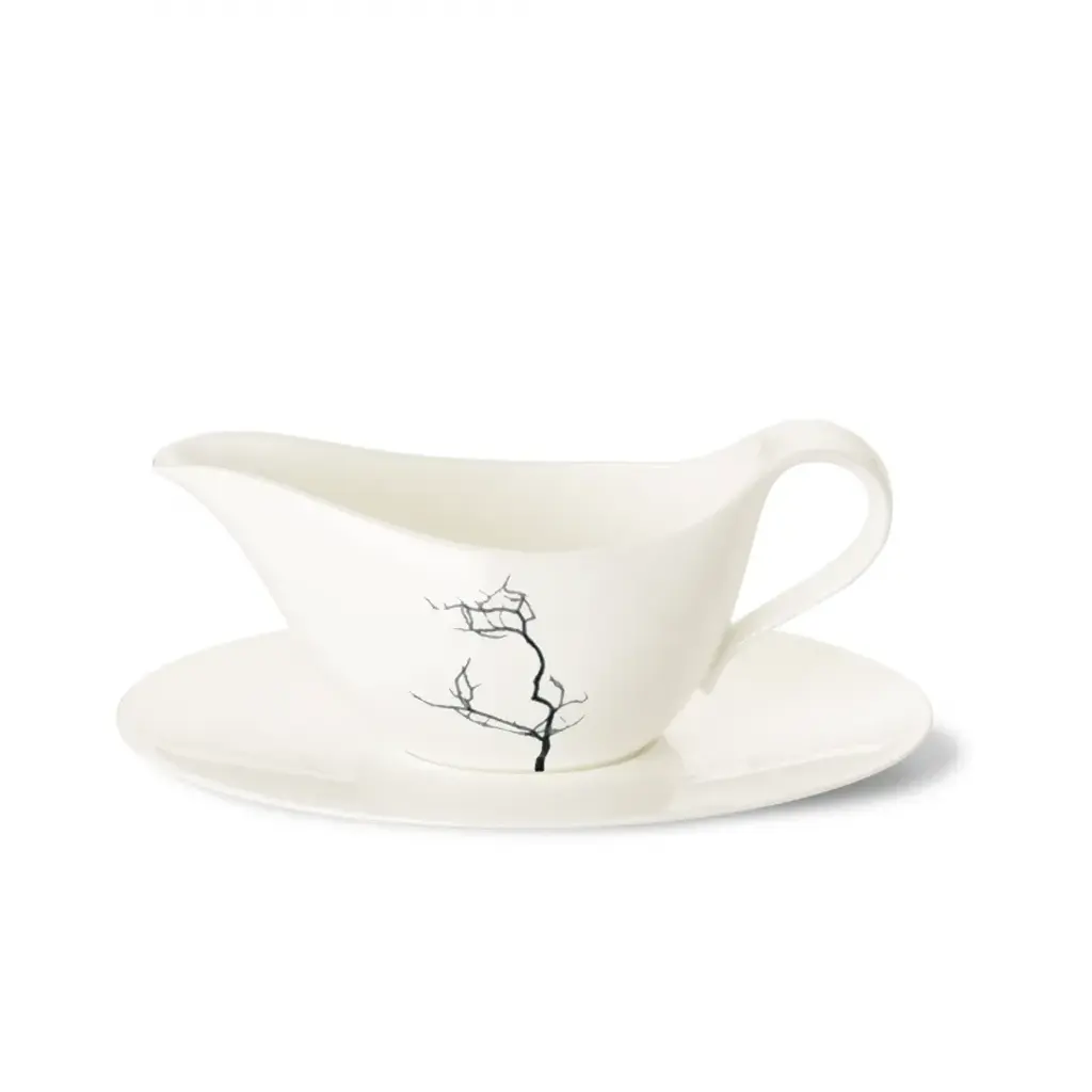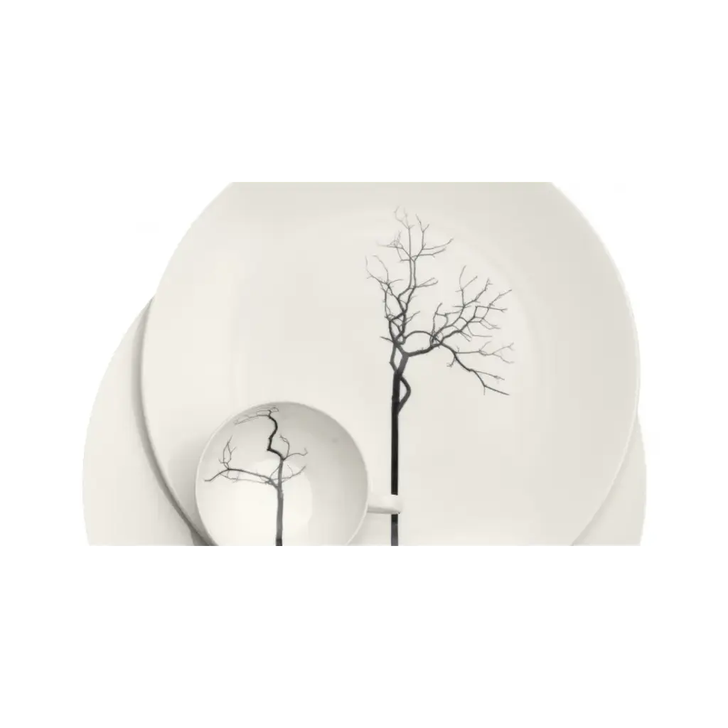 Inspired by nature, modern and individually staged. Various black silhouettes of trees branch out tenderly over cups and plates, seem to be natural and abstract at the same time. The trunk continues over the rims of the cups and develops to a graphic element.