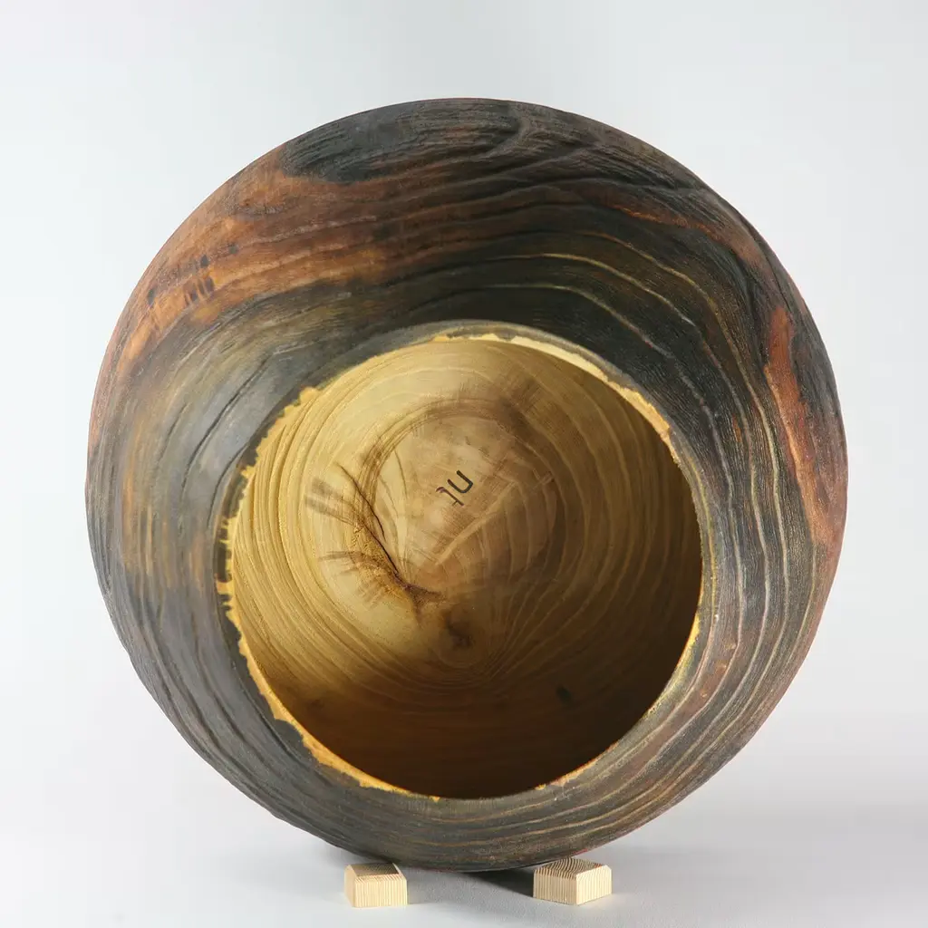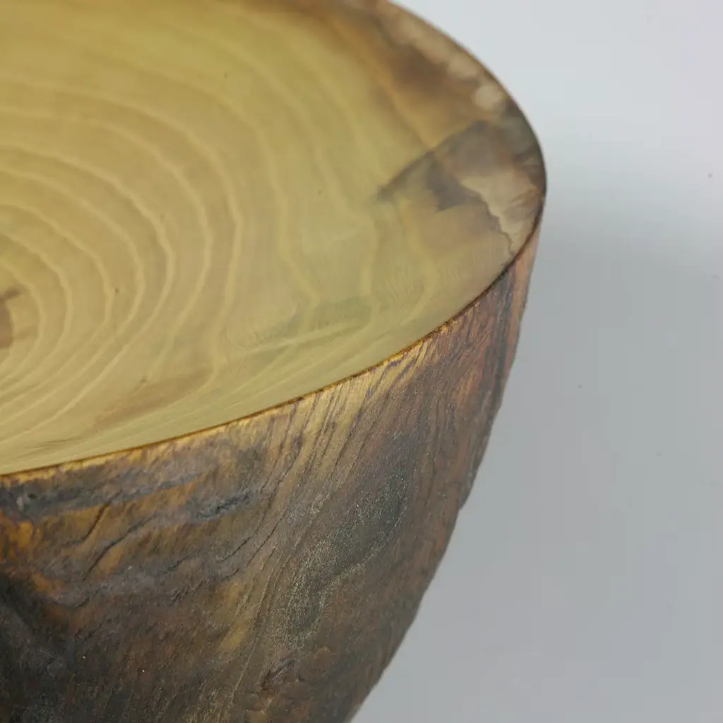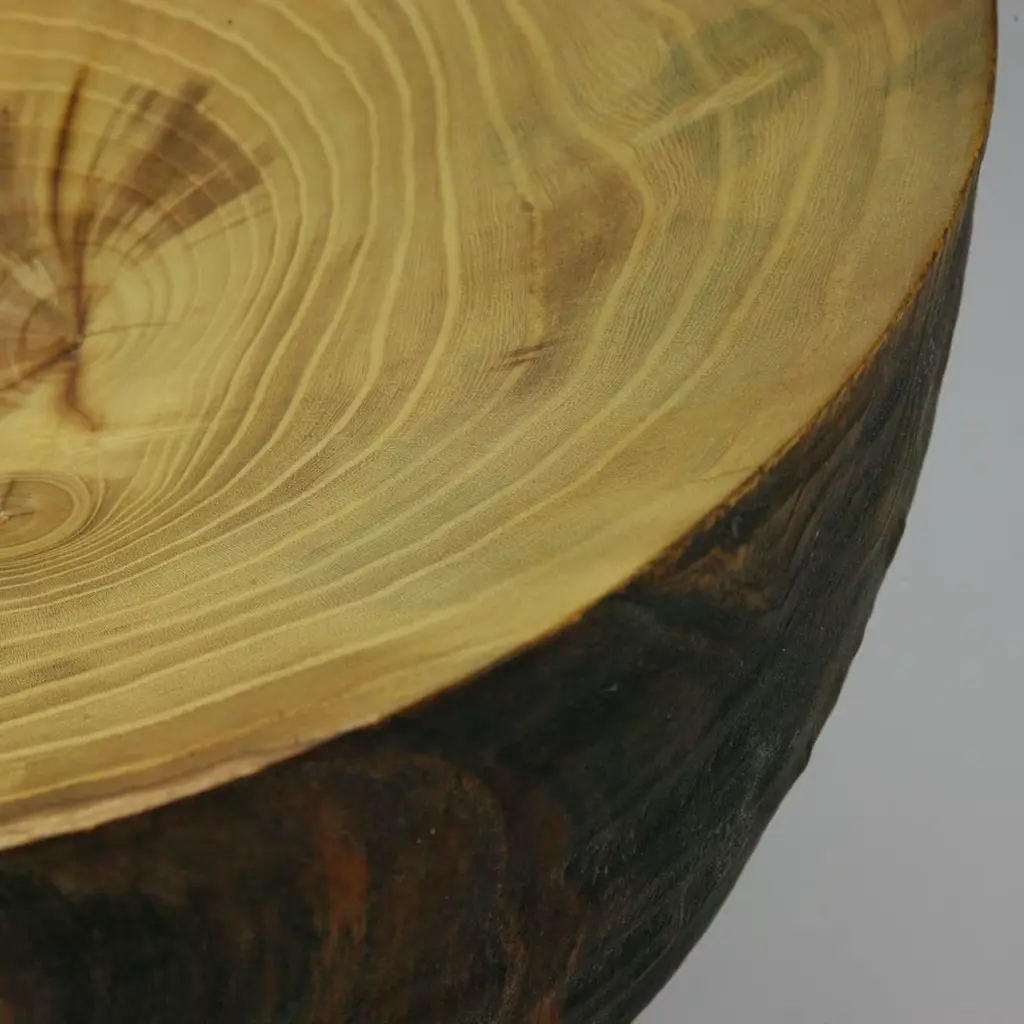 This superb object of functional decor of great visual impact will make an elegant statement in a contemporary or rustic interior. It was entirely crafted of locust wood by Nicola Tessari using a lathe with a particularly complex technique. The exterior is brushed and treated with iron acetate, while the interior is polished. These two treatments create an effect that highlights the different volumes and the grain of the wood. The piece is finished with a micro-crystal wax.