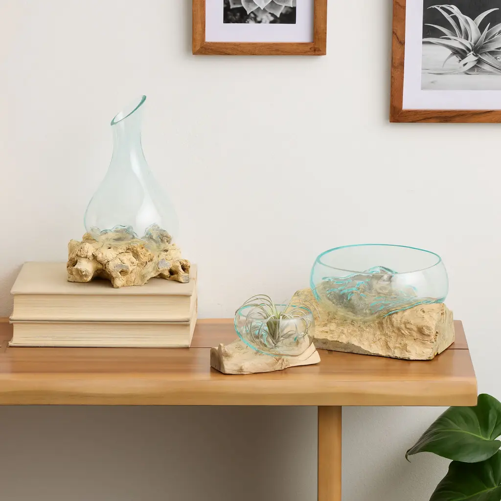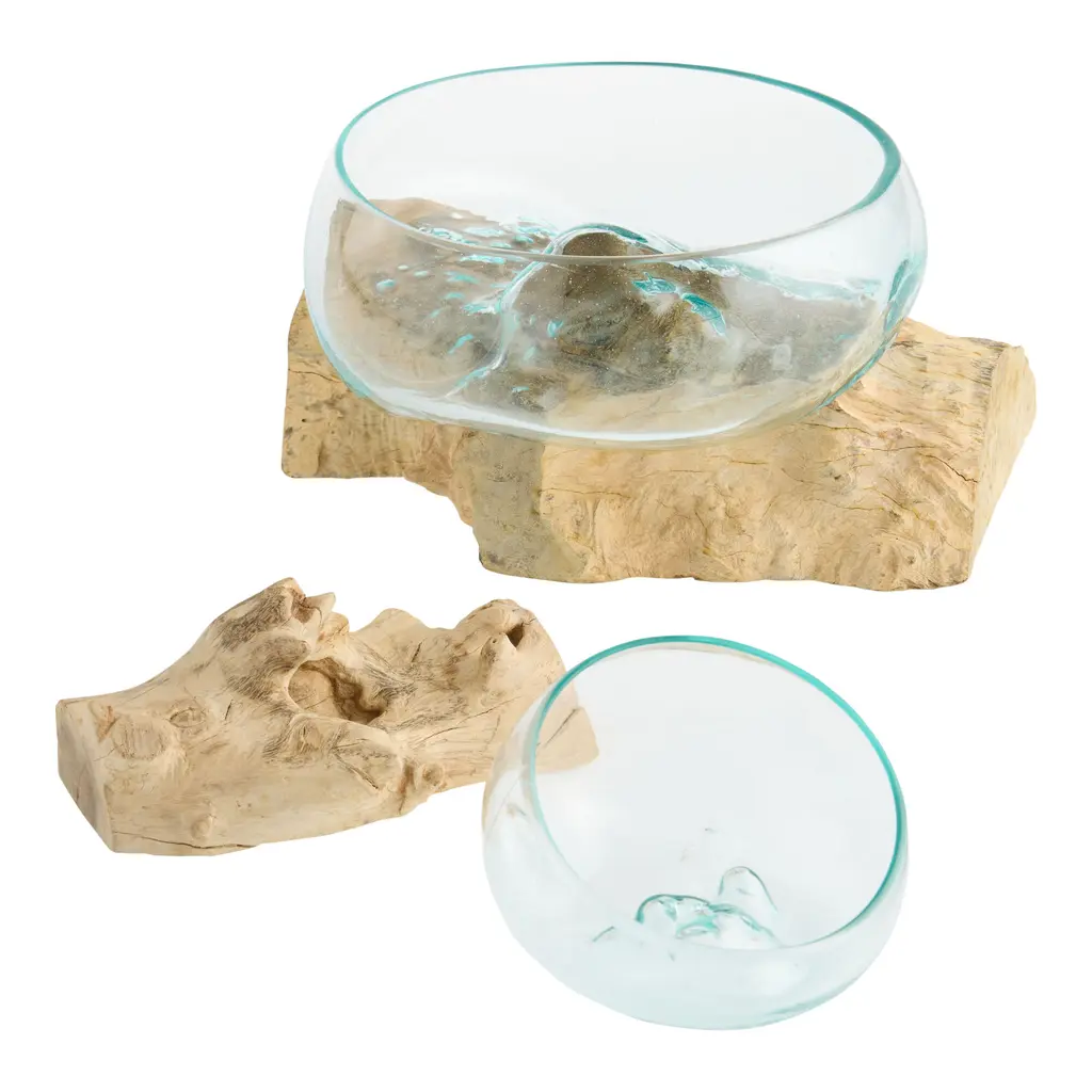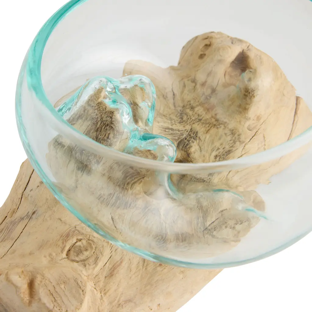 Crafted of handblown glass molded to the shape of the bleached driftwood below it, our striking bowl decor has modish appeal with its fluid and organic look. Available in two sizes, the inherent variations in its materials and construction make each piece entirely unique. Use this one-of-a-kind decor to hold your favorite air plants or bowl filler, and add a custom coastal touch to any aesthetic.