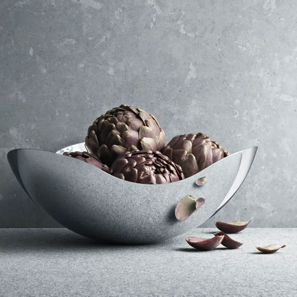 Mirror-finished stainless steel serving pieces designed by Helle Damkjaer for Georg Jensen perfectly combine organic and modern design elements.