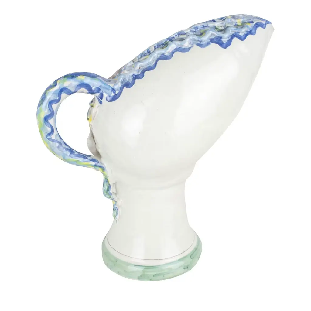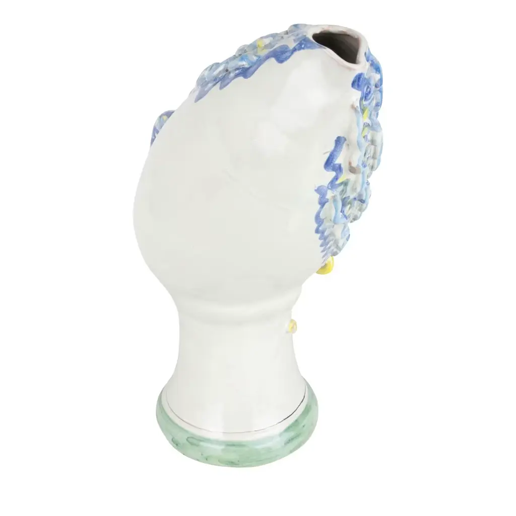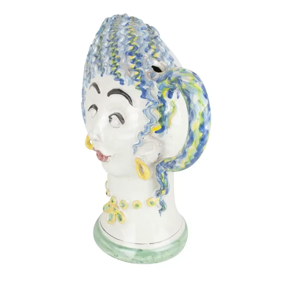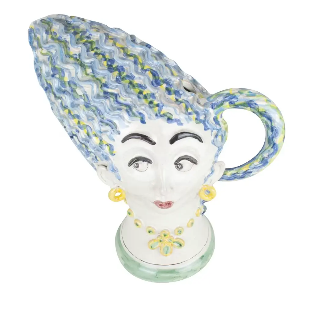This exquisite ceramic creation was crafted entirely by hand using a lathe. The details and the colorfully vibrant painting were applied by hand as well. Represented in this piece is a beautiful woman adorned in jewels with multicolored hair painted light blue with yellow accents. This functional piece can also be used for decoration or as a centerpiece and will appeal to the whole family.