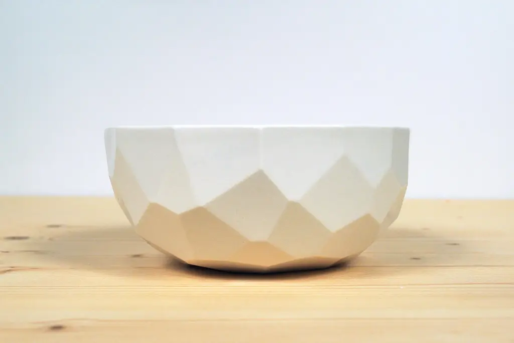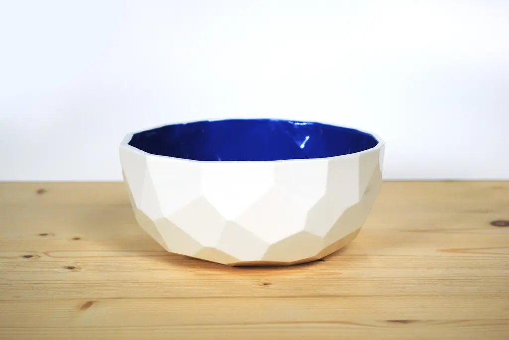 Porcelain tableware at a low resolution. Instead of smooth shapes, this pottery is build up out of polygons. Every product is unique and handmade, so it will be a great eye-catcher in a modern interior. It has a very surprising shape, and holds firmly. Made in high quality glazed porcelain, for a long lifetime at a daily use. The color on the exterior is high gloss white to emphasize the polygons. Combined with the bright inside colors, this will result in great contrast. This bowl holds 600ml (20 Fl. oz.) and could easily fit in one hand. Great for noodles, cereal, or a soup. Store them compactly as the bowls will stack into each other. High quality for daily use and safe for the oven, dishwasher and microwave.