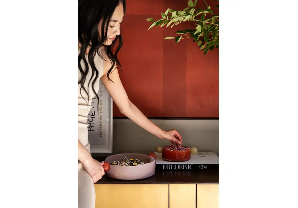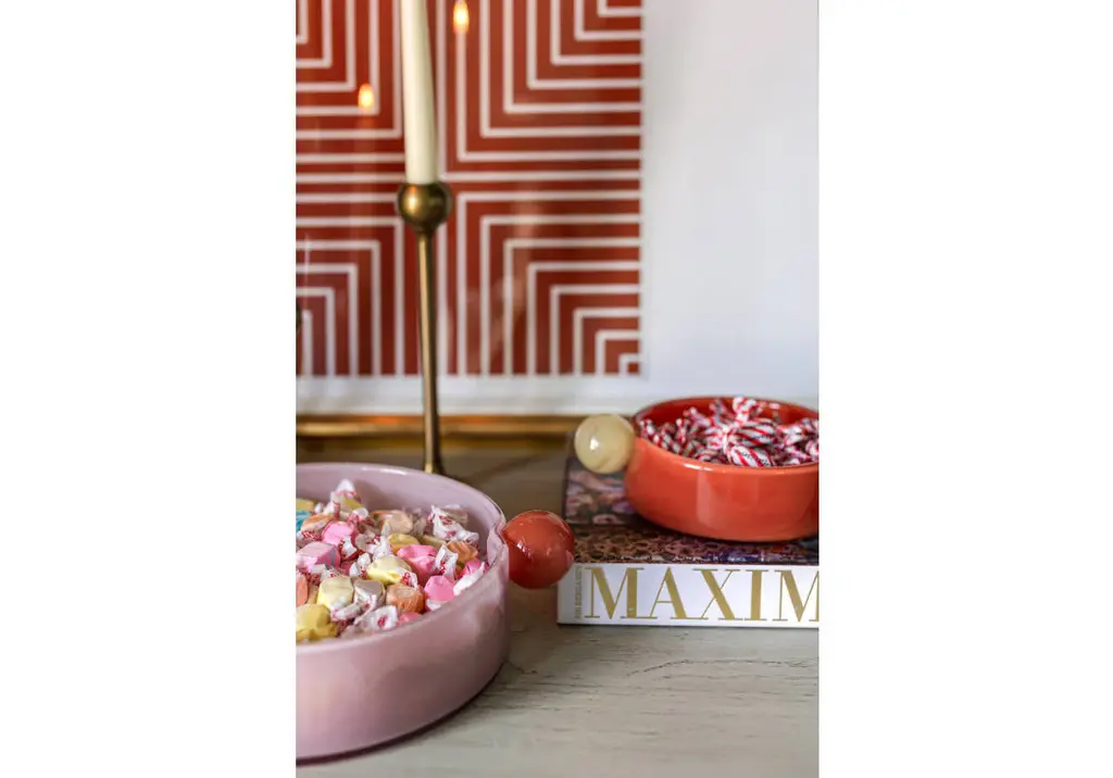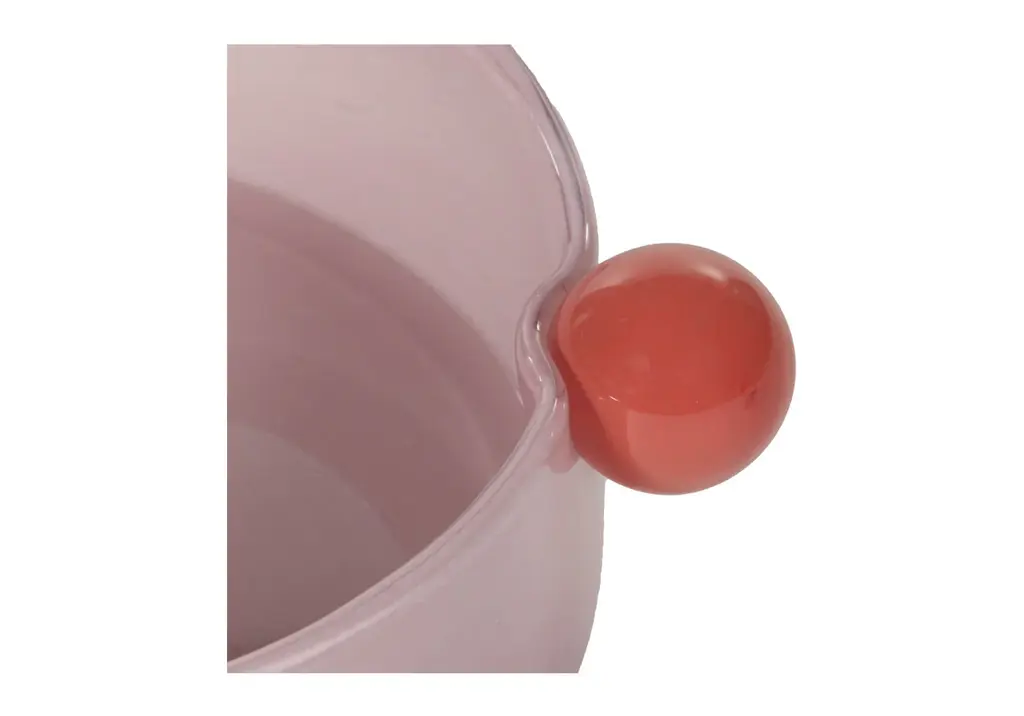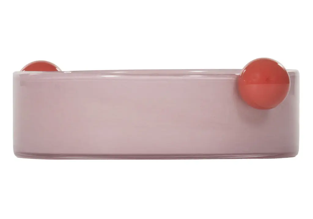 Named after the Italian word for 'bubble,' the Bolla Bowl is a playful study in contrast and craft. Handblown in rose-toned glass with oversized ruby orbs on each side, it's both substantial and full of personality. Style as a catchall, centerpiece, or sculptural accent. Bolla brings instant charm and color to any surface.