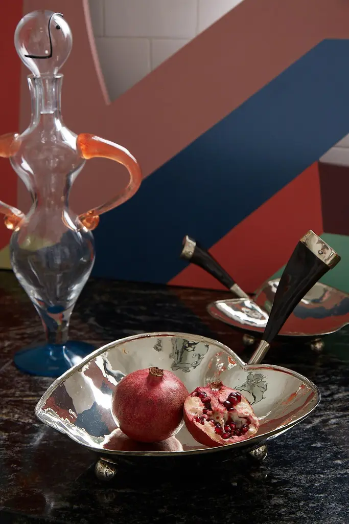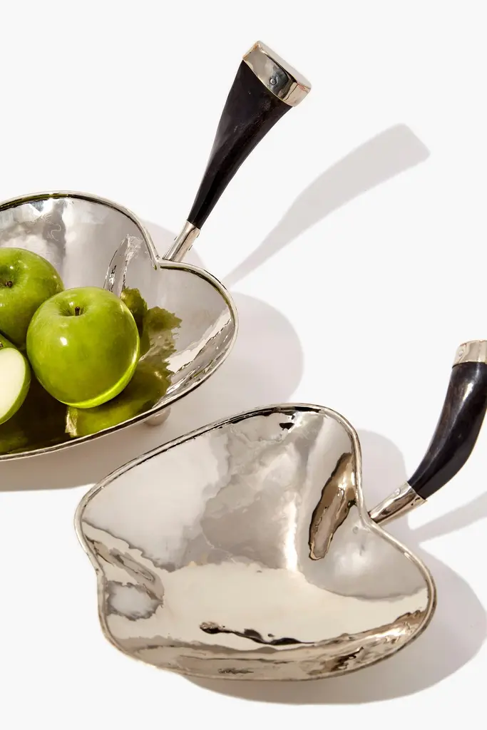 While walking through the fruit fields in the Bolson on an ending spring morning, the voluptuous shapes and scents of pears and apples bring your senses to life. This idea creates the pieces that carry the organic stamp of these fruits in alpaca and brown and black goat horn trays.Our pieces are made by hand. One of a kind.Natural horn may vary in color.