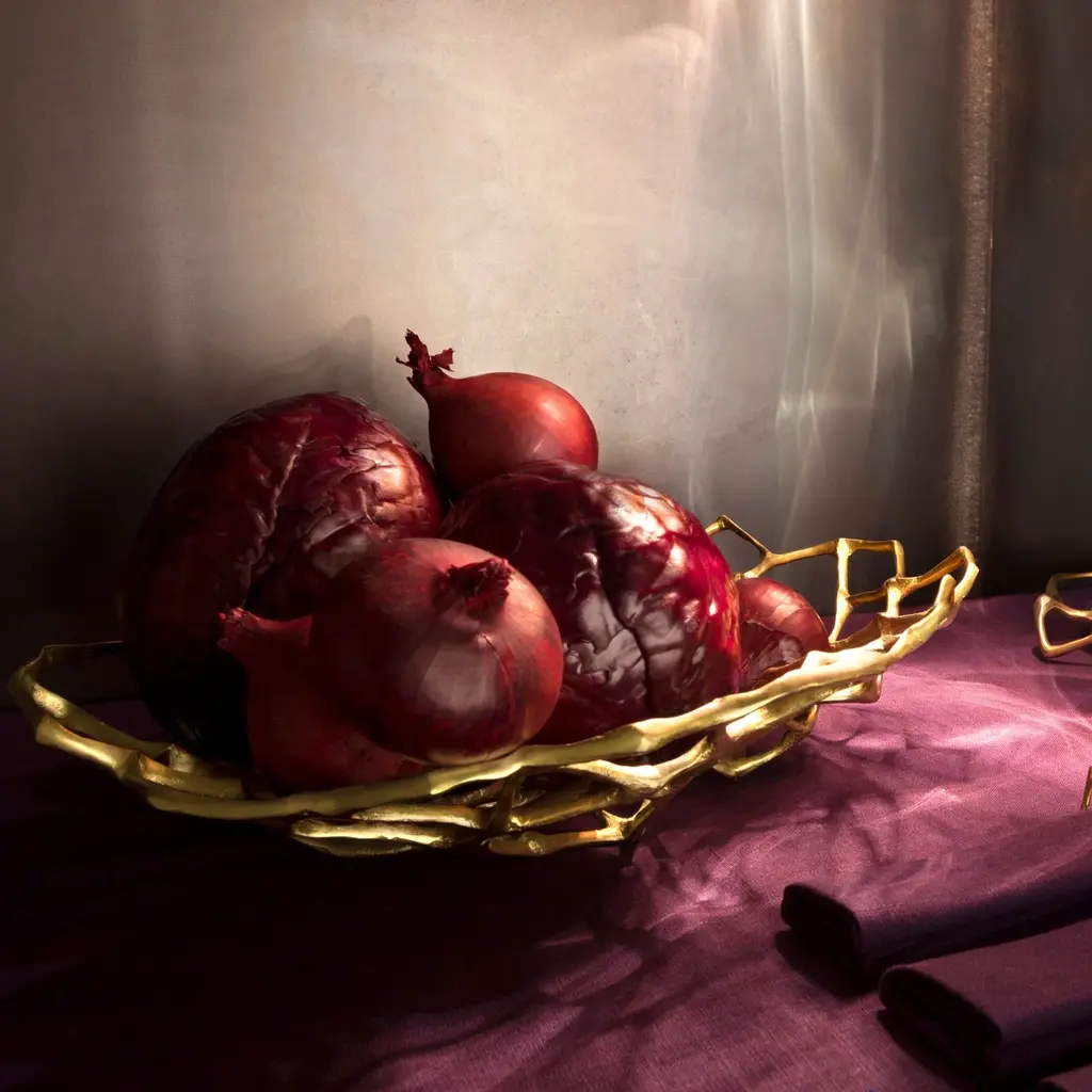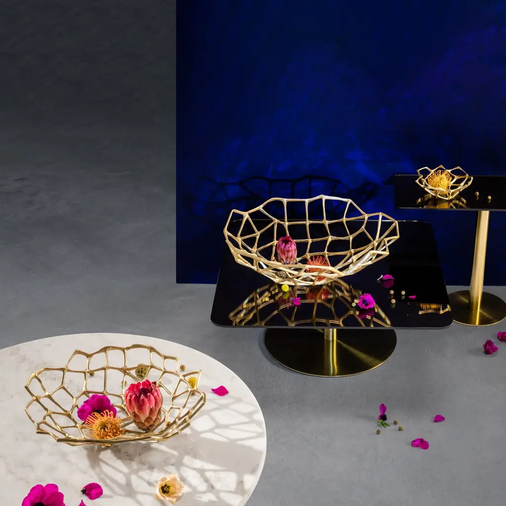 The unusually open nature of this solid-brass bowl first catches the eye. Bone makes for a striking centerpiece on its own or as a container for an impromptu arrangement. Tom Dixon’s sculptural bowl is cast in solid brass with a subtle matte finish.