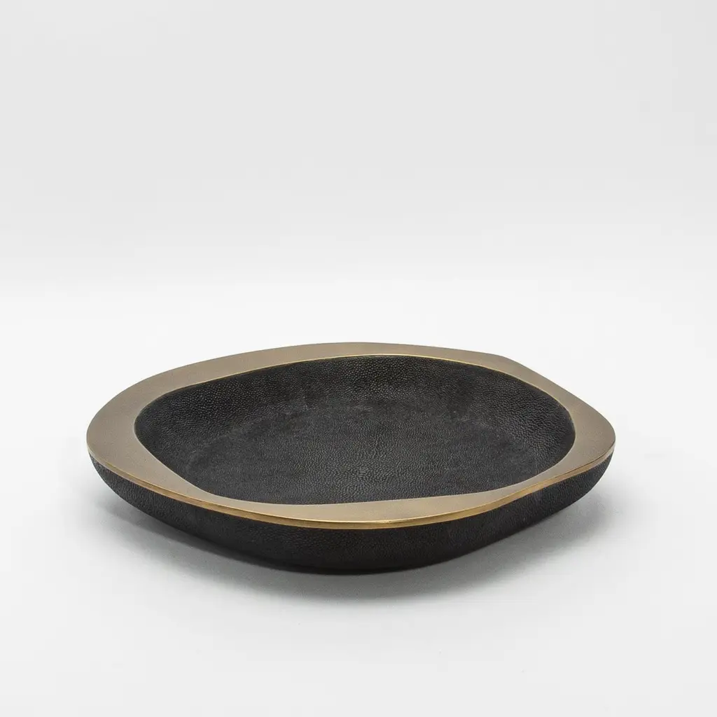 The Lily Bowl in black shagreen with bronze patina brass by R&Y Augousti exudes refined elegance through its striking contrast of luxurious materials. Handcrafted from the finest black shagreen, the textured surface adds depth and richness, while the smooth, curved brass border offers a sophisticated gleam. The interplay between the organic form of the bowl and the polished brass creates a dynamic aesthetic, making this piece a perfect blend of modern design and timeless craftsmanship.This bowl comes in different finishes and sizes. This one is size Medium.This item is on display in our LA showroomColor variants may occur on the stingray and other exotic finishesClean with soft dry clothAbout R&Y AUGOUSTI:R&Y Augousti, created by the visionary husband-and-wife duo Ria and Yiouri Augousti, epitomizes the pinnacle of luxurious, globally inspired design. Since its inception in Paris in 1989, the brand has become synonymous with opulence, distinguishing itself through the masterful integration of shagreen with brass and other exotic materials. Each piece in their Art Deco-inspired collection is a testament to unparalleled craftsmanship, meticulously handcrafted by the finest artisans in the Philippines, ensuring that every creation is a unique masterpiece.Ria, hailing from Manila, and Yiouri, from Cyprus, share an exquisite passion for revivalist design, which has propelled R&Y Augousti to the forefront of luxury interiors. Their innovative use of materials, particularly the revival of shagreen, has set new standards in elegance and sophistication. The natural color variations on stingray and other exotic finishes further enhance the authenticity and bespoke nature of their designs.Today, R&Y Augousti’s collections grace the most exclusive showrooms in Paris, New York, and Los Angeles at the Pacific Design Center's MOGUL, continuing to redefine the essence of timeless luxury. Their work is not merely furniture; it is a celebration of art, craftsmanship, and the ultimate in refined living.
