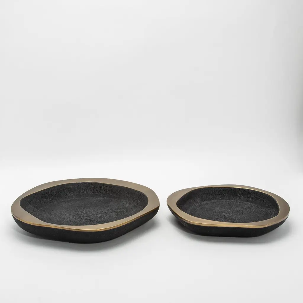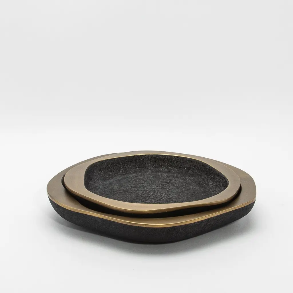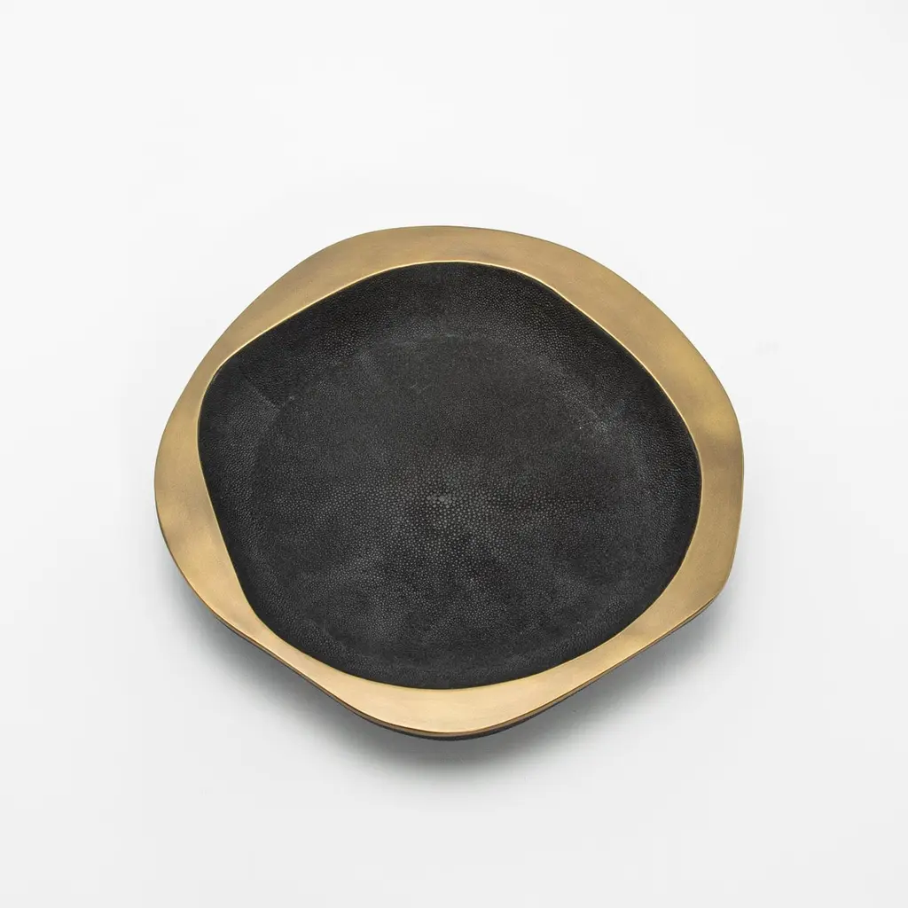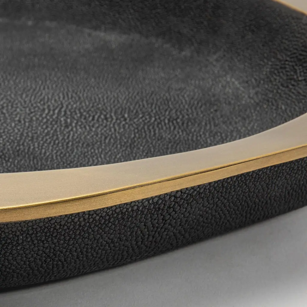 The Lily Bowl in black shagreen with brass details by R&Y Augousti exudes refined elegance through its striking contrast of luxurious materials. Handcrafted from the finest black shagreen, the textured surface adds depth and richness, while the smooth, curved brass border offers a sophisticated gleam. The interplay between the organic form of the bowl and the polished brass creates a dynamic aesthetic, making this piece a perfect blend of modern design and timeless craftsmanship.This bowl comes in different finishes and sizes. This one is size Large.This item is on display in our LA showroomColor variants may occur on the stingray and other exotic finishesClean with soft dry clothAbout R&Y AUGOUSTI:R&Y Augousti, created by the visionary husband-and-wife duo Ria and Yiouri Augousti, epitomizes the pinnacle of luxurious, globally inspired design. Since its inception in Paris in 1989, the brand has become synonymous with opulence, distinguishing itself through the masterful integration of shagreen with brass and other exotic materials. Each piece in their Art Deco-inspired collection is a testament to unparalleled craftsmanship, meticulously handcrafted by the finest artisans in the Philippines, ensuring that every creation is a unique masterpiece.Ria, hailing from Manila, and Yiouri, from Cyprus, share an exquisite passion for revivalist design, which has propelled R&Y Augousti to the forefront of luxury interiors. Their innovative use of materials, particularly the revival of shagreen, has set new standards in elegance and sophistication. The natural color variations on stingray and other exotic finishes further enhance the authenticity and bespoke nature of their designs.Today, R&Y Augousti’s collections grace the most exclusive showrooms in Paris, New York, and Los Angeles at the Pacific Design Center's MOGUL, continuing to redefine the essence of timeless luxury. Their work is not merely furniture; it is a celebration of art, craftsmanship, and the ultimate in refined living.