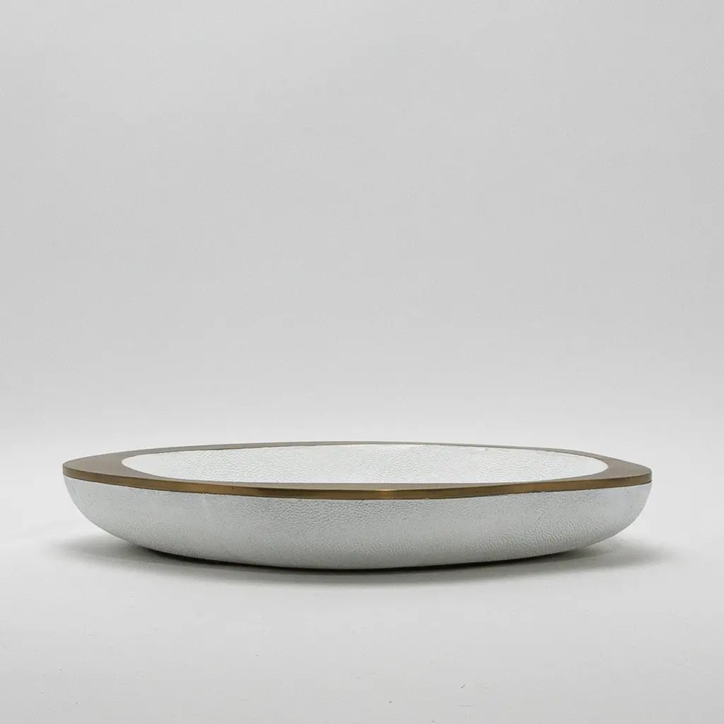 The Lily Bowl in white shagreen and bronze patina brass by R&Y Augousti exudes refined elegance through its striking contrast of luxurious materials. Handcrafted from the finest white shagreen, the textured surface adds depth and richness, while the smooth, curved brass border offers a sophisticated gleam. The interplay between the organic form of the bowl and the polished brass creates a dynamic aesthetic, making this piece a perfect blend of modern design and timeless craftsmanship.This bowl comes in different finishes and sizes. This one is size Medium.This item is on display in our LA showroomColor variants may occur on the stingray and other exotic finishesClean with soft dry clothAbout R&Y AUGOUSTI:R&Y Augousti, created by the visionary husband-and-wife duo Ria and Yiouri Augousti, epitomizes the pinnacle of luxurious, globally inspired design. Since its inception in Paris in 1989, the brand has become synonymous with opulence, distinguishing itself through the masterful integration of shagreen with brass and other exotic materials. Each piece in their Art Deco-inspired collection is a testament to unparalleled craftsmanship, meticulously handcrafted by the finest artisans in the Philippines, ensuring that every creation is a unique masterpiece.Ria, hailing from Manila, and Yiouri, from Cyprus, share an exquisite passion for revivalist design, which has propelled R&Y Augousti to the forefront of luxury interiors. Their innovative use of materials, particularly the revival of shagreen, has set new standards in elegance and sophistication. The natural color variations on stingray and other exotic finishes further enhance the authenticity and bespoke nature of their designs.Today, R&Y Augousti’s collections grace the most exclusive showrooms in Paris, New York, and Los Angeles at the Pacific Design Center's MOGUL, continuing to redefine the essence of timeless luxury. Their work is not merely furniture; it is a celebration of art, craftsmanship, and the ultimate in refined living.