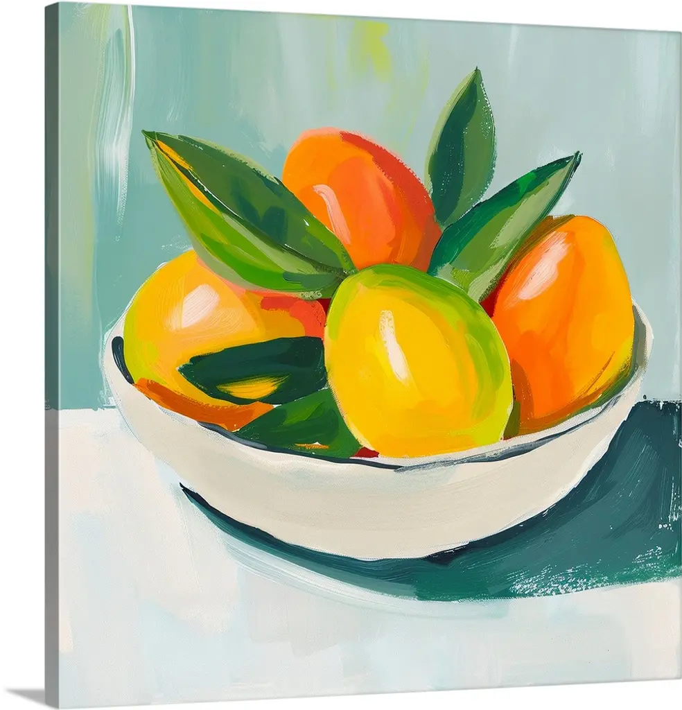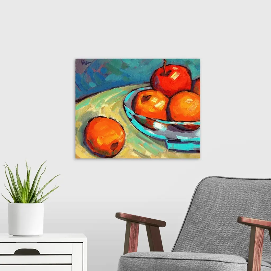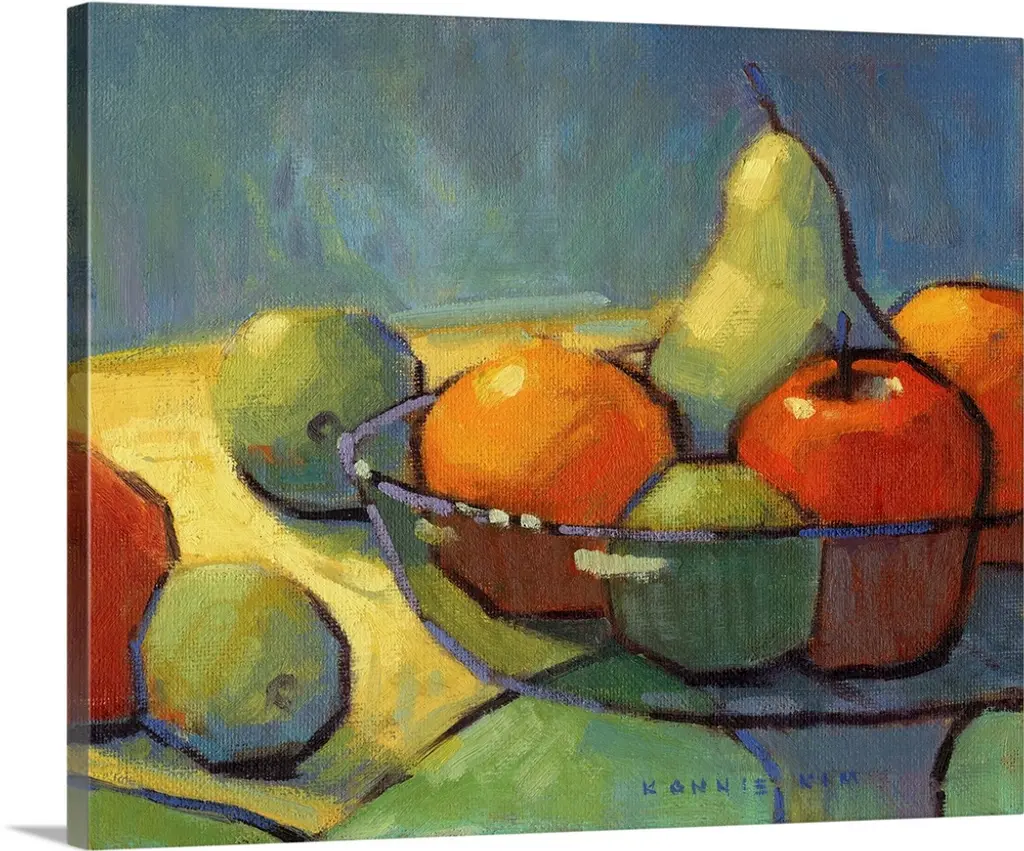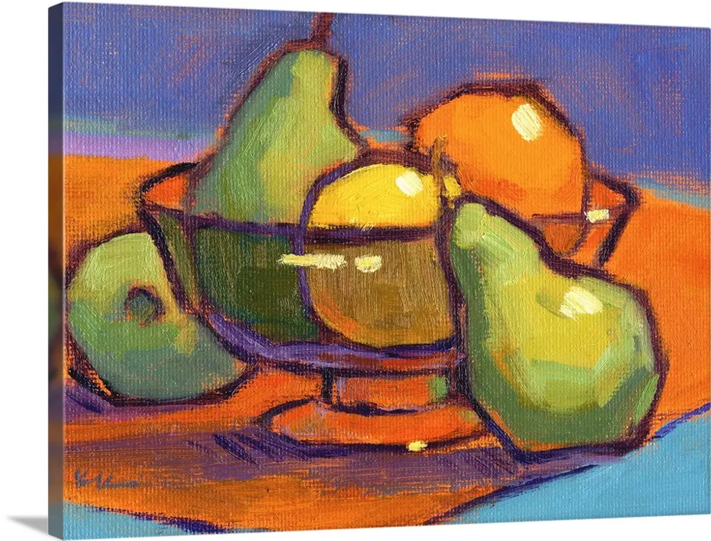 A contemporary abstract painting of a bowl of fruit in vibrant colors.