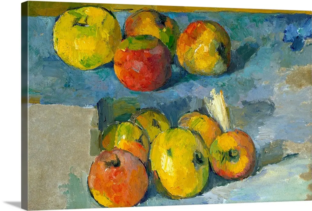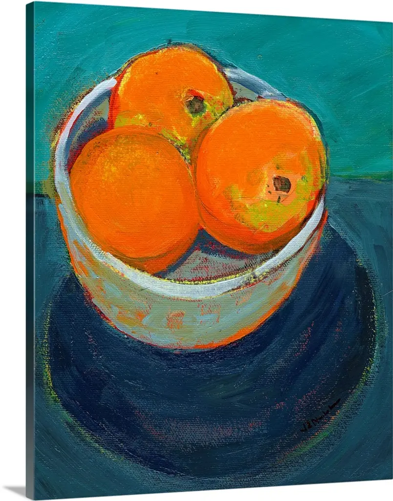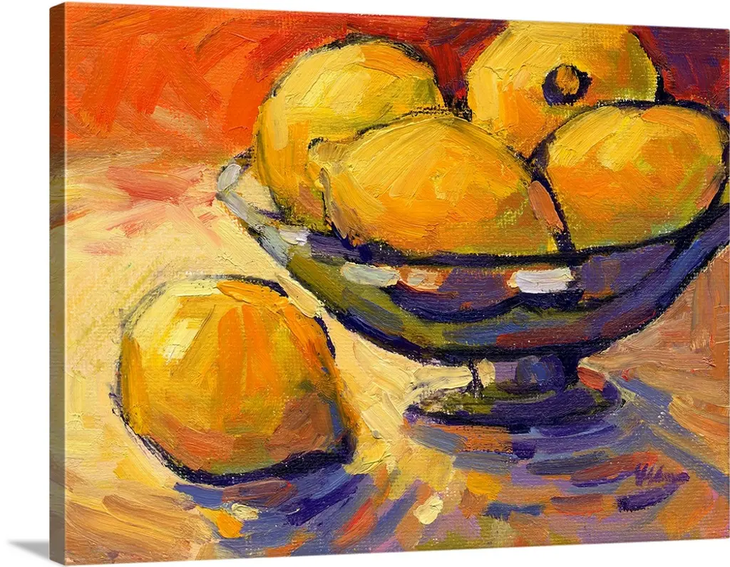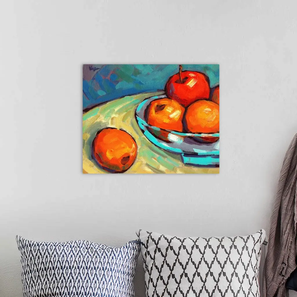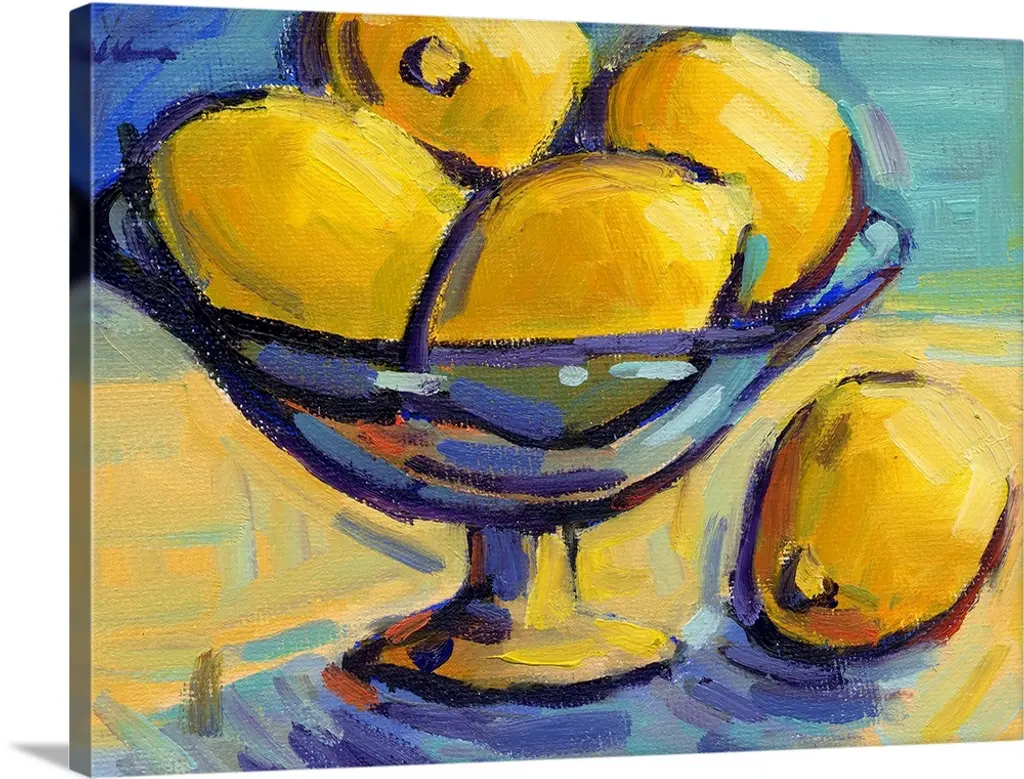 A contemporary abstract painting of a bowl of fruit in vibrant colors.
