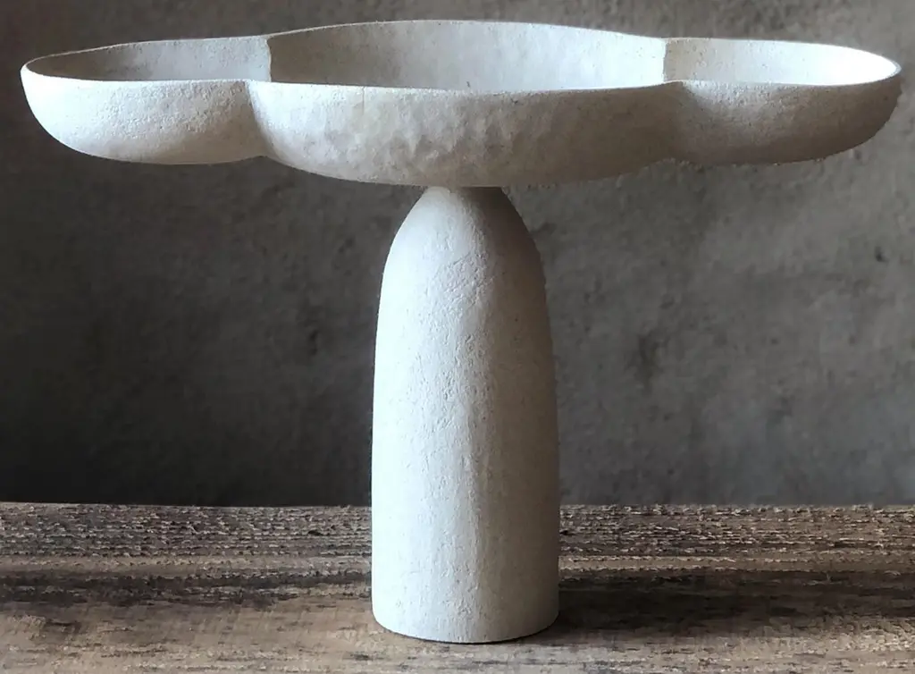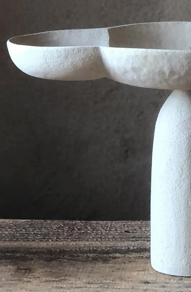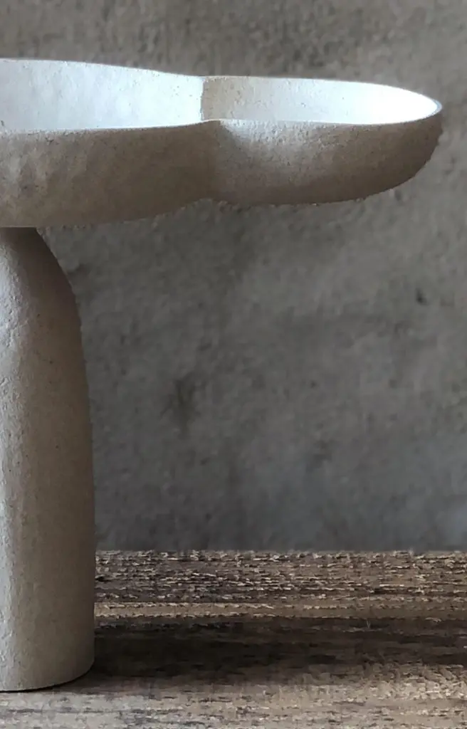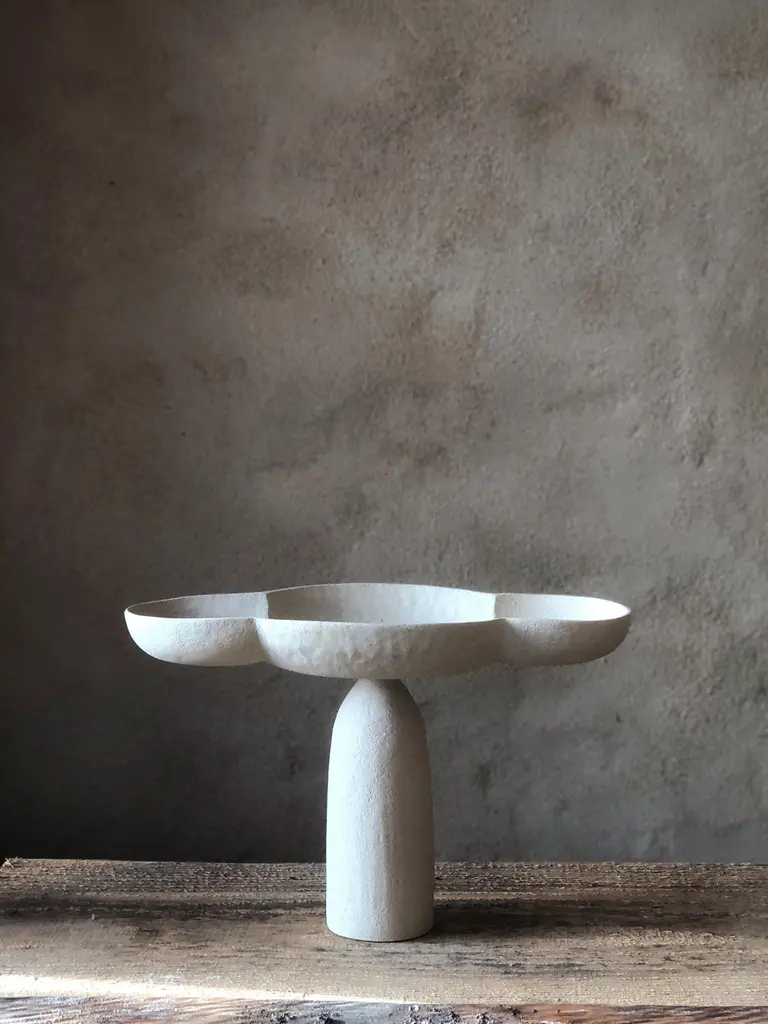 Bowl On Foot by Sophie VaidieOne Of A Kind.Dimensions: D 17 x W 34 x H 23 cm. Materials: Brutal beige stoneware with fine chamotte.In the beginning, there was a need to make, with the hands, the touch, the senses. Then came the desire to create and imagine objects to accompany everyday life through a timeless and poetic dimension.My relationship with clay began more than 20 years ago. It was a long inner journey before I imagined devoting myself completely to it.My work is first of all a constant search of balance and a capacity for renewal. It is the result of formal research, of the harmonious relationship between the curve and the line. The interaction between the shape and the space it draws around it. The right proportions, the detail of a curve or a line are the common threads of my creations.Then comes the technique. It allows me to inscribe the shape in the stoneware. My training was enriched with very different ceramists, allowing me to expand my knowledge and consciously choose my way of creation.My creativity is nourished by my travels, my inner reflections, my close landscape but also my work as an interior designer and most of all the encounters made throughout my journey.