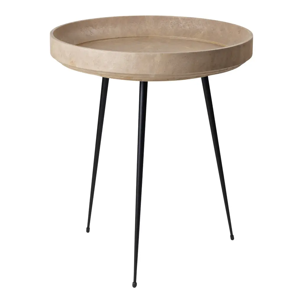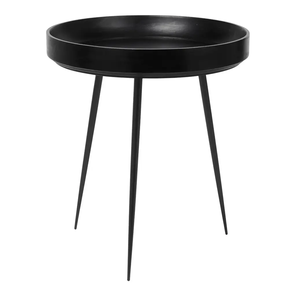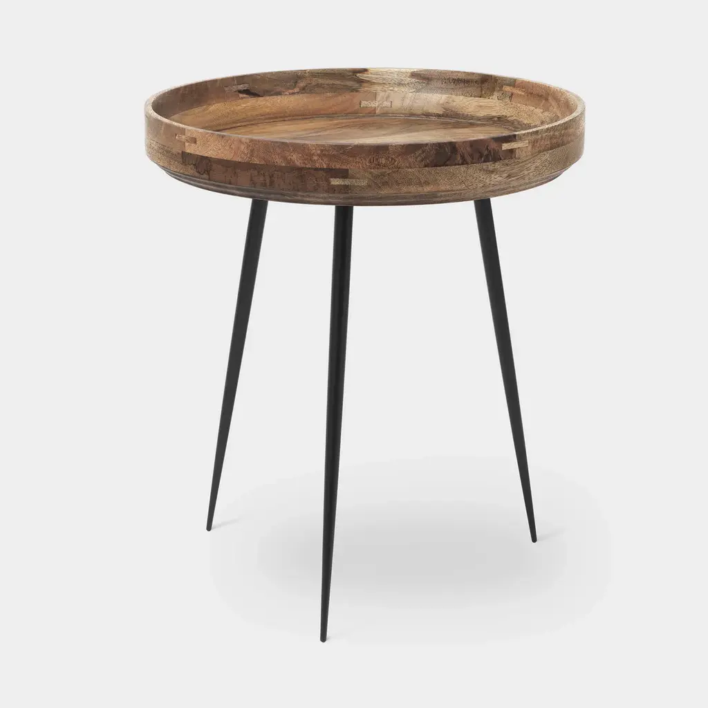 The Bowl Table has a top made from the wood of the mango fruit tree. Mango trees are grown and tended, and once the productive life of the tree is over, it is cut down and another one is planted. Incidentally, mango, as a fruit is widely consumed across the country hence the wood is plentiful. It is turned manually on the lathe, showcasing the skill of the "kharadi" or the woodturning community, thereby supporting local skills. The legs are made of mild steel, machined out of rods. The finishing is done with lead free water based PU lacquers, thereby respecting the local environment.
