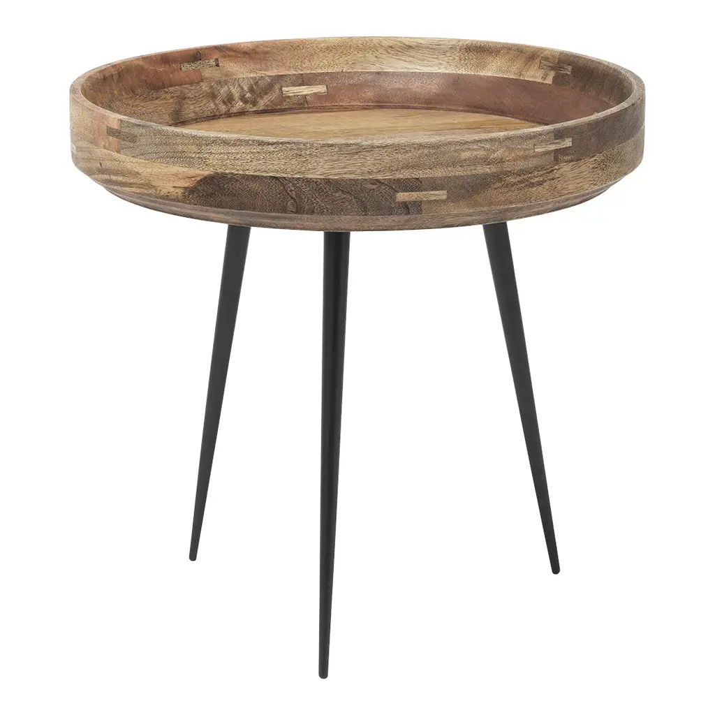 The Bowl Table has a top made from the wood of the mango fruit tree. Mango trees are grown and tended, and once the productive life of the tree is over, it is cut down and another one is planted. Incidentally, mango, as a fruit is widely consumed across the country hence the wood is plentiful. It is turned manually on the lathe, showcasing the skill of the "kharadi" or the woodturning community, thereby supporting local skills. The legs are made of mild steel, machined out of rods. The finishing is done with lead free water based PU lacquers, thereby respecting the local environment.