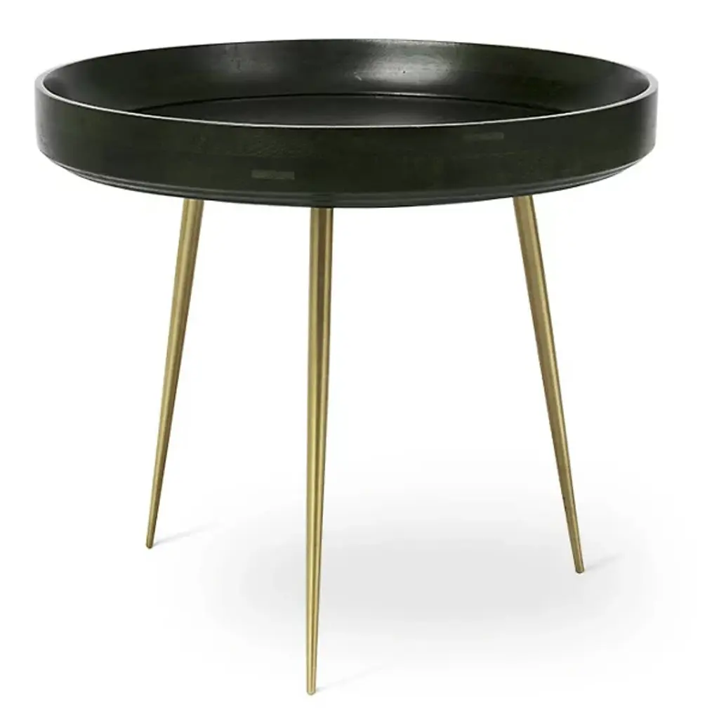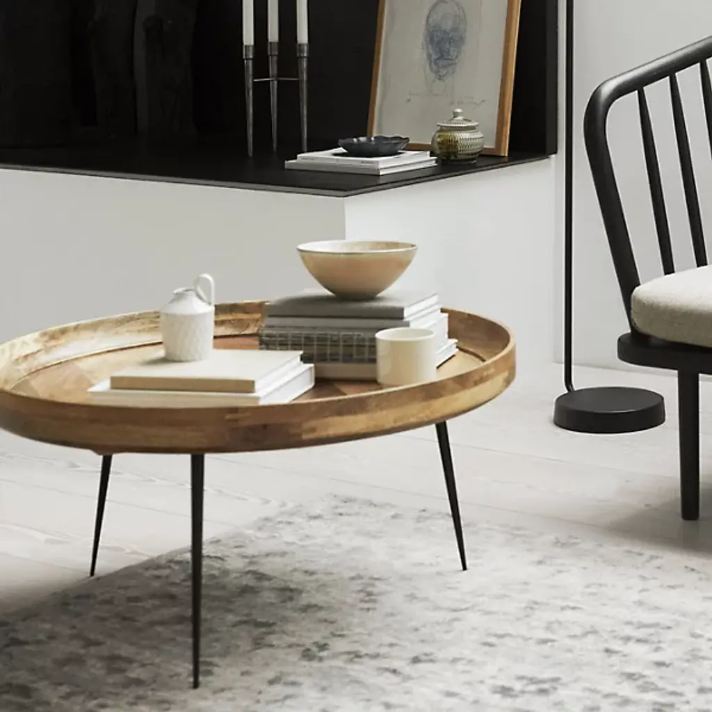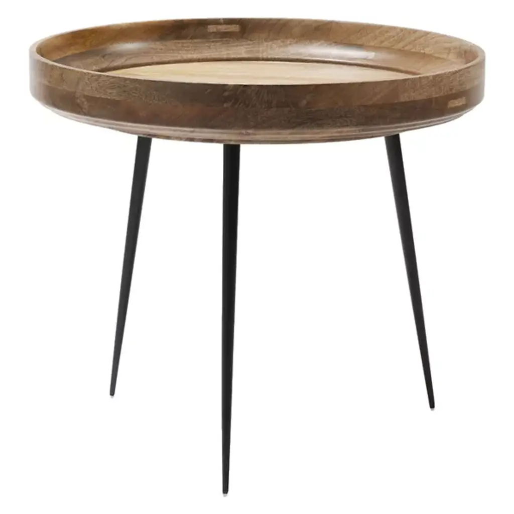 The Mater Bowl Table - Large is a simple Scandinavian design realized through the woodworking skills of the Kharadi community in India. Sustainably harvested mango wood is turned on a lathe to achieve the top's smooth bowl-shaped curves. Pointed metal rod legs support the top and add to the table's overall sense of craftsmanship.
