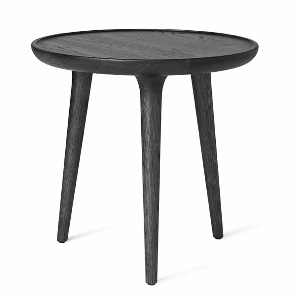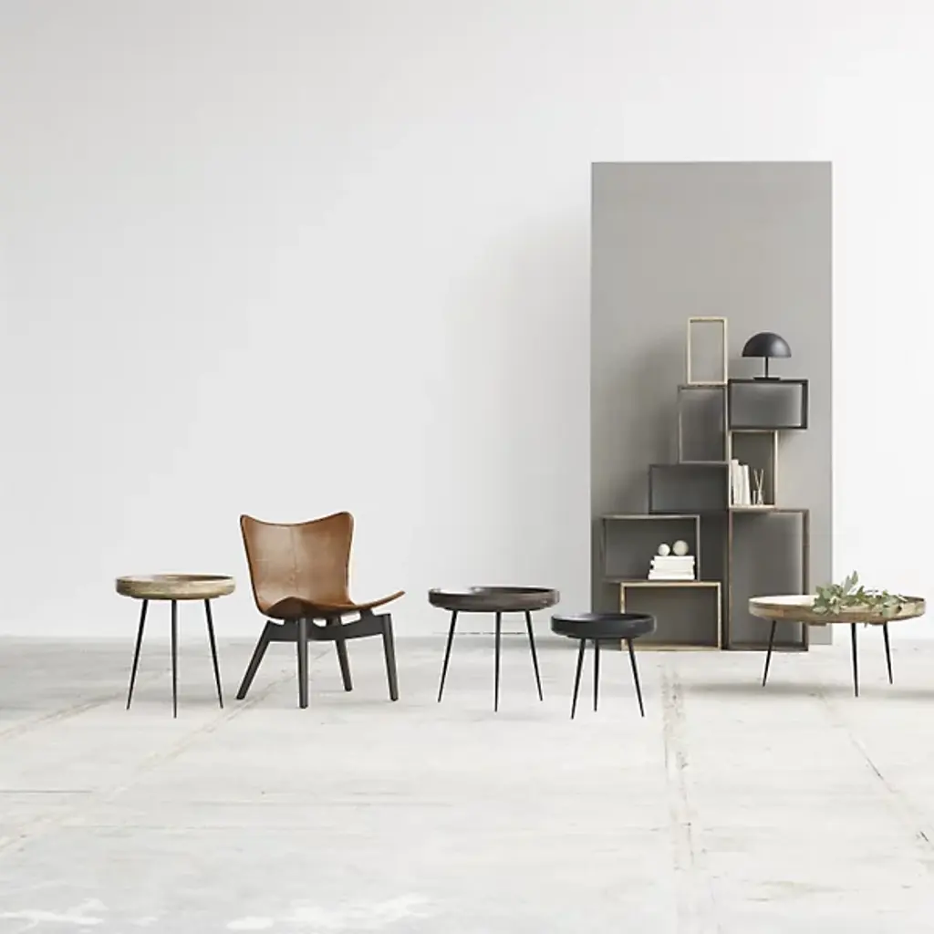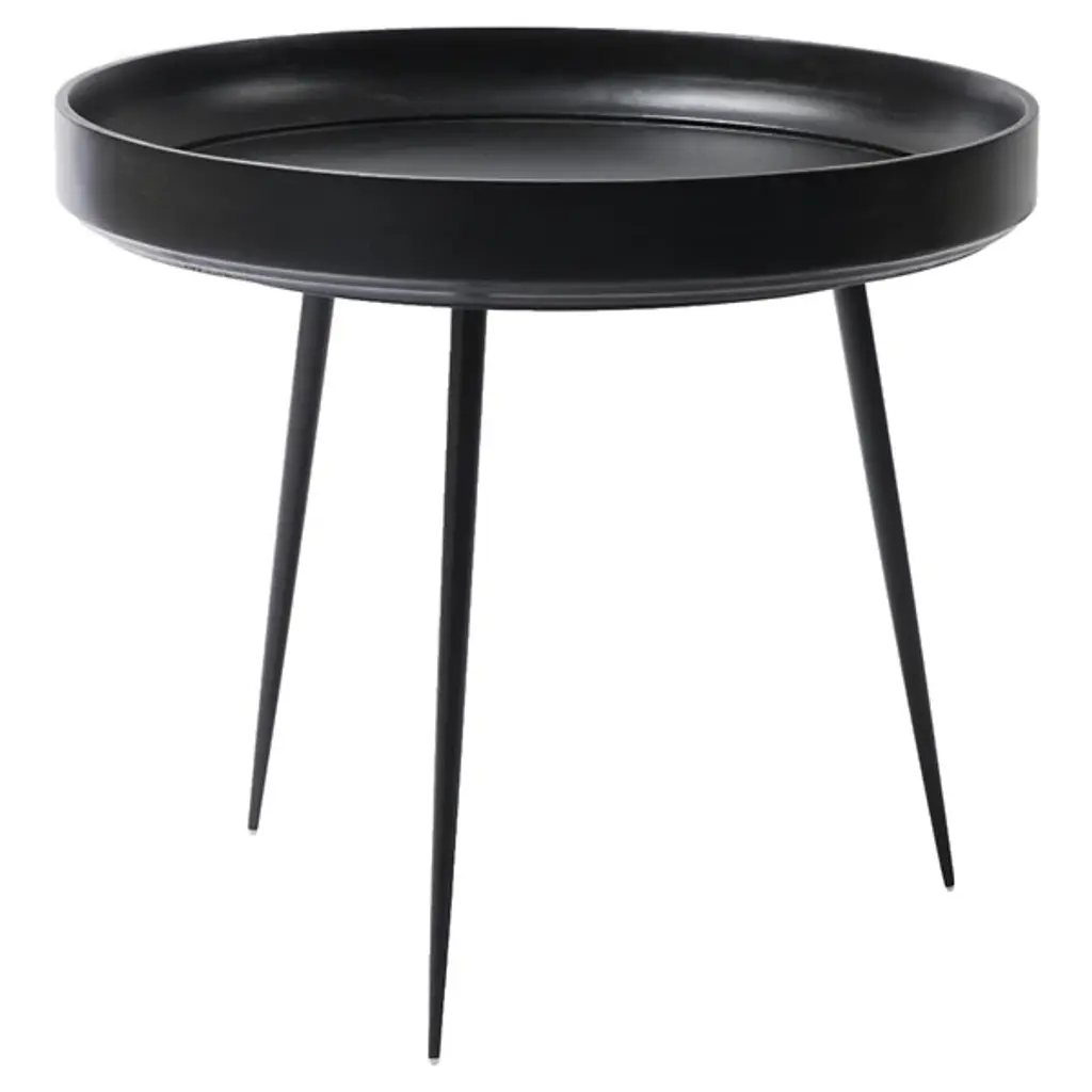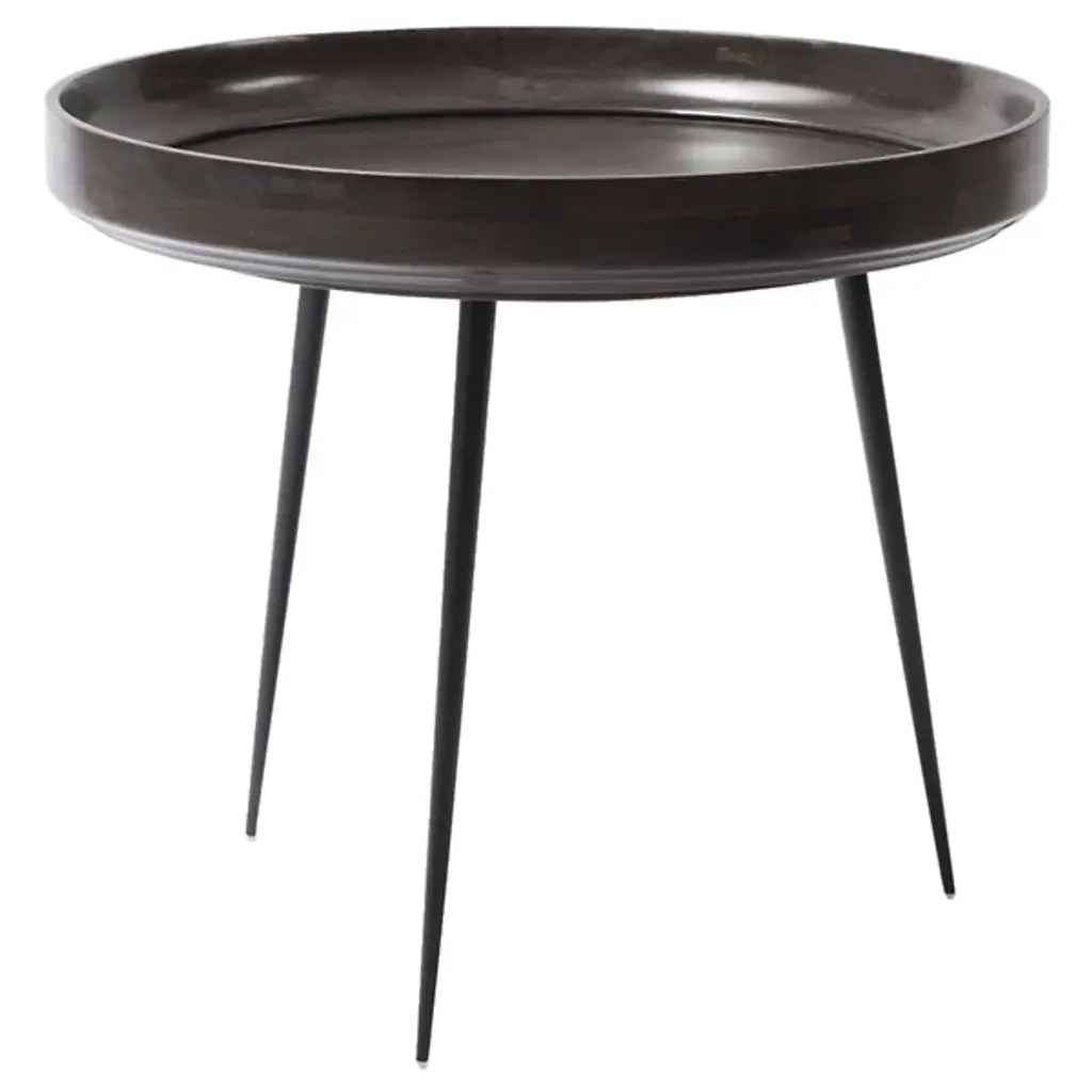 The Mater Bowl Table - Large is a simple Scandinavian design realized through the woodworking skills of the Kharadi community in India. Sustainably harvested mango wood is turned on a lathe to achieve the top's smooth bowl-shaped curves. Pointed metal rod legs support the top and add to the table's overall sense of craftsmanship.