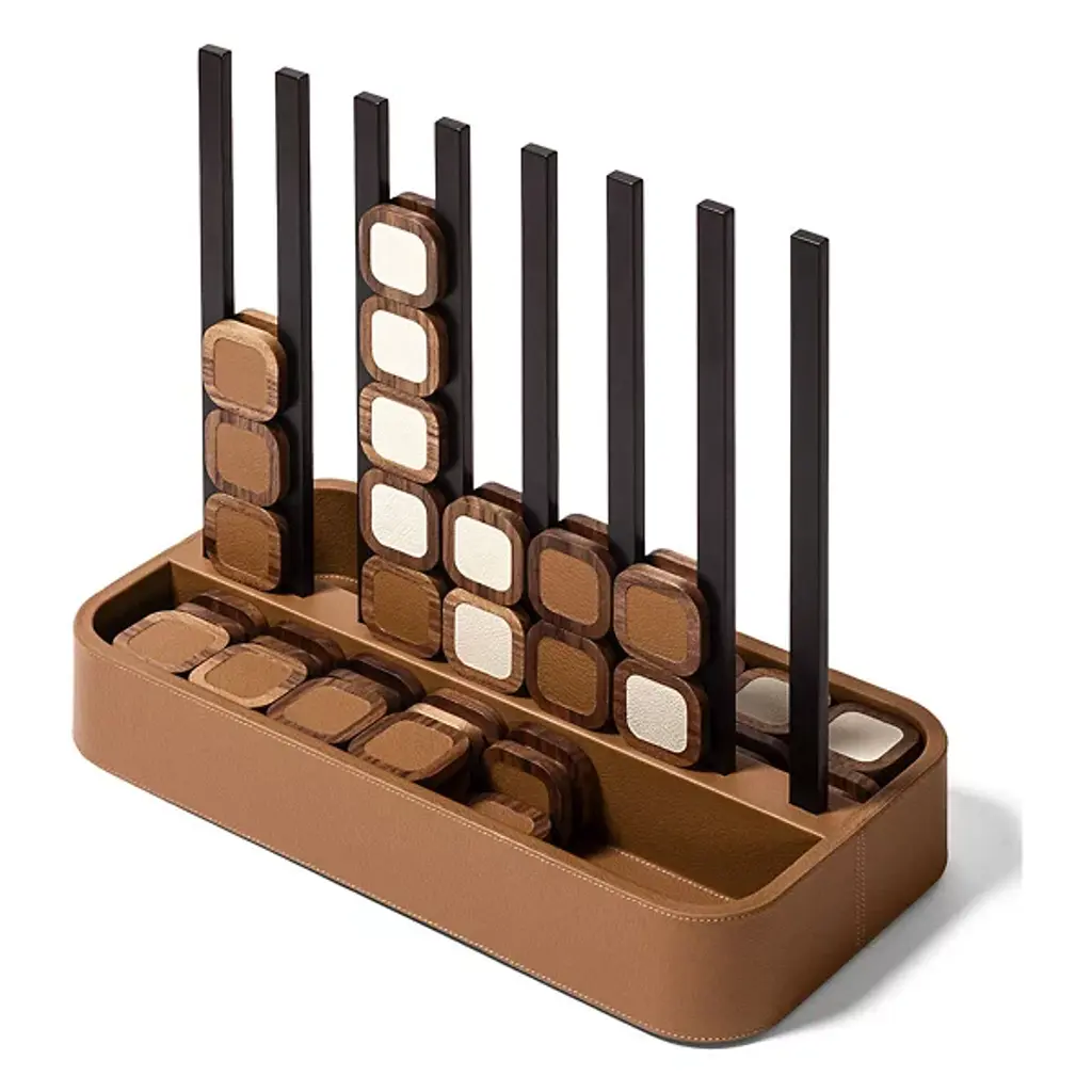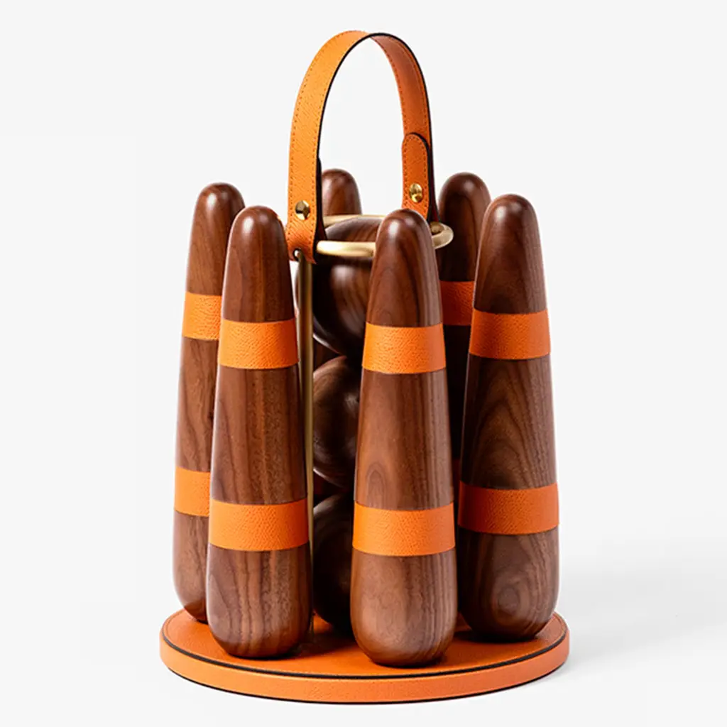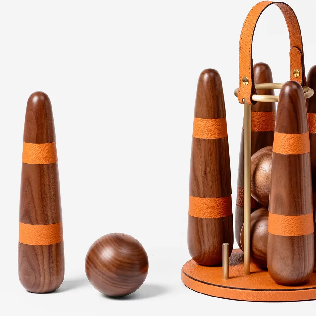 Handcrafted of Canaletto walnut, this portable bowling set includes three balls and six stylized pins with biscuit leather details. A sophisticated gift for any age, the set comes with a stylish holder with a leather handle for easy carrying, featuring a round base and satin brass central inserts. It is available in other colors and leathers.