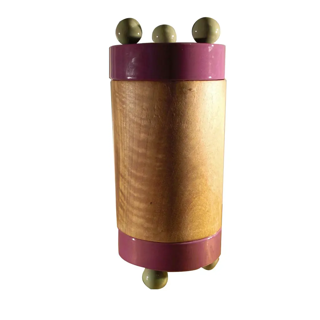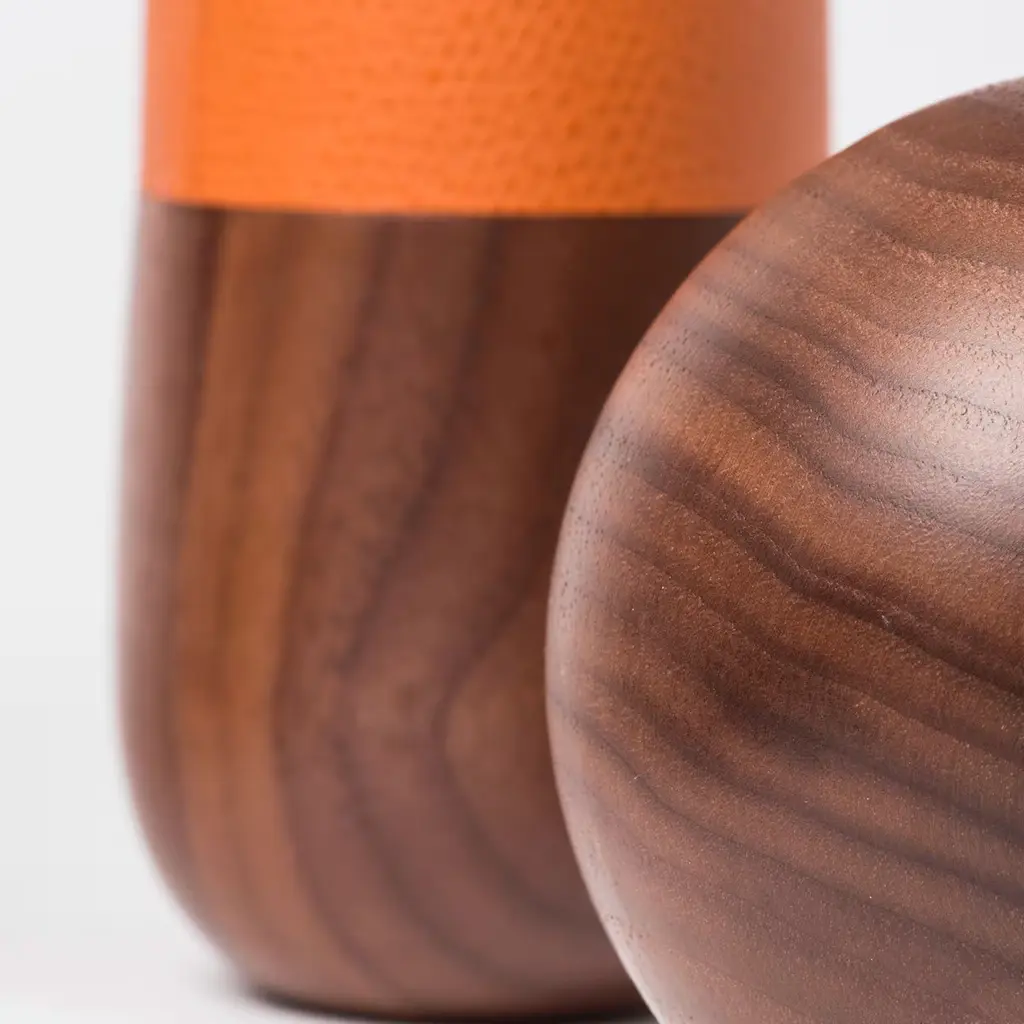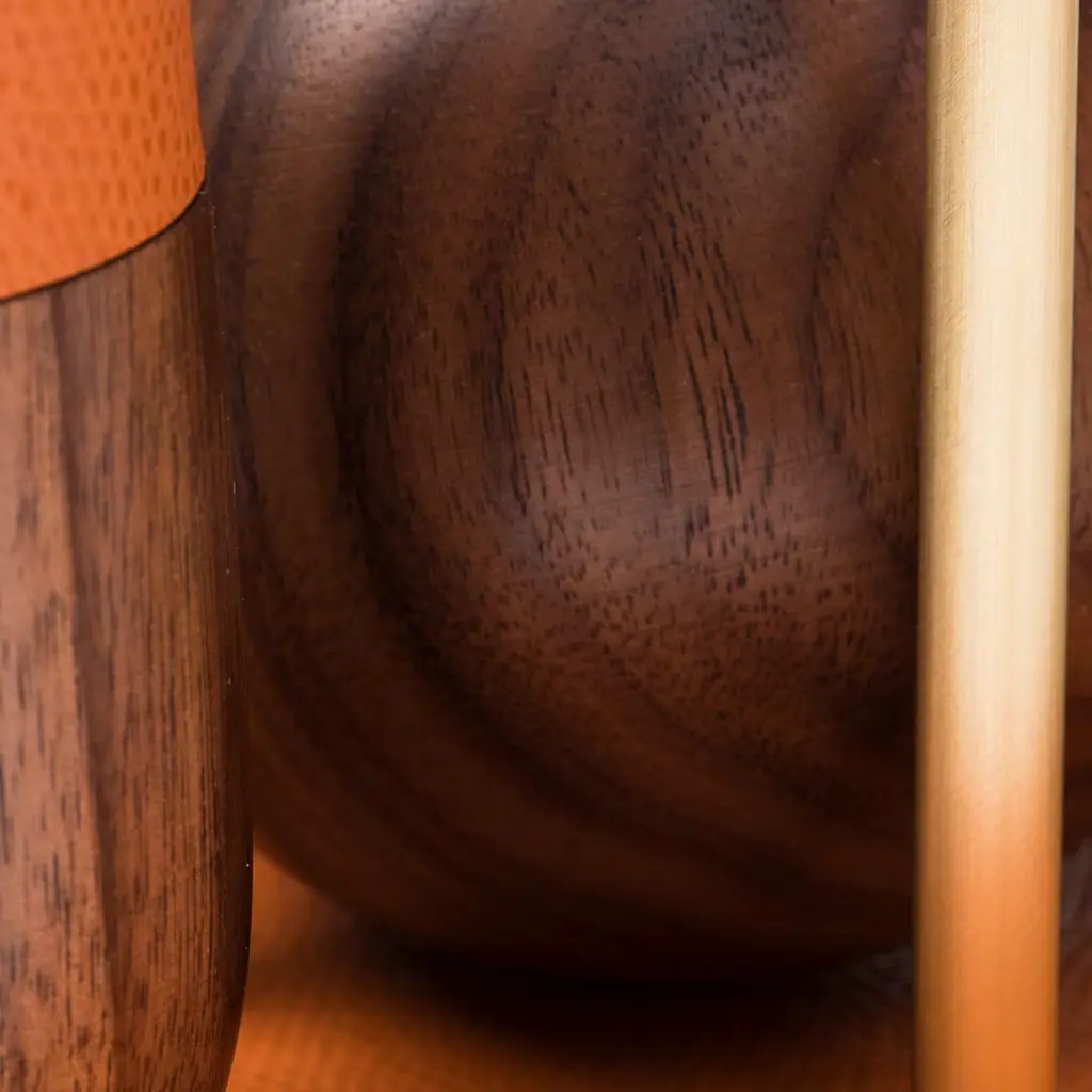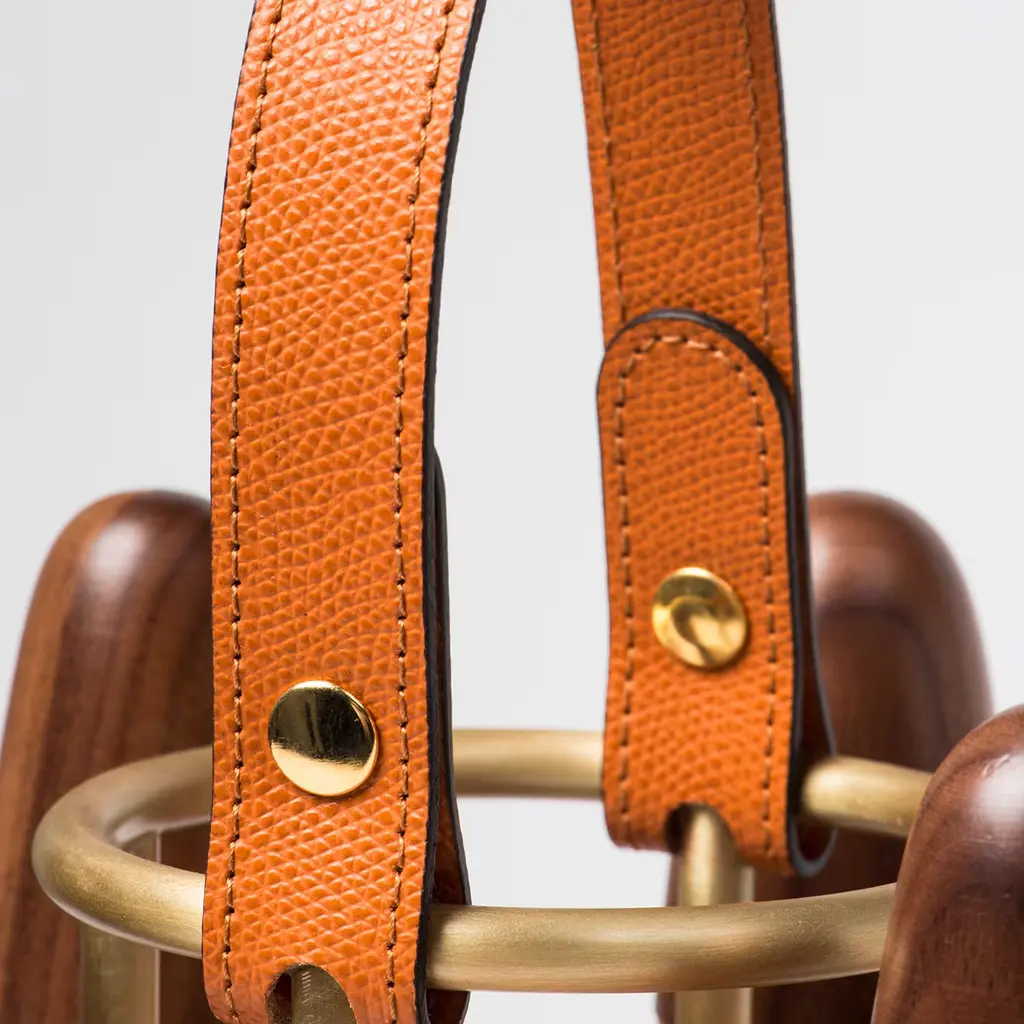 Handcrafted of Canaletto walnut, this portable bowling set includes three balls and six stylized pins with biscuit leather details. A sophisticated gift for any age, the set comes with a stylish holder with a leather handle for easy carrying, featuring a round base and satin brass central inserts. It is available in other colors and leathers.