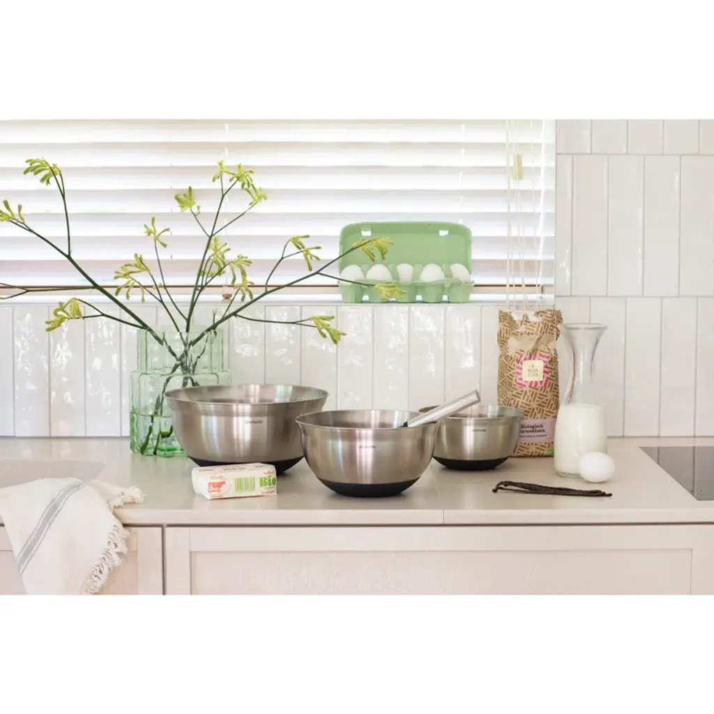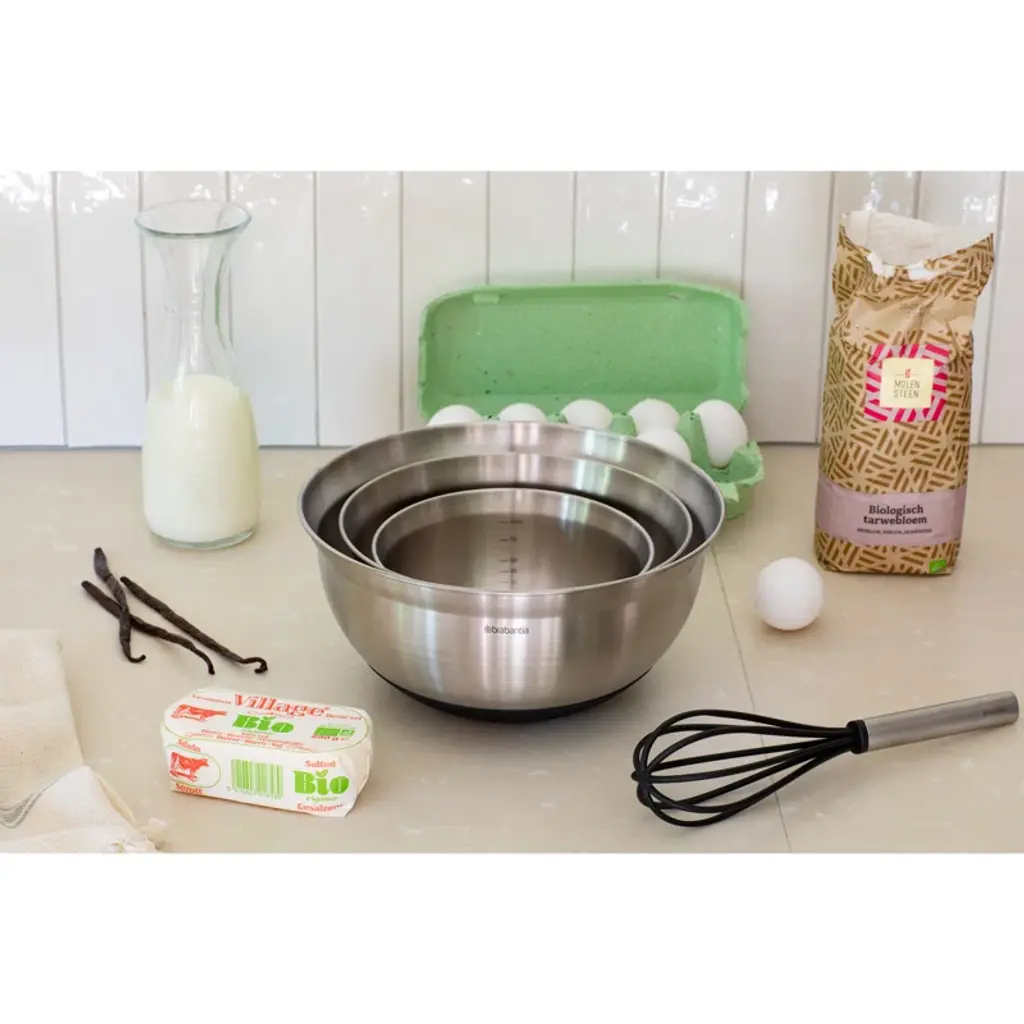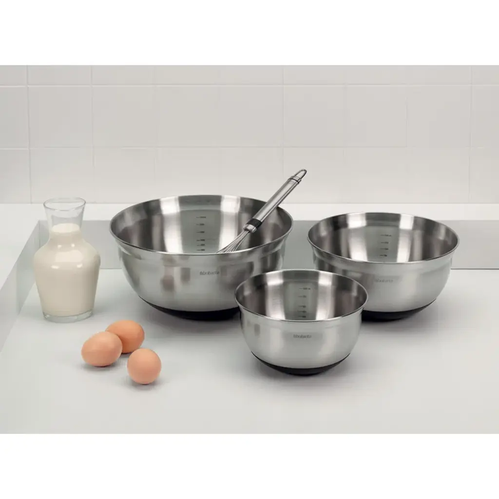 Completely happy when you can stir and mix? Stir up your style with the stainless steel Brabantia Profile Mixing Bowl set of three mixing bowls - 1.1 qt (1L), 1.7 qt (1.6L), and 3.2 qt (3L). The measurements on the inside make mixing ingredients easy, the outside stirs up your style. Their gently curved edge is designed to hold the bowl in the optimal stirring position, whilst the silicone base prevents slipping - all heat resistant up to 220ºC/448ºF. A real super set!