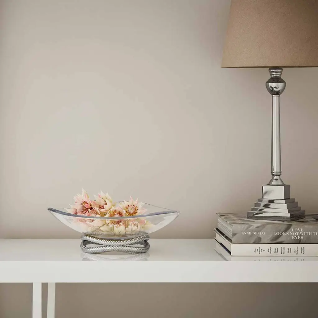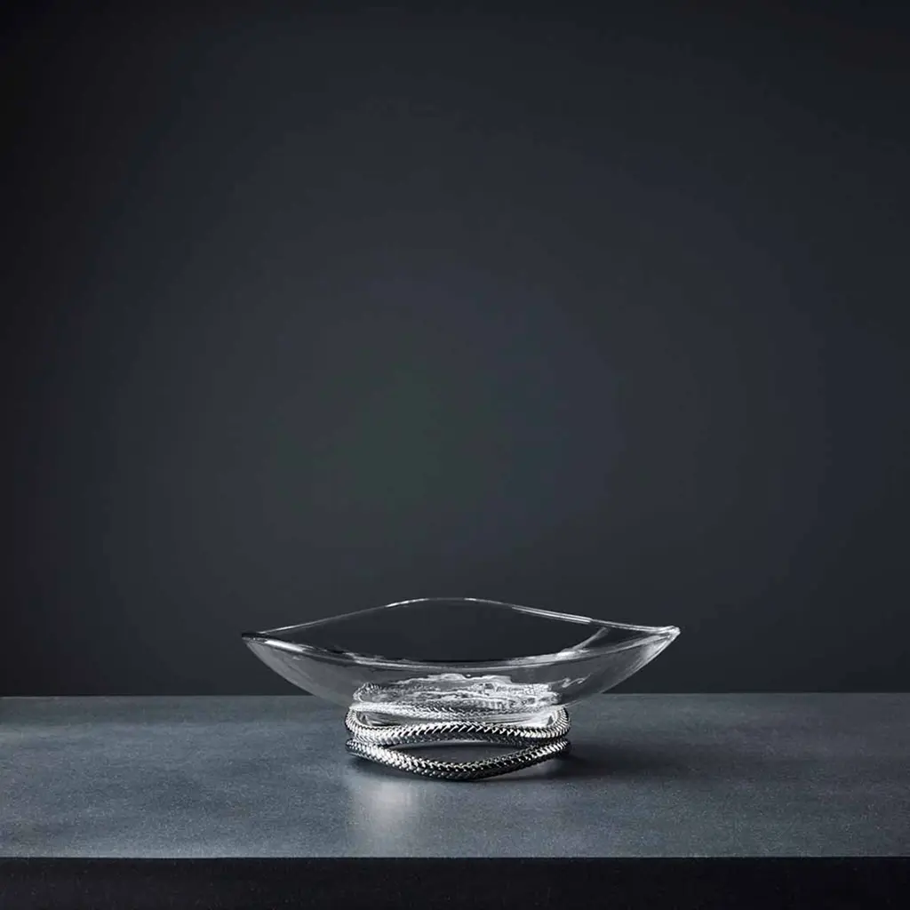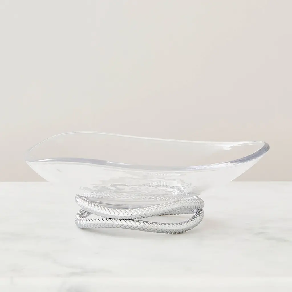 Artful coils formed of brightly gleaming chrome decorate this sculptural glass serving piece from Nambé.