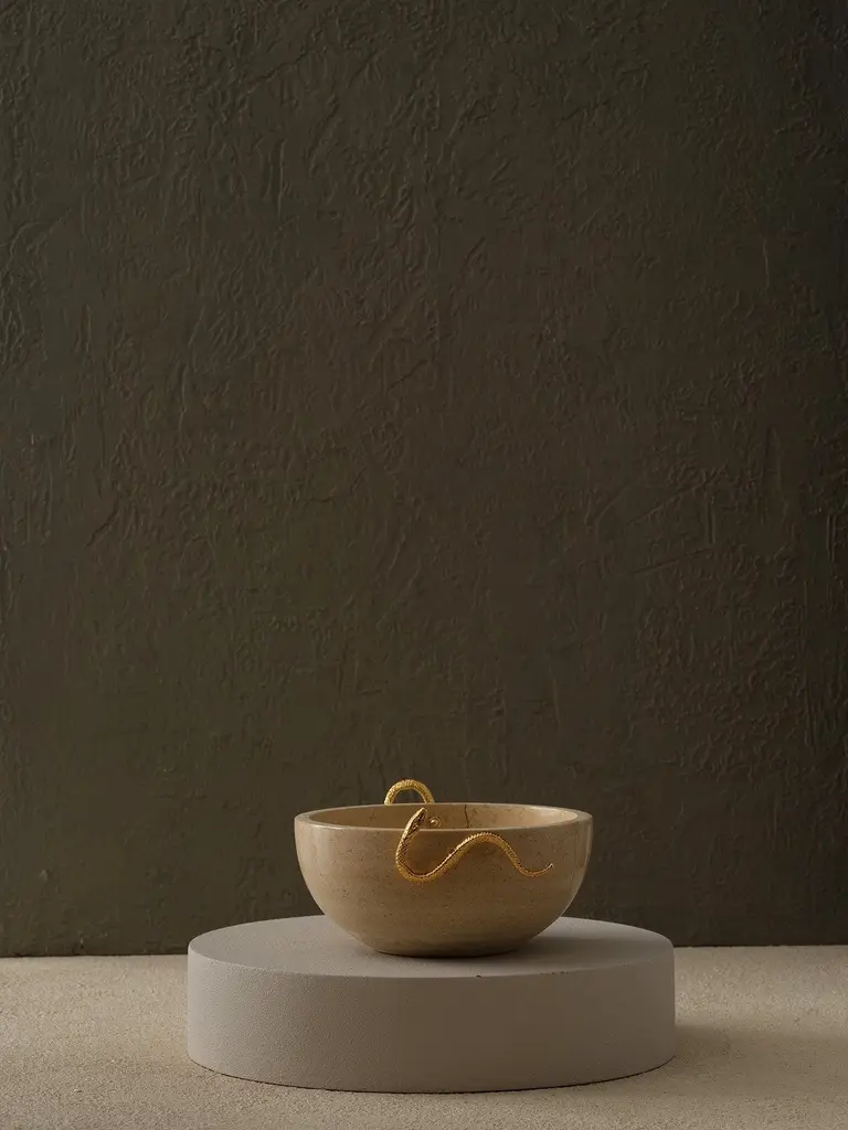 Striking and seductive, the Serpentine Marble Bowl With Brass Snake Detail channels ancient mysticism with a modern sculptural twist. Crafted from warm-toned natural marble, its smooth, rounded form provides an elegant canvas for the sinuous brass serpent that appears to slither over its rim. This handcrafted piece brings a sense of narrative and allure to any interior—whether styled as a centerpiece, a decorative catch-all, or an objet d'art. The snake, a symbol of transformation and wisdom, adds an element of the unexpected that commands attention.
