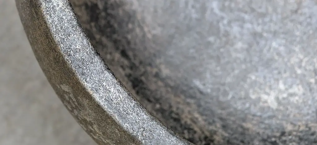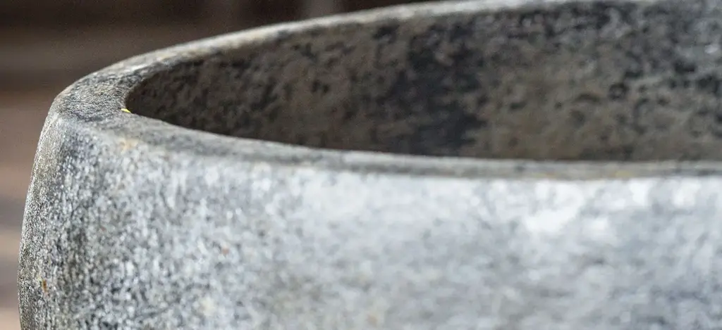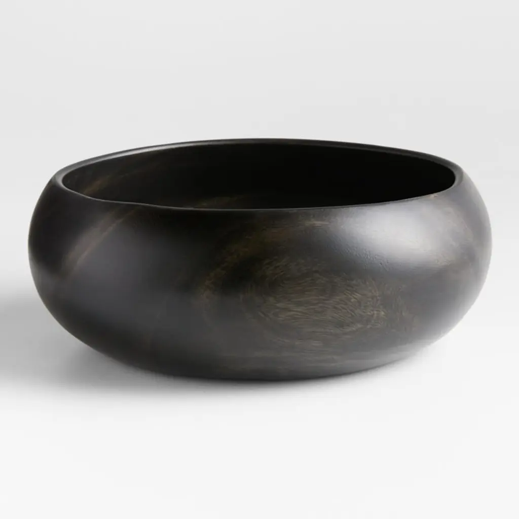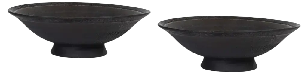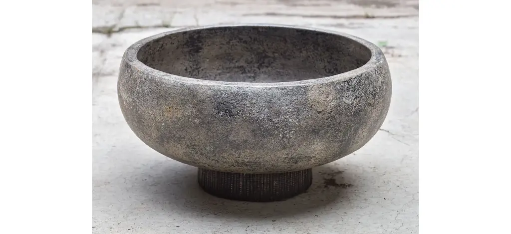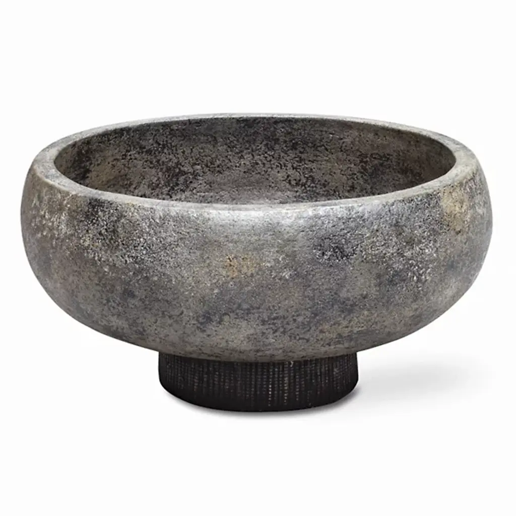 Terracotta bowl finished in an aged black with gold highlights and accented by a water hyacinth covered base.