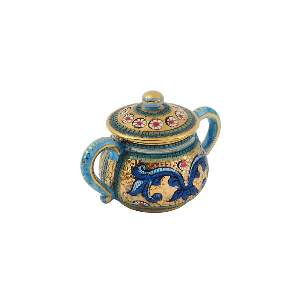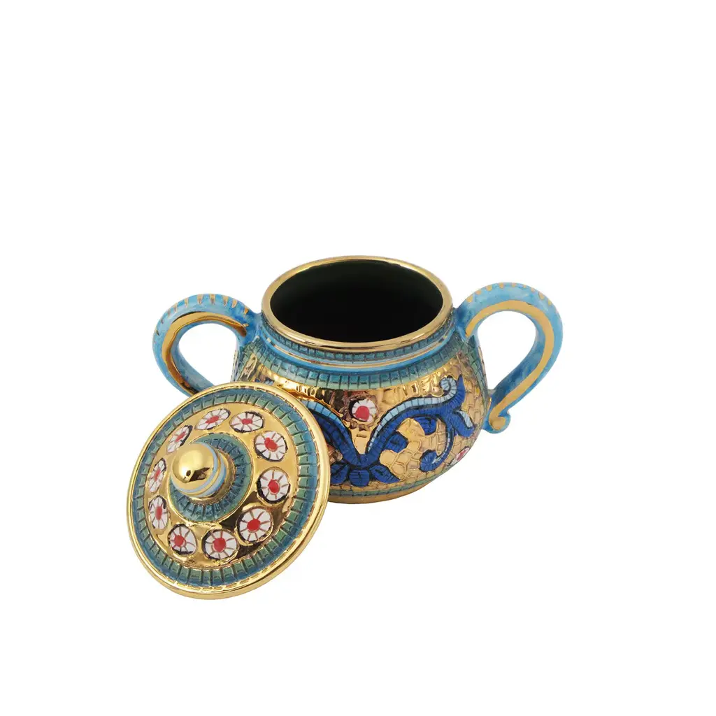 This refined sugar bowl will make a sophisticated addition to an afternoon tea. Showcasing a classic silhouette with sinuous handles and lid, it is handcrafted of ceramic using three different firings. Part of a Byzantine-inspired collection, it flaunts an elegant hand-engraved and hand-painted mosaic-like decoration, marked by blue hues and golden details.