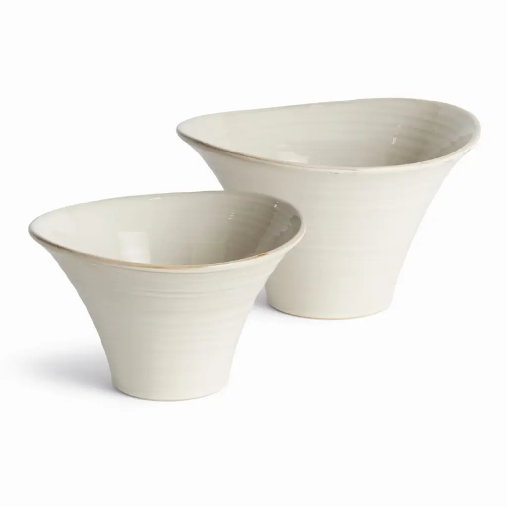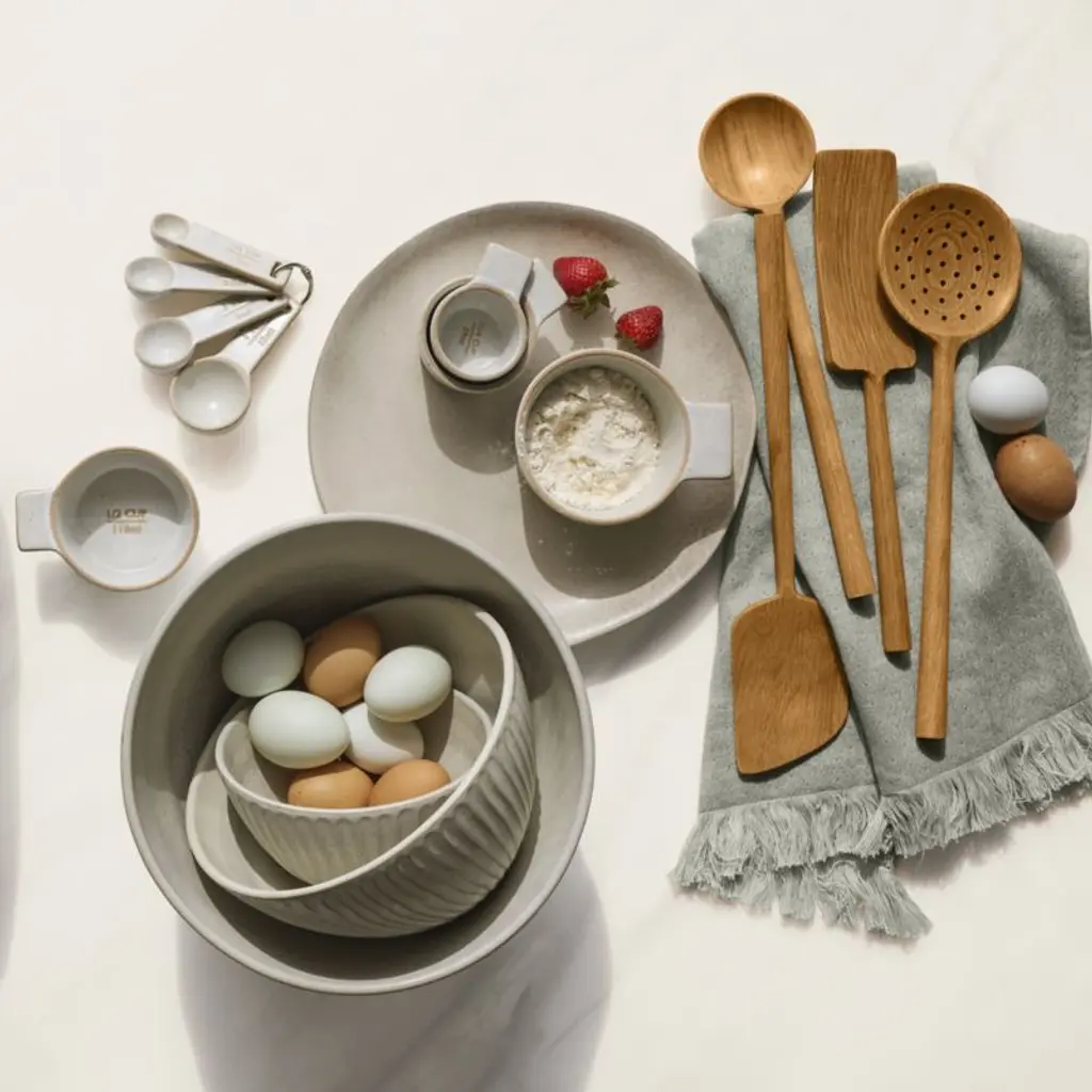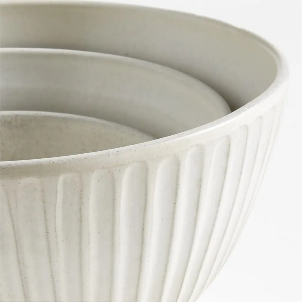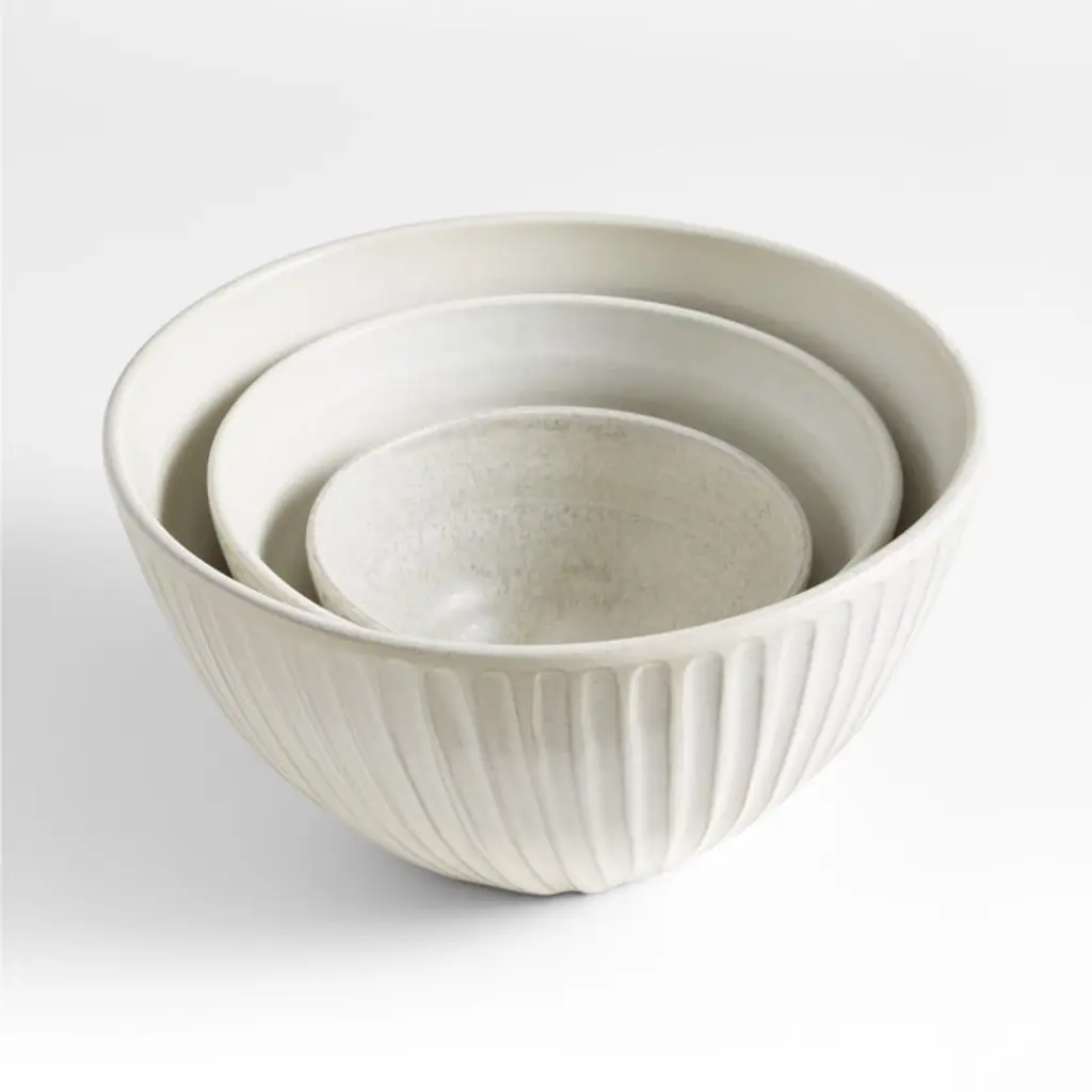 Relaxed ridges and unique speckles refresh the classic mixing bowl with artisanal charm. The three nesting bowls in this set are finished by hand with a cream-colored reactive glaze that creates unique constellations of tiny flecks. Textured with imperfectly shaped fluting that adds to Carmel's rustic chic appeal, the deep and roomy bowls are perfect for tossing salads, whipping egg whites or preparing bread dough.Laid-back vibes, effortless entertaining. We tapped chef and cookbook author Gaby Dalkin to create this exclusive collection of beautiful serving and kitchen essentials.