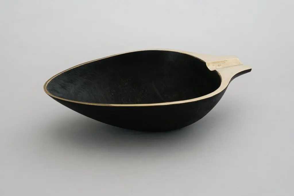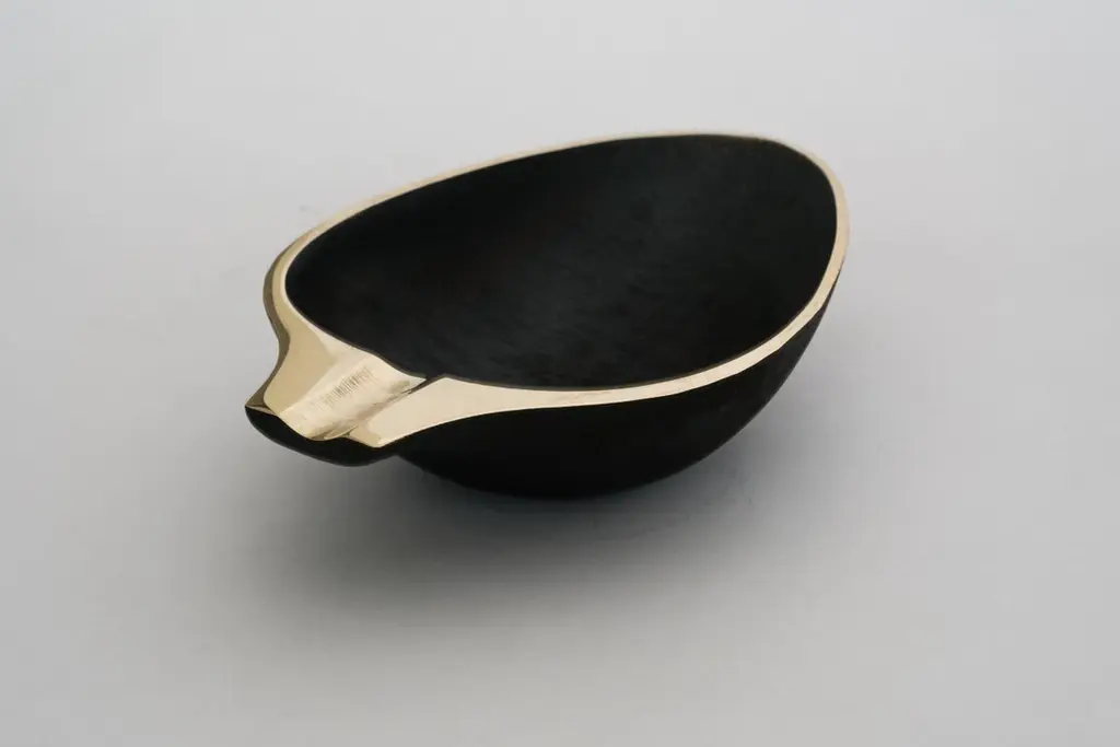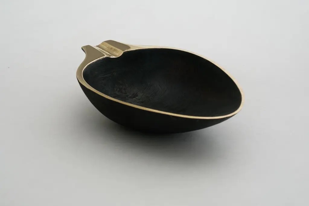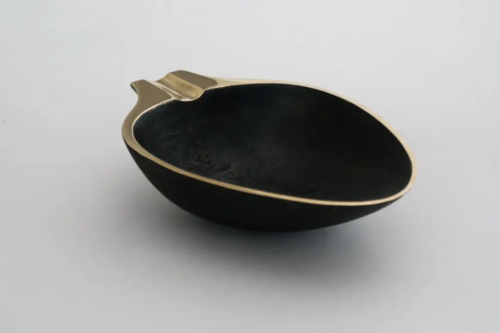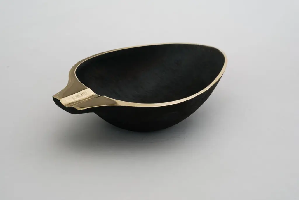 Carl Aubo¨ck Model #3548 patinated brass bowl. Designed in the 1950s, this incredibly refined and sculptural Viennese bowl is executed in polished and darkly patinated brass. Originally conceived as an ashtray, this decorative vessel can be used for a variety of purposes.Price is per item. One in stock ready to ship. Available in unlimited quantities. In-stock availability is subject to change at any time. Out of stock lead time 2-3 weeks or more. For time-sensitive orders, kindly inquire prior to purchasing.Produced by Carl Auböck IV in the original Auböck Werkstätte in the 7th district of Vienna using the same exacting standards, high-quality materials, original molds and techniques of his legendary grandfather. Auböck's design career was long and varied, reaching its pinnacle of prestige at the Triennale di Milano in 1954, where he received four gold medals in recognition of his iconic work.Please note that only one representative example of each item is shown in the images. Finish varies from item to item due to the handmade nature of their fabrication and due to the unique chemical patination process, which is meant to simulate 80-100 years of exposure of brass to sunlight.Made to order. All sales are final.