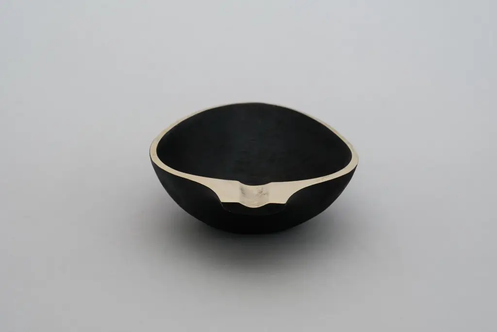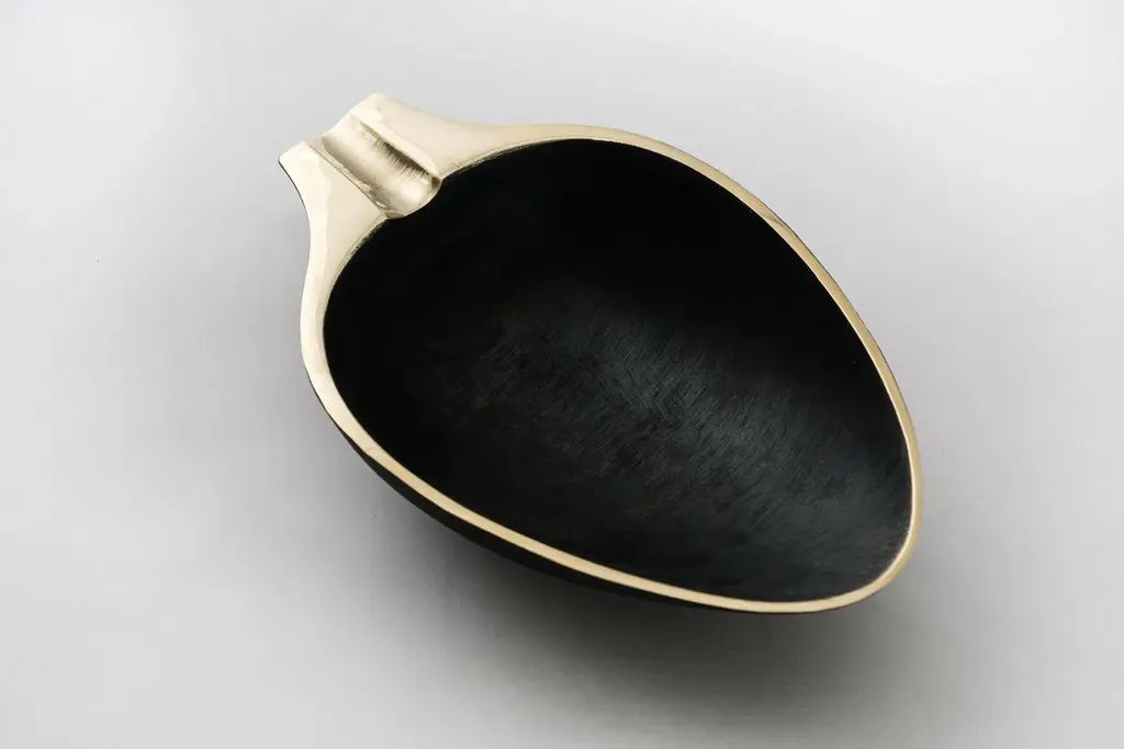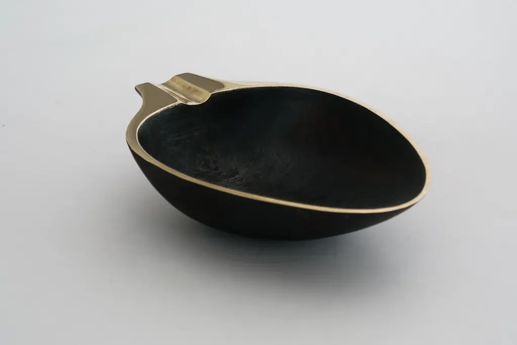 Carl Aubo¨ck Model #3548 patinated brass bowl. Designed in the 1950s, this incredibly refined and sculptural Viennese bowl is executed in polished and darkly patinated brass. Originally conceived as an ashtray, this decorative vessel can be used for a variety of purposes. Price is per item. One in stock ready to ship. Available in unlimited quantities. In-stock availability is subject to change at any time. Lead time 2-3 weeks or more. For time-sensitive orders, kindly inquire prior to purchasing. Produced by Carl Auböck IV in the original Auböck Werkstätte in the 7th district of Vienna using the same exacting standers, high-quality materials, original molds and techniques of his legendary grandfather. Auböck's design career was long and varied, reaching its pinnacle of prestige at the Triennale di Milano in 1954, where he received four gold medals in recognition of his iconic work. Please note that only one representative example of each item is shown in the images. Finish varies from item to item due to the handmade nature of their fabrication and due to the unique chemical patination process, which is meant to simulate 80-100 years of exposure of brass to sunlight. Made to order.