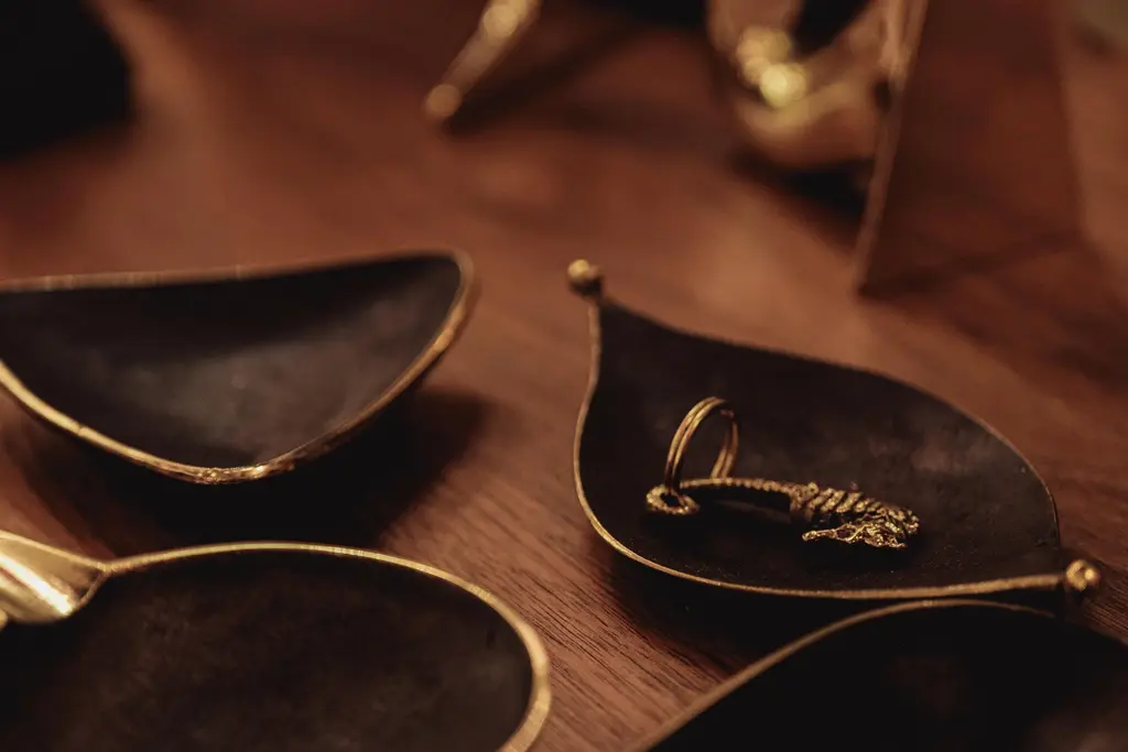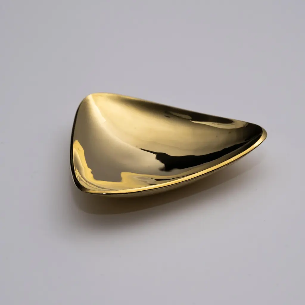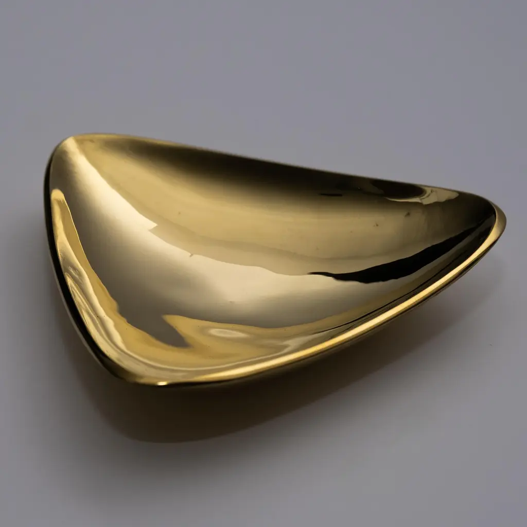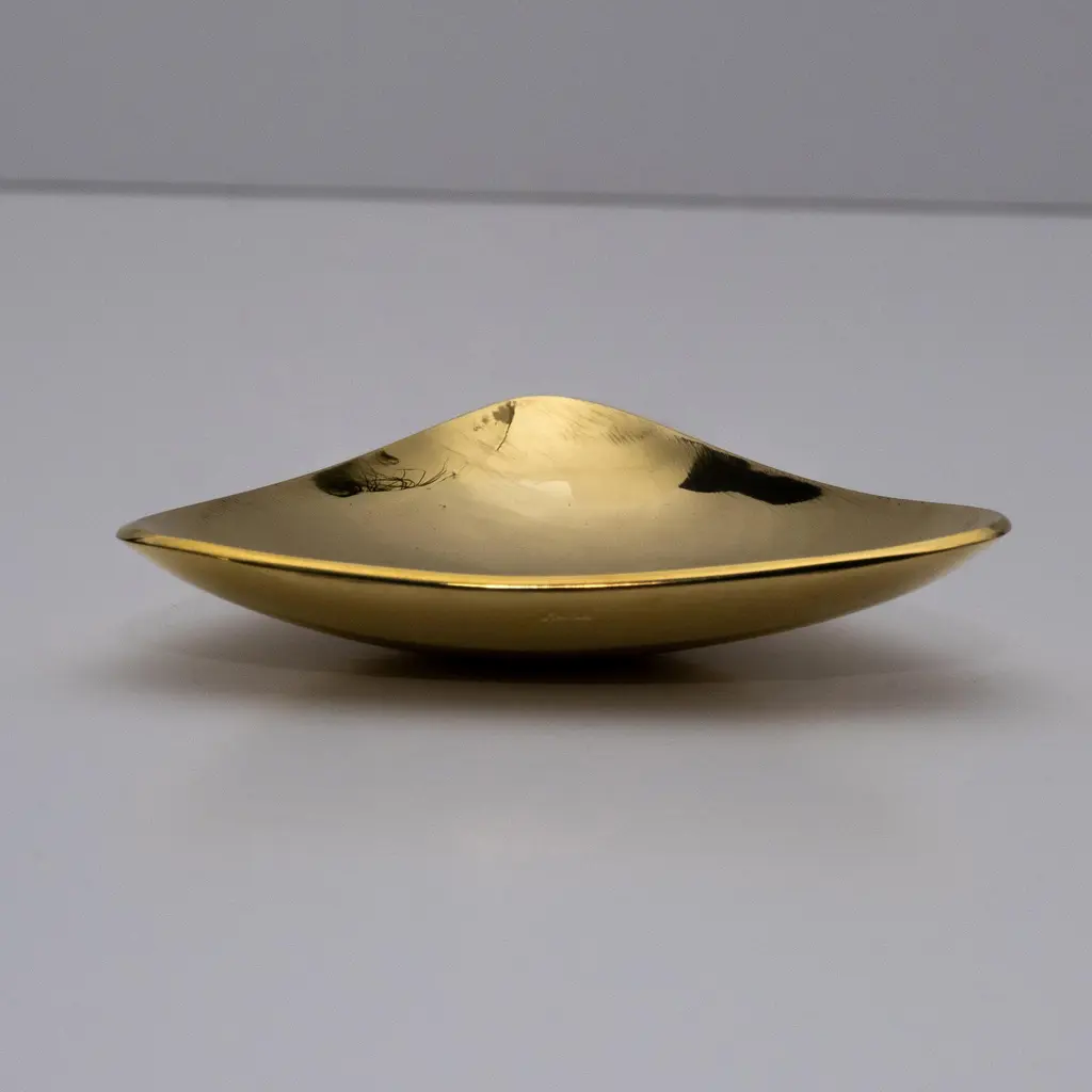 Carl Auböck Model #3844 brass bowl. Designed in the 1950s, this incredibly refined and sculptural Viennese bowl is executed in polished and darkly patinated brass. Originally conceived as an ashtray, this decorative catch-all can be used for a variety of purposes. Price is per item. Available in unlimited quantities in patinated or polished brass. Please specify when ordering. Produced by Carl Auböck IV in the original Auböck Werkstätte in the 7th district of Vienna using the same exacting standards, high-quality materials, original molds, and techniques of his legendary grandfather. Auböck's design career was long and varied, reaching its pinnacle of prestige at the Triennale di Milano in 1954, where he received four gold medals in recognition of his iconic work. One of each finish in stock and ready to ship. Out of stock lead time up to an additional 2-3 weeks or more. Please note that inventory can change at any time. For time-sensitive orders, please inquire prior to purchasing. Please note that only one representative example of each item is shown in the images. Finish varies from item to item due to the handmade nature of their fabrication and due to the unique chemical patination process, which is meant to simulate 80-100 years of exposure of brass to sunlight. Made to order.