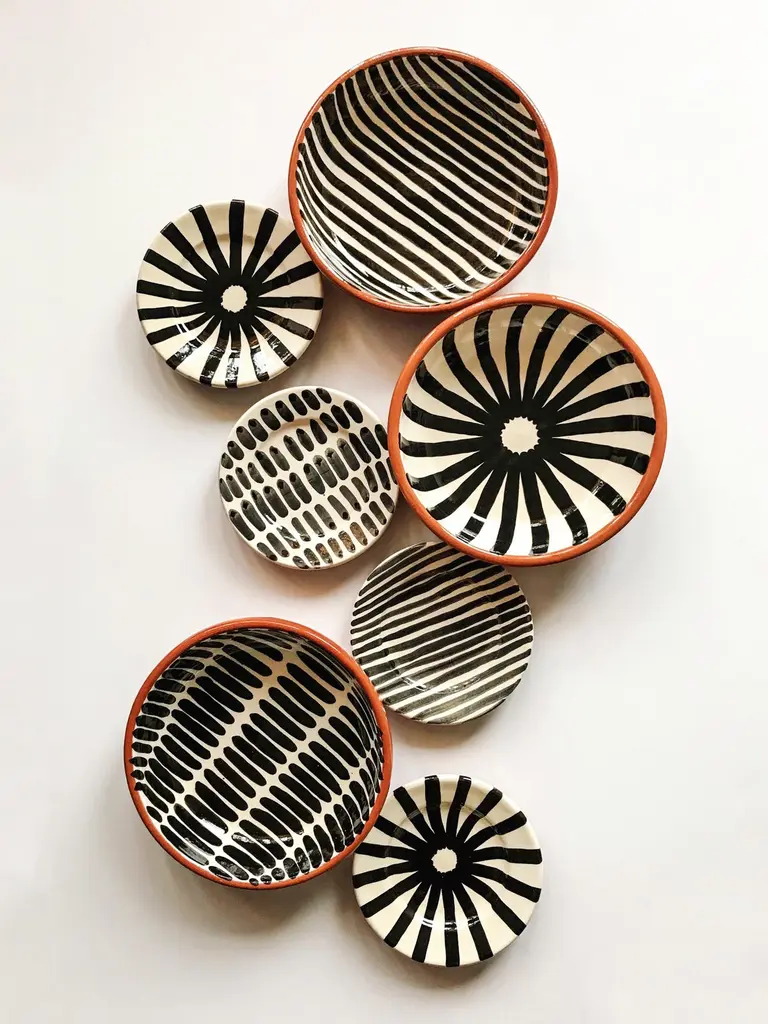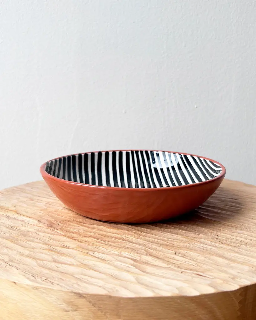 Stripe pattern black and white terracotta plates and bowls.Handmade and hand painted ceramics from Southern Portugal, these beautiful pieces for your table will add a modern and graphic touch and are perfect to mix and match. The Dash pattern is available in the following sizes:Bowl size: 6.75" diameter x 1.4" highStripe saucer and stripe mini bowls also availble.Care Instructions:Prior to first use, piece should be washed by hand in hot soapy water, well rinsed and allowed to air dry. To maintain the integrity of the pieces, dishwasher use is not recommended. The base of jugs, mugs and vases may initially sweat -this is normal and will decrease over time.About the Potter:Rui's family has been in the pottery business for over 200 years, and we're proud to continue that tradition with him on all of our terracotta ware. Just about every piece we sell is thrown by Rui on the potter's wheel (he started in the family business when he was 8), and is then painted by his aunt Regina.