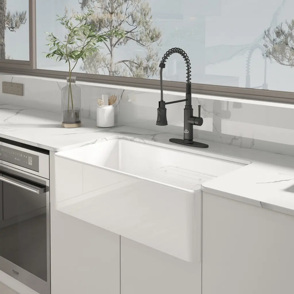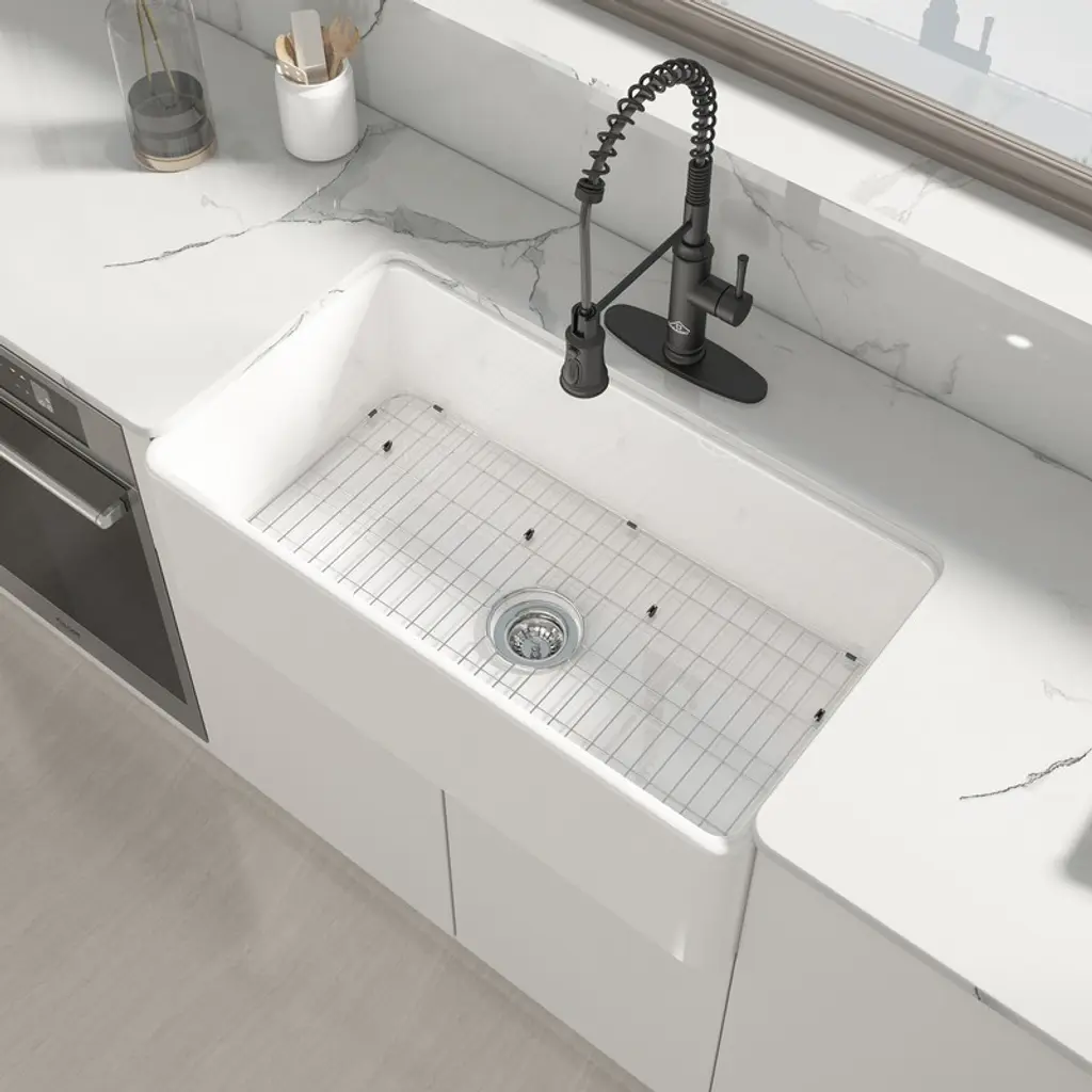 CASAINC fireclay sinks is kiln-fired at high temperatures of 2200°F and features solid core construction that makes it highly resistant to impact and thermal shock. At the same time, using advanced glazing technology to create a durable non-porous finish.