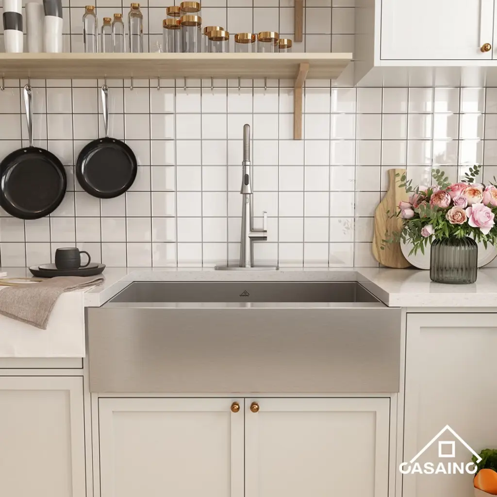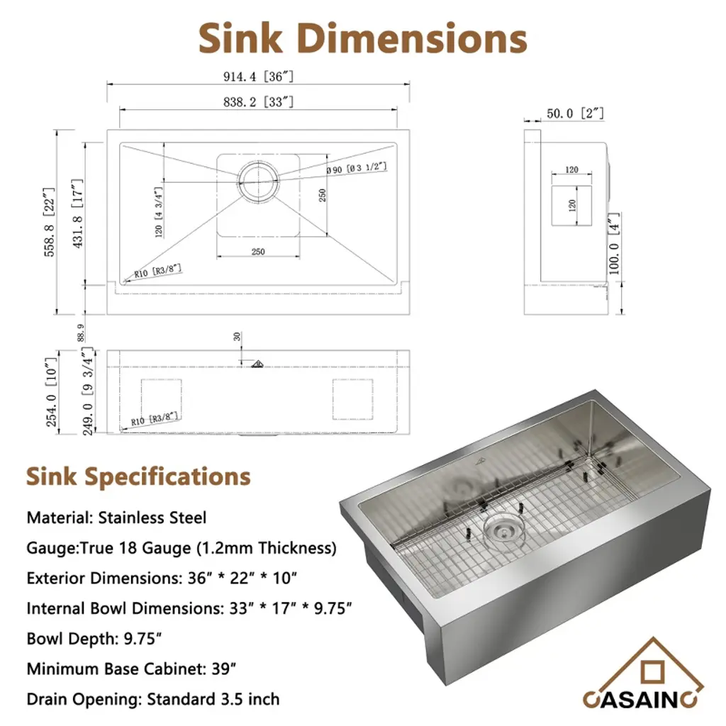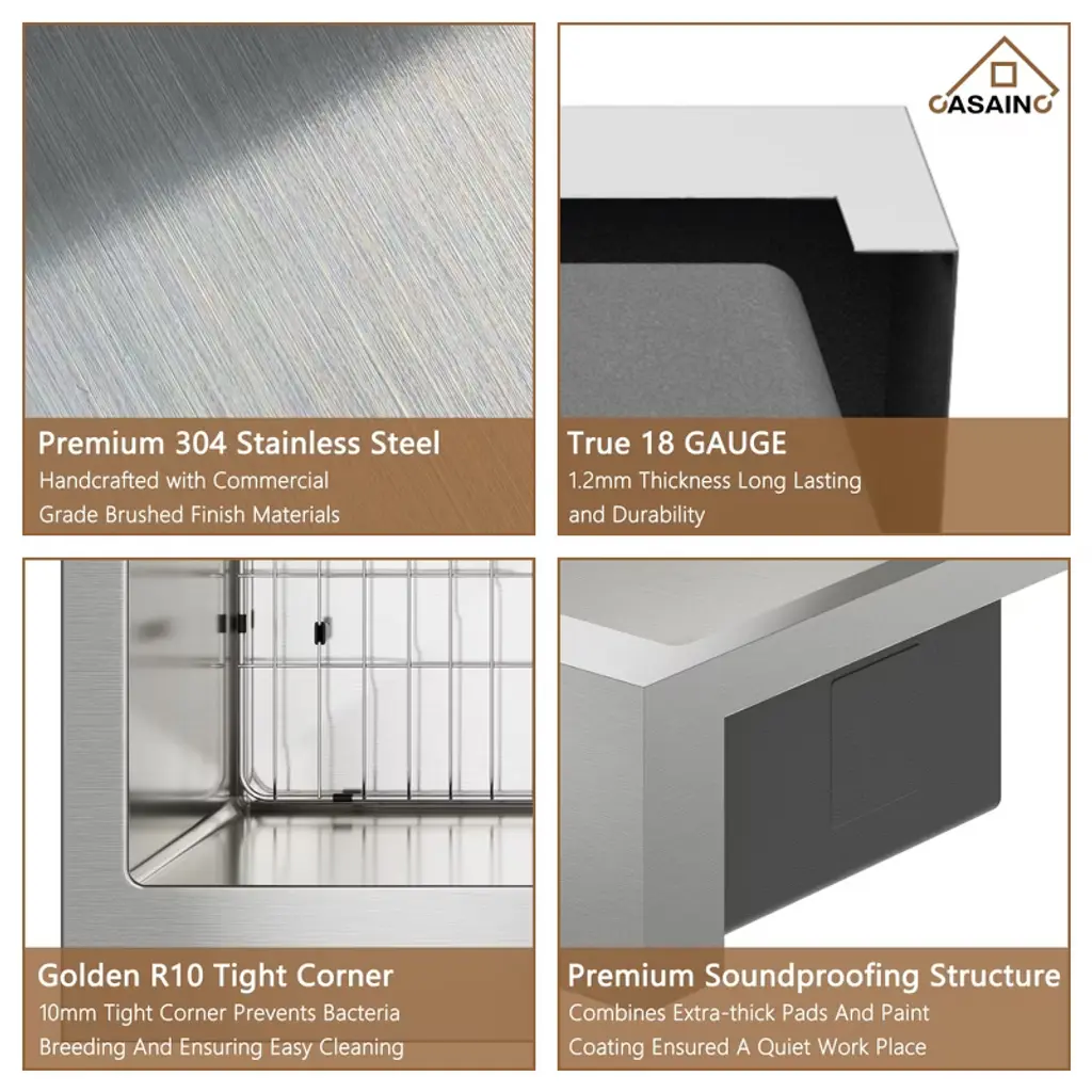 Upgrade your kitchen with this premium-quality stainless steel kitchen sink. Designed for modern homes and busy kitchens, this sink offers exceptional durability, versatility, and style. Introducing our All-in-One Stainless Steel Kitchen Sink, meticulously crafted from premium 304 stainless steel. With a precise 10mm radius, this sink showcases impeccably smooth and seamless corners. The intelligently designed X-shaped drainage lines, paired with a rear drainage hole, not only simplify cleaning but also guide water flow efficiently, eliminating the risk of kitchen waste and residual water accumulation in corners. Bid farewell to bacteria breeding grounds and sink corrosion. Elevate your kitchen with the epitome of functionality and hygiene – our Stainless Steel Sink. Specification: Minimum Cabinet Size: 39 in. Mount Type: Farmhouse/Apron-Front Number of Bowls : Single Bowl Number of Faucet Holes: 0 Sink Gauge: 18 Gauge Sink Finish Type: Brushed Sink Material: Stainless Steel Sink Shape: Rectangular