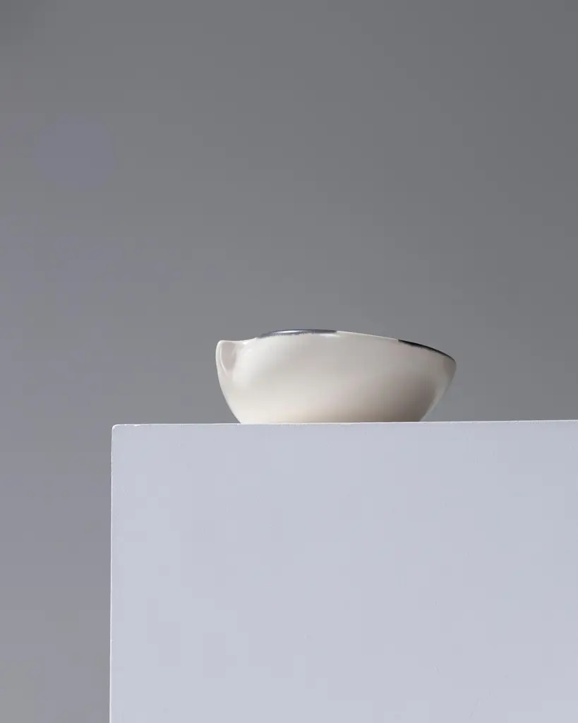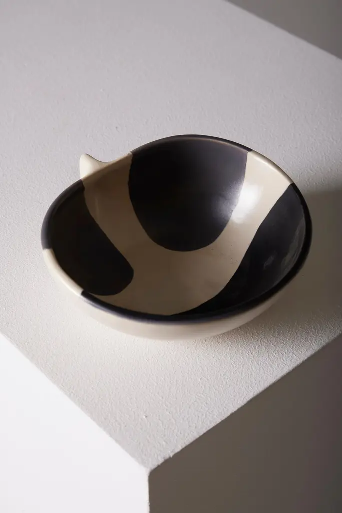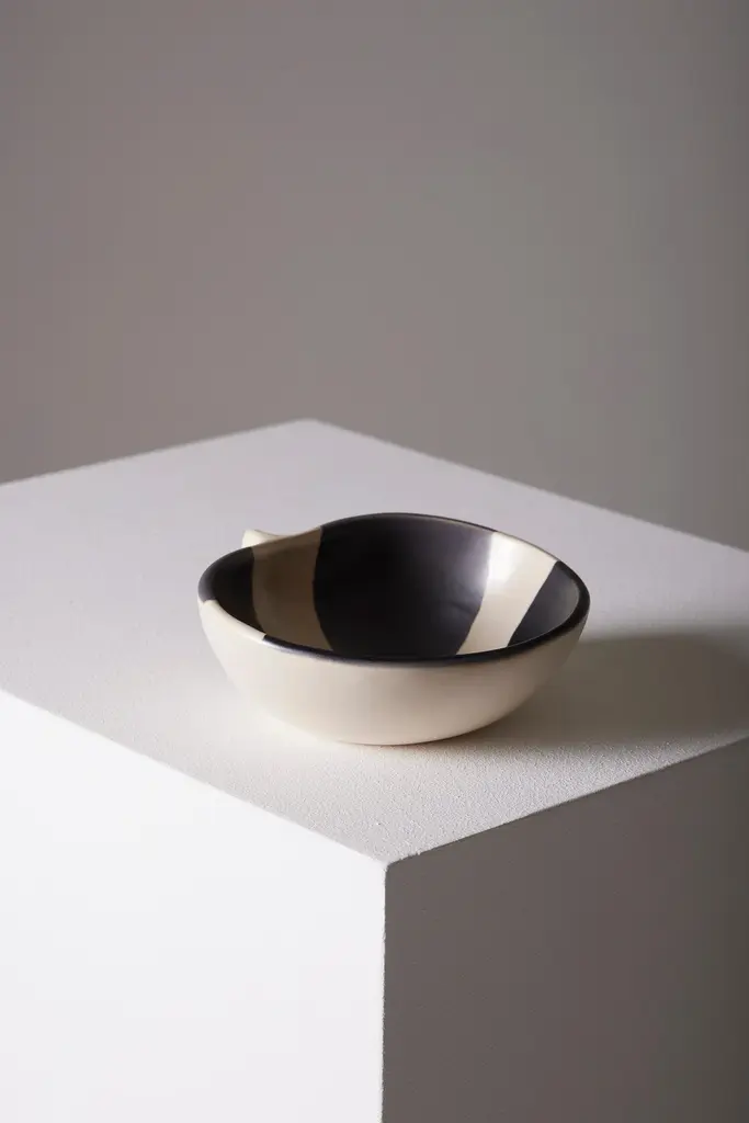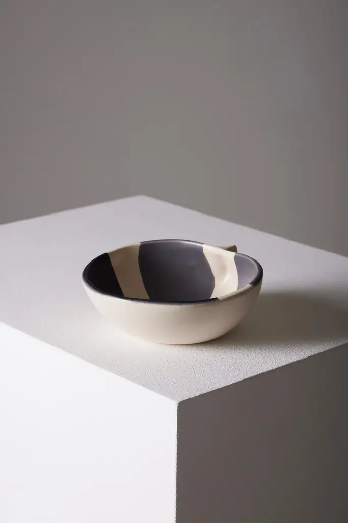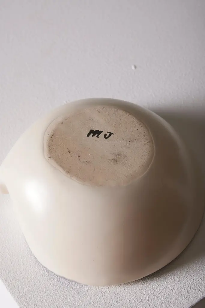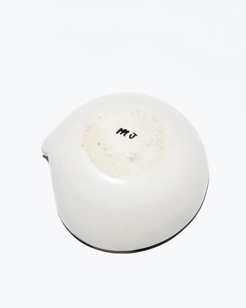 Small pinched ceramic bowl by French artist Mado Jolain (1921–2019), dating from the 1950s and signed "MJ" on the underside. A renowned ceramicist and designer, Mado Jolain was celebrated for her creations that blended aesthetics and functionality, particularly during the 1950s and 1960s. After studying at the École des Beaux-Arts in Paris, she collaborated with haute couture houses by designing fashion accessories. This piece, in excellent condition, is a testament to her talent and creative spirit.DV665-DV668