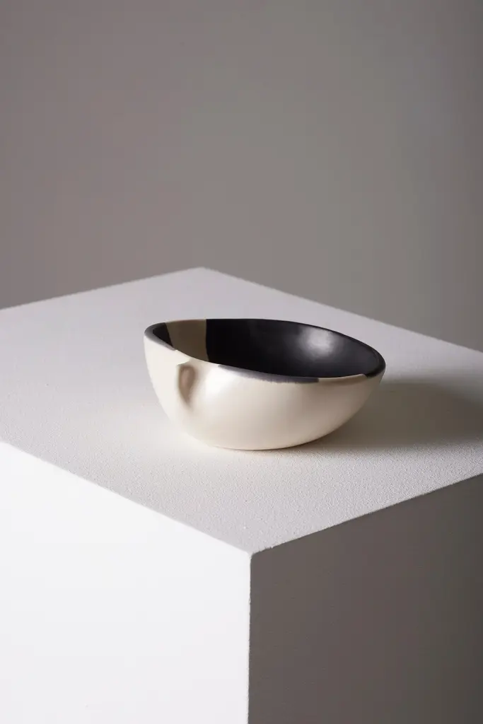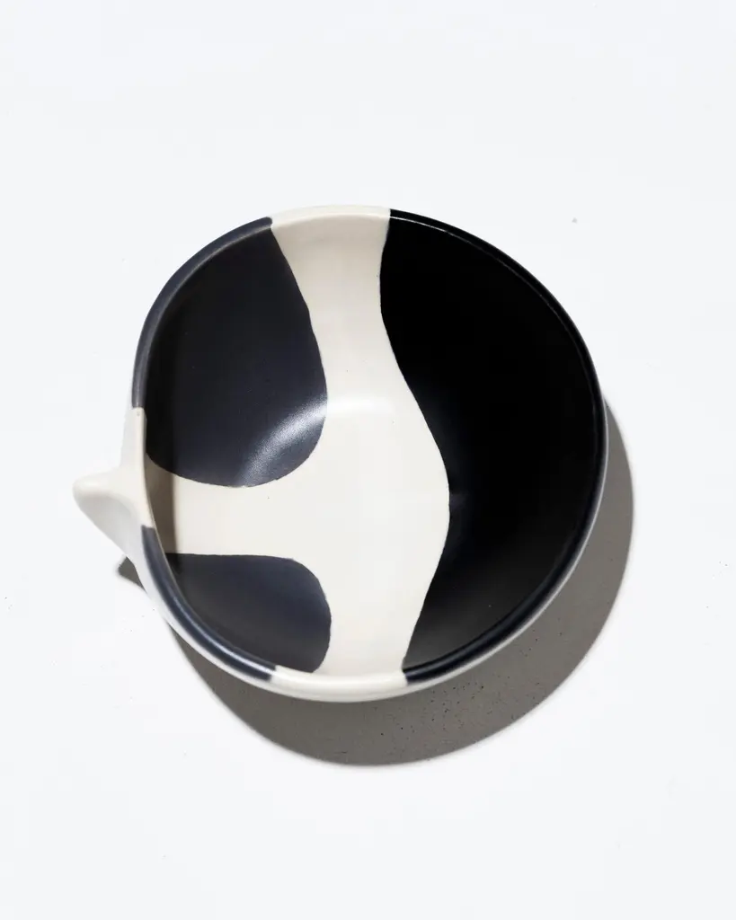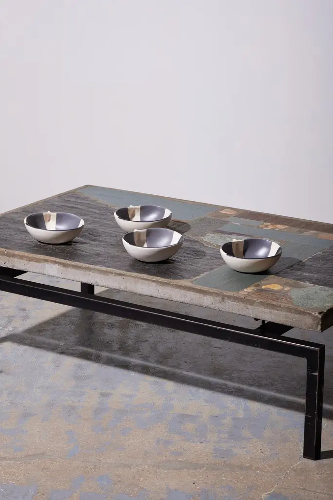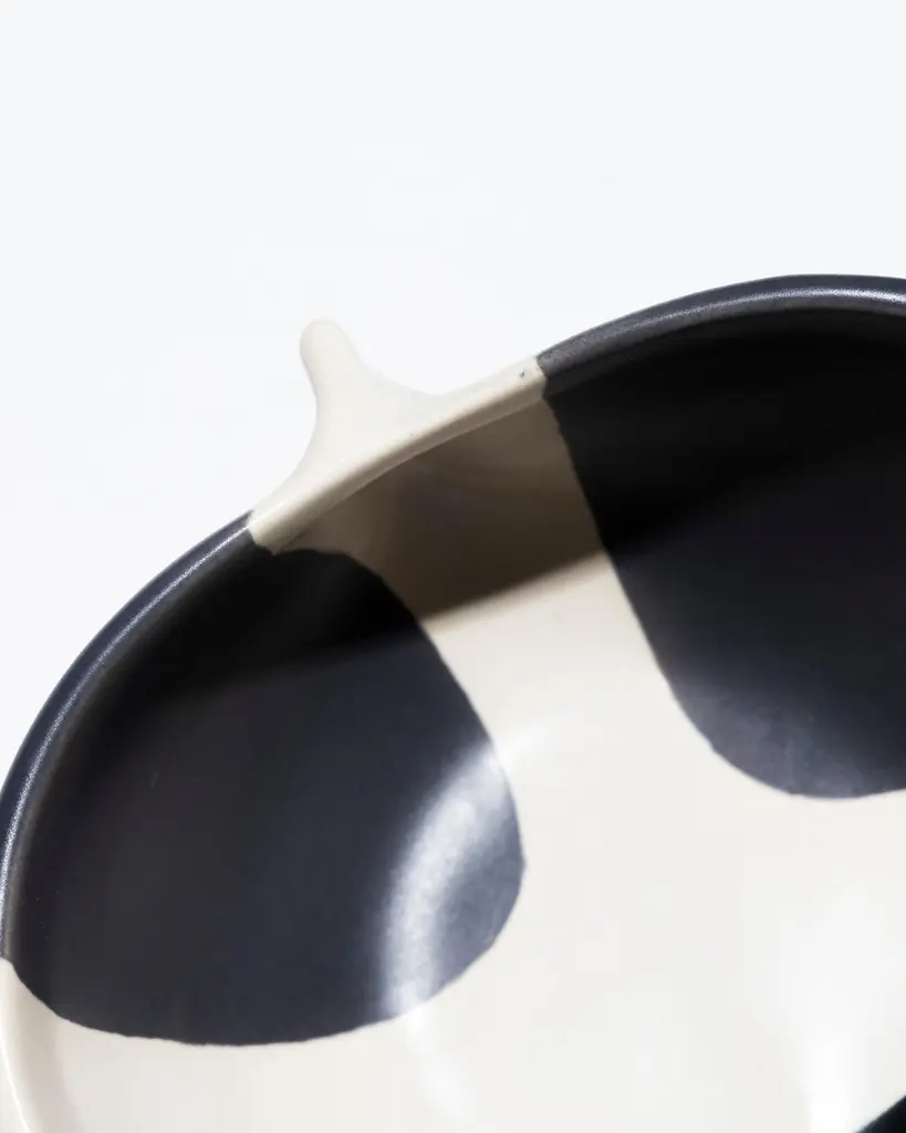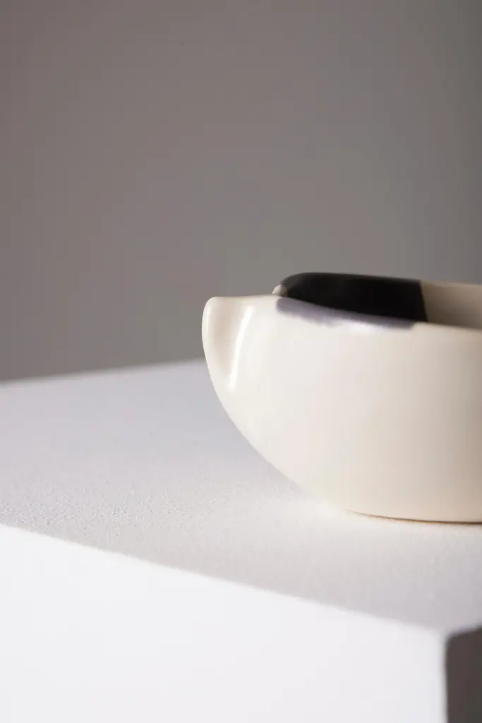 Small pinched ceramic bowl by French artist Mado Jolain (1921–2019), dating from the 1950s and signed "MJ" on the underside. A renowned ceramicist and designer, Mado Jolain was celebrated for her creations that blended aesthetics and functionality, particularly during the 1950s and 1960s. After studying at the École des Beaux-Arts in Paris, she collaborated with haute couture houses by designing fashion accessories. This piece, in excellent condition, is a testament to her talent and creative spirit.DV665-DV668