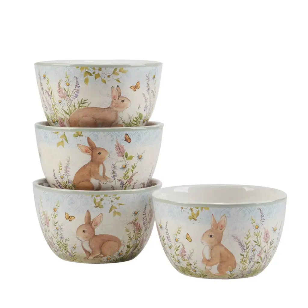 The Easter Meadow Set of 4 Ice Cream Bowls is perfect for serving your favorite desserts in style. With a generous 24 oz. capacity, these bowls are ideal for ice cream, sorbets, fruit salads, or even soups. Each bowl features a delightful bunny illustration, surrounded by wildflowers and butterflies, making them a charming addition to any springtime, or Easter, celebration.