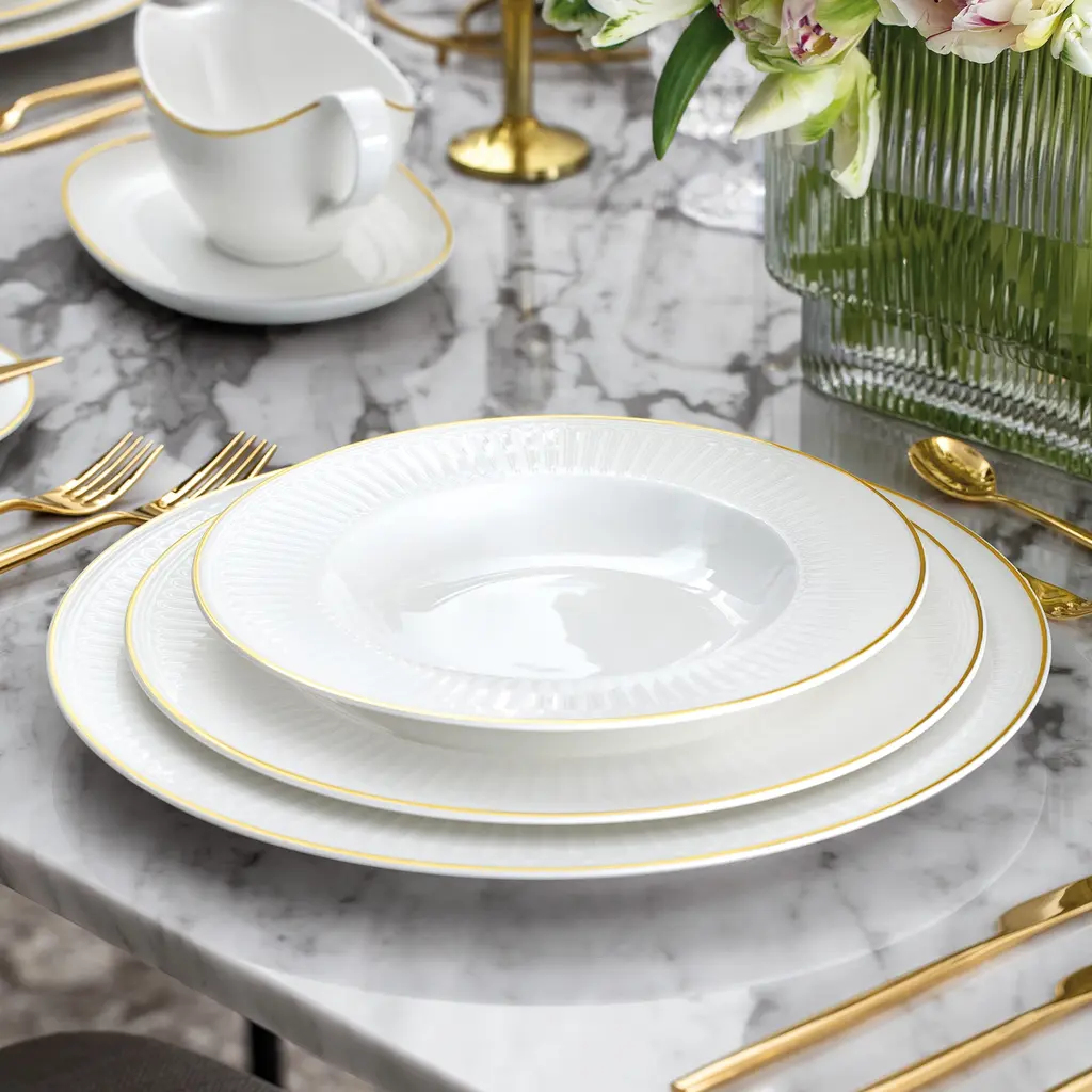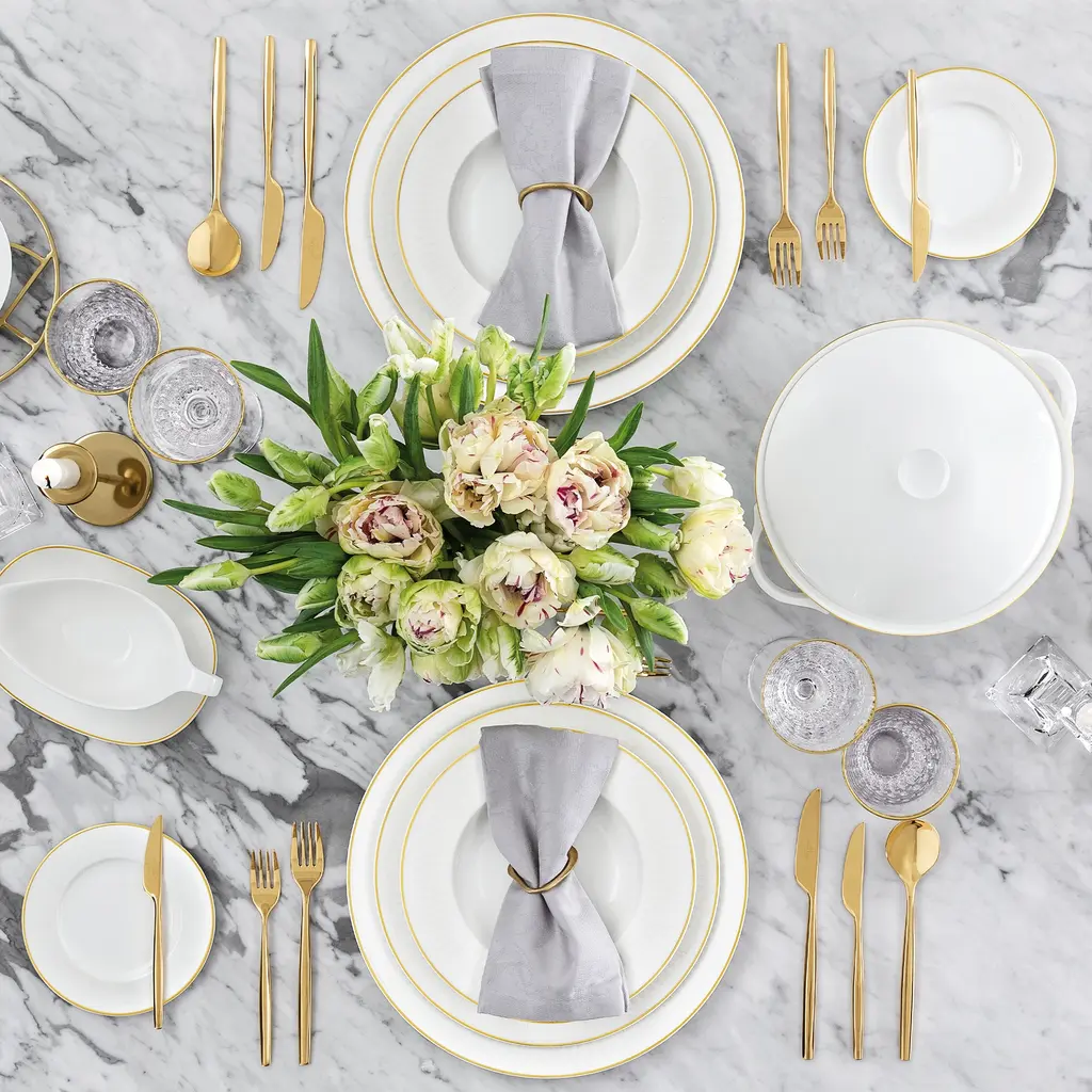 Opting for a clean and pure aesthetic, Villeroy & Boch turns to minimalist elements with its Château Septfontaines collection. Crafted from premium bone porcelain, this collection features an understated design that is ideal for bringing a sense of calm to your dining experience. Trimmed in precious gold.
