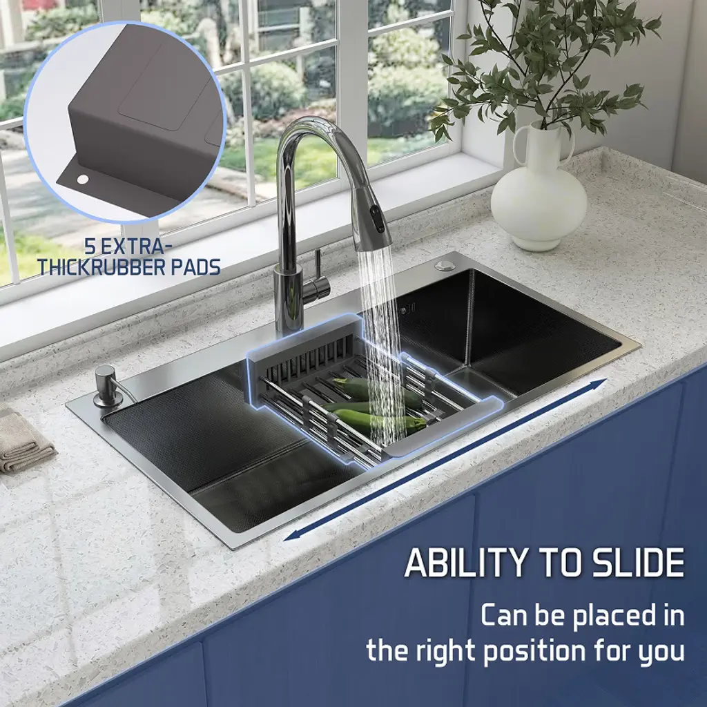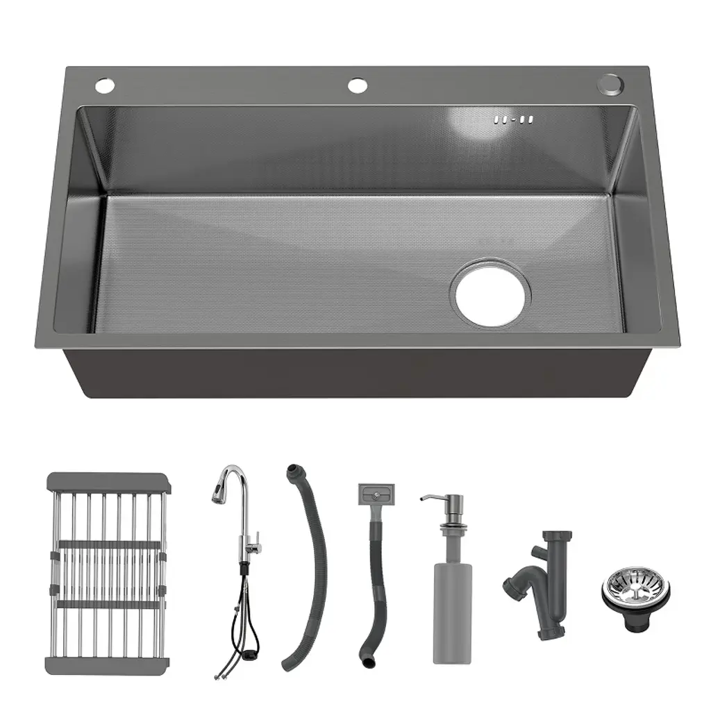 CHEVNI Silver Kitchen Sink Stainless Steel Single Bowl With Faucet Drop In Top Mount Crafted from premium-grade stainless steel, this single bowl kitchen sink combines durability, functionality, and sleek modern design, making it an ideal choice for contemporary kitchens. Its Nano Coating brushed finish not only adds a sophisticated aesthetic but also hides minor water spots and fingerprints, maintaining a clean look with minimal effort. Specification -Material: Stainless Steel -Color: Silver/Nano Coating Package Includes:-1 x Kitchen Sink Workstation (Includes complete set of accessories) Kitchen Sink x 1Pull-out Faucet x 1Drain rack x 1Soap dispenser x 1Water leakage x 1Gravity ball x 1Draining Kit x 1