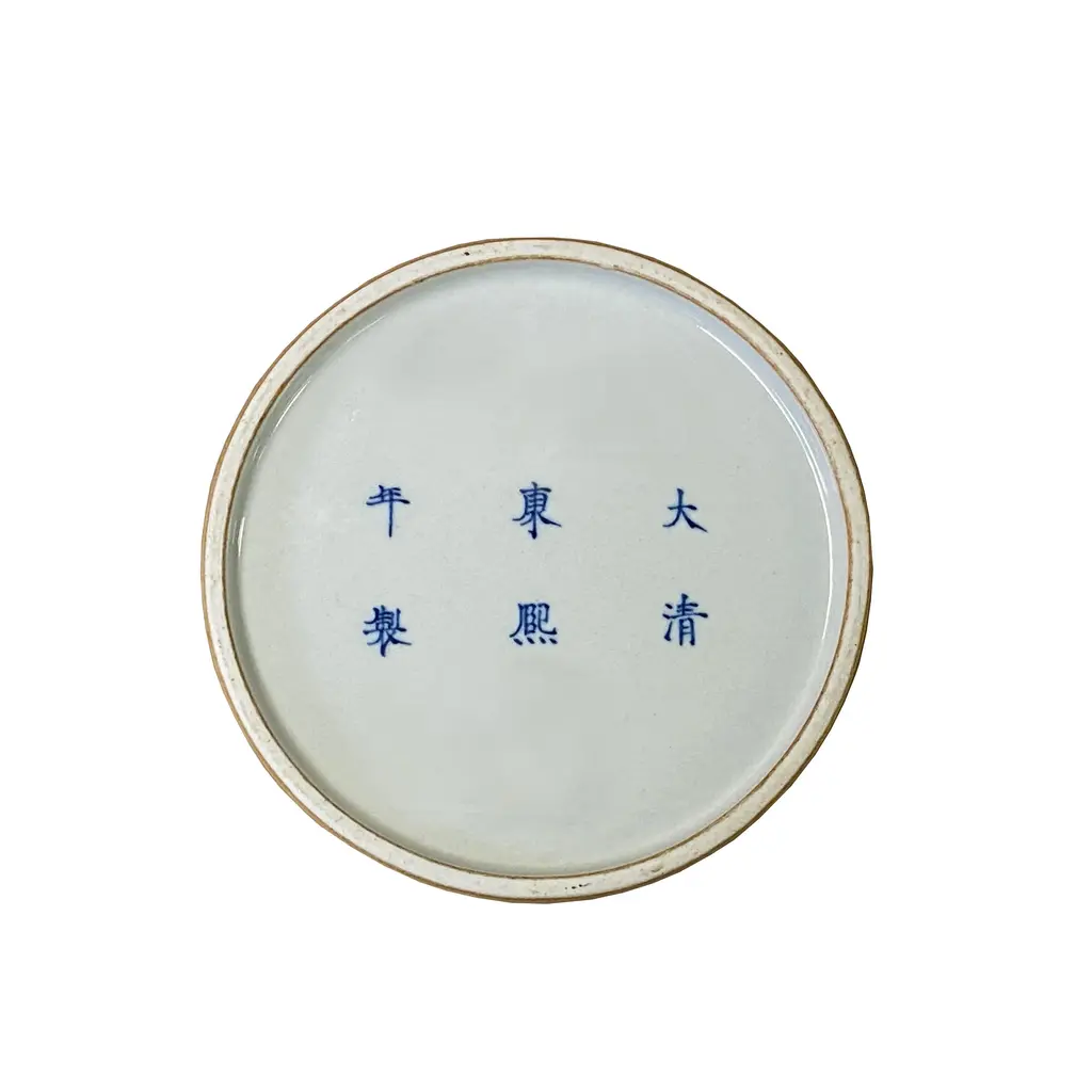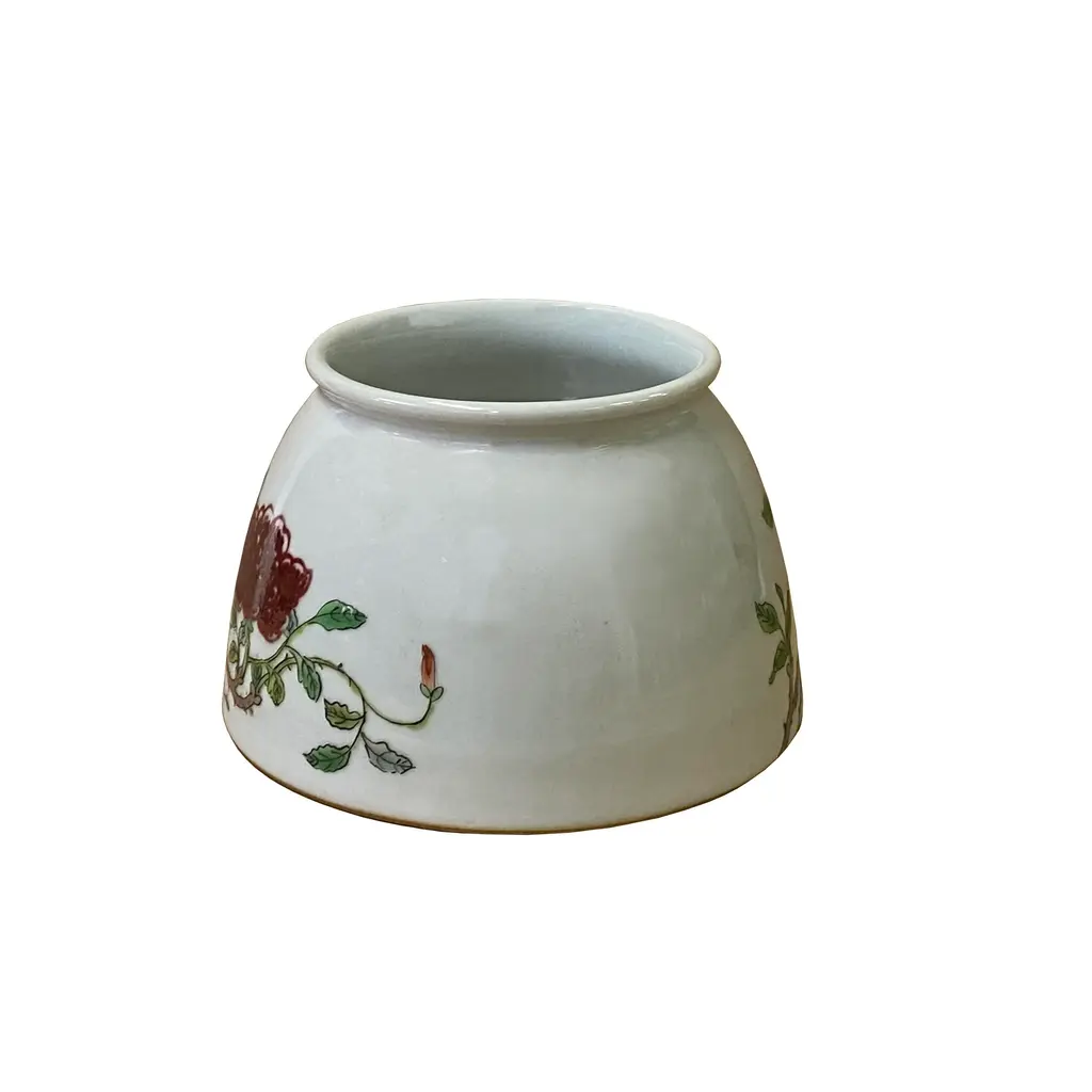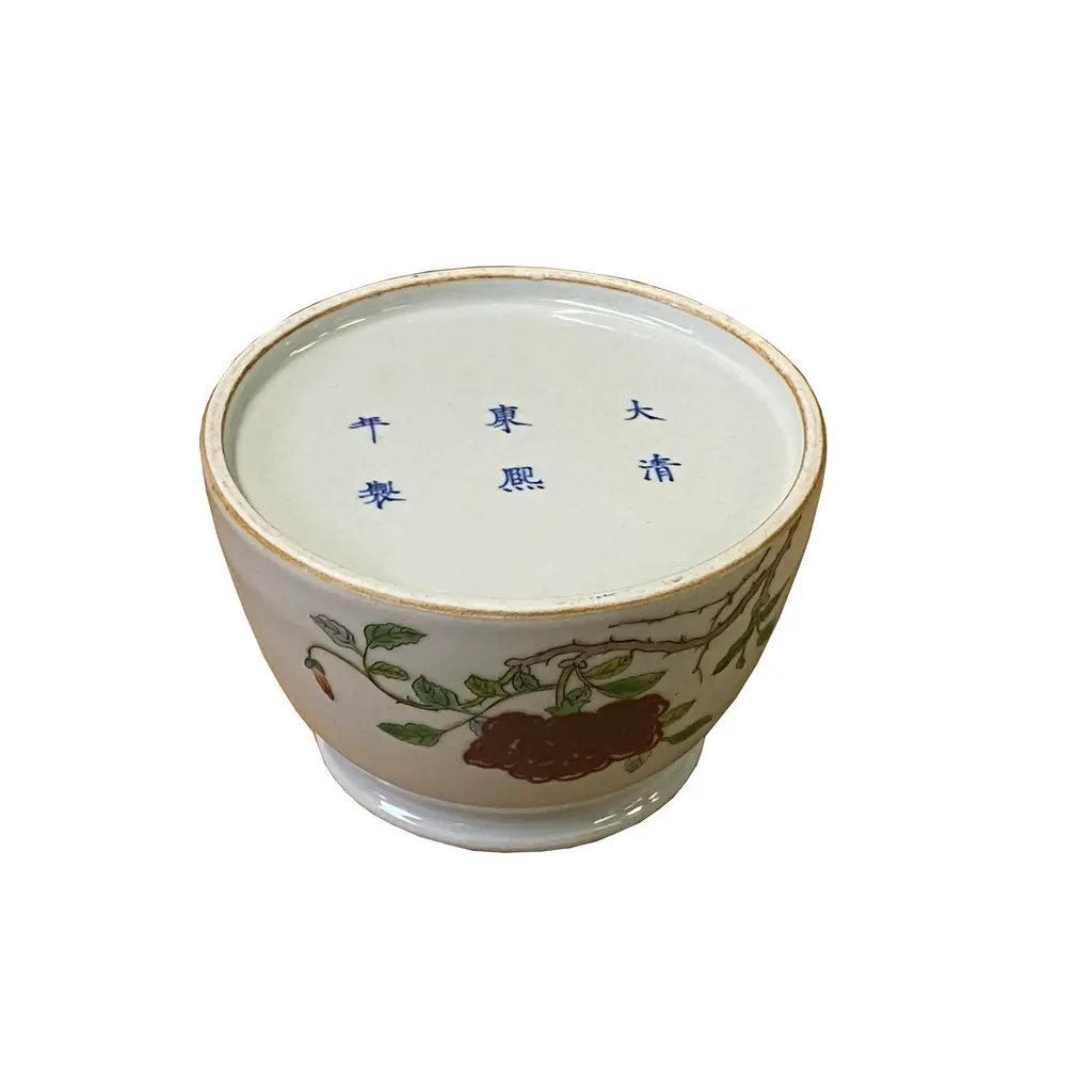 This is an oriental Chinese bowl container with a distressed off-white base and oriental brick red flower scenery graphics. Not for food serving. Museum copy. Dimensions: Dia 5"x h3", opening dia 2.5" Origin: China Material: Porcelain Condition: hand made, vintage style finish, distressed marks For all USA domestic continental customers (from 48 states), there is a flat shipping fee of $30, which includes insurance and handling charges.