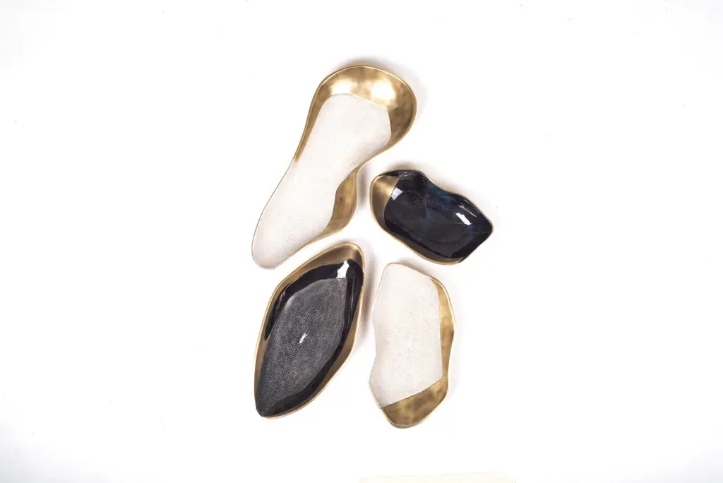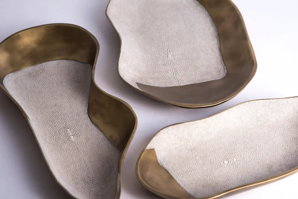 The Paris based label has distinguished themselves since their launch, with their iconic use of shagreen mixed with brass and other exotic materials. All furniture is handcrafted by skilled artisans, ultimately making each piece unique, designed in Paris and produced in the Philippines.This listing is for the chital bowl in the large size as shown in the first 4 images.The chital bowls with their amorphous shape are both beautiful and functional as bowls or trays. Available in 4 other sizes and inlaid in different finishes including cream shagreen, black shagreen, blue shell, black shell and bronze-patina brass. The shell pieces are hand-selected before being inlaid creating a unique surface each time. The shagreen is hand-dyed by artisans. This piece is designed by Kifu Augousti, the daughter of Ria and Yiouri Augousti.The dimensions of these pieces are: L: 35.5 x 5.5 x 3 cm / 13.9 x 2.2 x 1.2"The other sizes are:XS: 19.5 x 11 x 3 cm / 7.7 x 4.3 x 1.2"S: 25 x 13 x 3 cm / 9.8 x 5.1 x 1.2"M: 29.5 x 15 x 3 cm / 11.6 x 5.9 x 1.2"All Kifu Paris pieces are handmade by artisans, ultimately making each piece unique. Custom color or sizing available on request. Wipe clean with soft dry cloth.Although inspired by her parents, her collection of Home Accessories and Furniture is a distinct identity of its own. Kifu uses handmade techniques of elaborate inlay patterns of shagreen, shells, semi-precious stones, materials she experienced as a child growing up in her parent’s studio, but interpreted in a younger quirkier way reflecting her youth. From her "jewelry inspired knobs" on decorative boxes, gold bar boxes and an extravagant inlay pattern mix of shagreen and shell inspired by galactic constellations, as seen on her enormous round mirror, is refreshing to see. Kifu embodies whimsical elements throughout her collection and is not afraid to be daring and unexpected in her approach to design. All shagreen-covered items should be kept out of direct sunlight, color variants may occur on the stingray and other exotic finishes, but this showcases the Parisian label's commitment to creating authentic luxurious products using natural components.