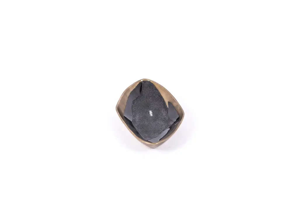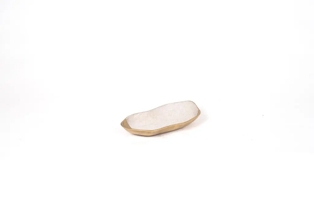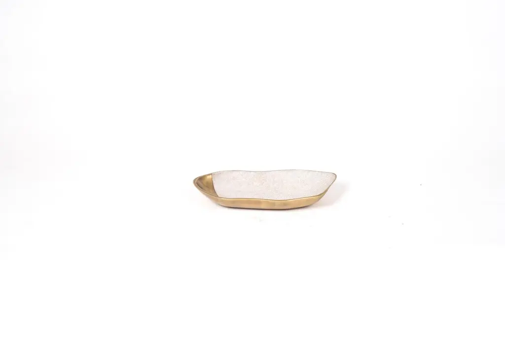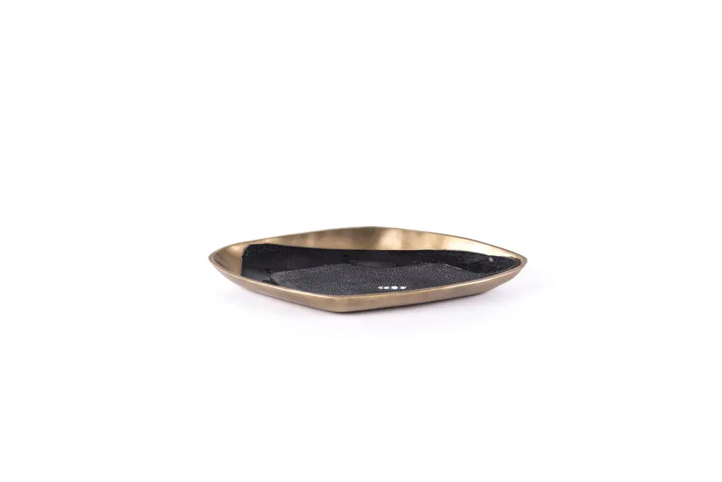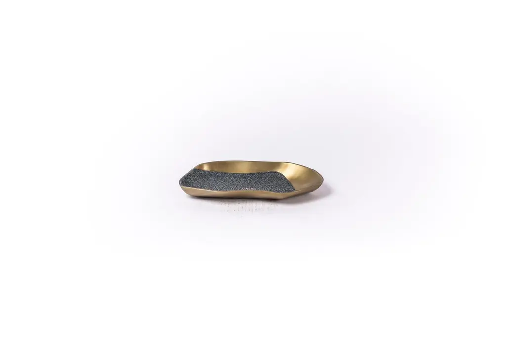 The Paris based label has distinguished themselves since their launch, with their iconic use of shagreen mixed with brass and other exotic materials. All furniture is handcrafted by skilled artisans, ultimately making each piece unique, designed in Paris and produced in the Philippines.This listing is for the chital bowl in the extra small size in blue pen shell as shown in the first images.The chital bowls with their amorphous shape are both beautiful and functional as bowls or trays. Available in 4 other sizes and inlaid in different finishes including cream shagreen, black shagreen, blue shell, black shell and bronze-patina brass. The shell pieces are hand-selected before being inlaid creating a unique surface each time. The shagreen is hand-dyed by artisans. This piece is designed by Kifu Augousti, the daughter of Ria and Yiouri Augousti.The dimensions of these pieces are: XS: 7.7 x 4.3 x 1.2"The other sizes are:XS: 19.5 x 11 x 3 cm / 7.7 x 4.3 x 1.2"M: 29.5 x 15 x 3 cm / 11.6 x 5.9 x 1.2"L: 35.5 x 5.5 x 3 cm / 13.9 x 2.2 x 1.2"All Kifu Paris pieces are handmade by artisans, ultimately making each piece unique. Custom color or sizing available on request. Wipe clean with soft dry cloth.Although inspired by her parents, her collection of Home Accessories and Furniture is a distinct identity of its own. Kifu uses handmade techniques of elaborate inlay patterns of shagreen, shells, semi-precious stones, materials she experienced as a child growing up in her parent’s studio, but interpreted in a younger quirkier way reflecting her youth. From her "jewelry inspired knobs" on decorative boxes, gold bar boxes and an extravagant inlay pattern mix of shagreen and shell inspired by galactic constellations, as seen on her enormous round mirror, is refreshing to see. Kifu embodies whimsical elements throughout her collection and is not afraid to be daring and unexpected in her approach to design. All shagreen-covered items should be kept out of direct sunlight, color variants may occur on the stingray and other exotic finishes, but this showcases the Parisian label's commitment to creating authentic luxurious products using natural components.