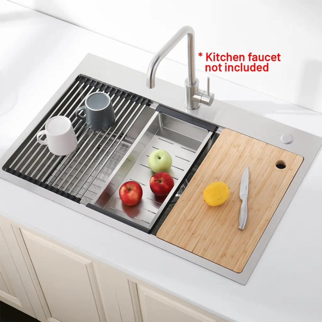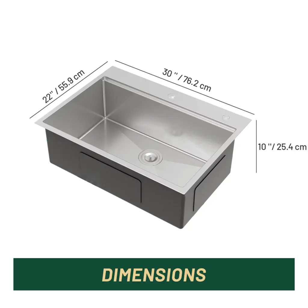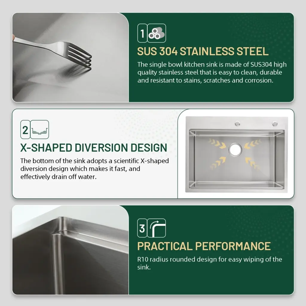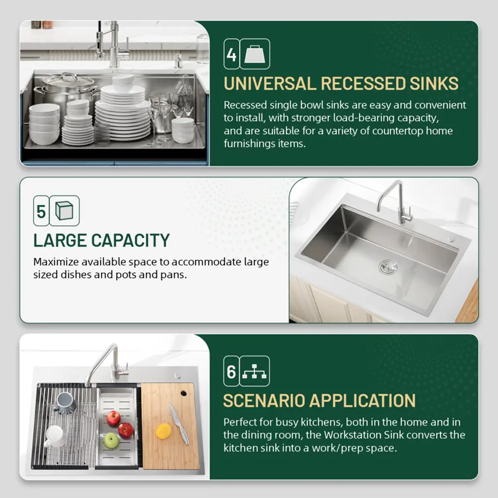 304 STAINLESS STEEL KITCHEN SINKS: Made of 304 stainless steel, the thickness is uniform and the texture is better. Longer service life. The flawless, smooth texture and golden ratio R10 rounded corners make it more aesthetic, and functional. 30 INCH WORKSTATION KITCHEN SINK: Workstation sinks maximize efficiency and help keep the food prep zone tidy. X-SHAPED DIVERSION DESIGN: The bottom of the sink adopts a scientific X-shaped diversion design which makes it fast, and effectively drain off water. KITCHEN SINK SETS with SINGLE TRACK: Designed with an integrated single-tier rail for sliding built-in custom accessories, the Workstation Sink provides you with a versatile, efficient space for all your kitchen tasks. The package includes the deep kitchen sink, cutting board, drainage basin, grid and drain. EFFECTIVE NOISE REDUCTION: The outer side of the sink's bottom is not only covered with sound-dampening pads but also sprayed with damp-proof paint coating to achieve the effect of noise reduction and moisture absorption, making the sink quieter to use and reducing condensation at the bottom of the sink. SINGLE BOWL SINK: The single bowl sink is simple and convenient to install, has more load-bearing capacity, and is suitable for all kinds of tabletop in-home improvement items. Ideal for busy kitchens, either home or restaurant, the workstation sink converts your kitchen sink into a work/prep space.