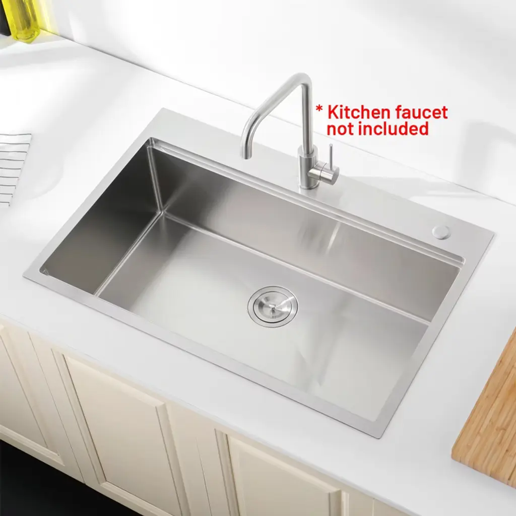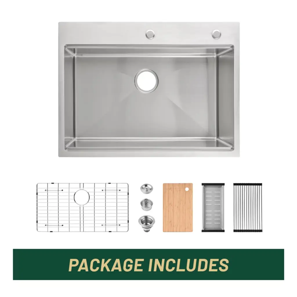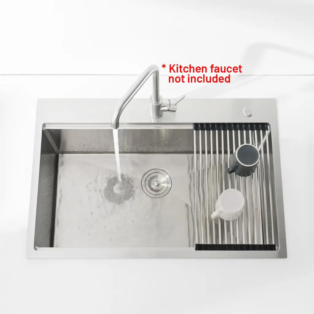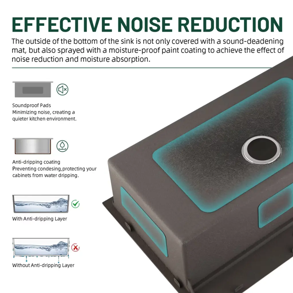 304 STAINLESS STEEL KITCHEN SINKS: Made of 304 stainless steel, the thickness is uniform and the texture is better. Longer service life. The flawless, smooth texture and golden ratio R10 rounded corners make it more aesthetic, and functional. 30 INCH WORKSTATION KITCHEN SINK: Workstation sinks maximize efficiency and help keep the food prep zone tidy. X-SHAPED DIVERSION DESIGN: The bottom of the sink adopts a scientific X-shaped diversion design which makes it fast, and effectively drain off water. KITCHEN SINK SETS with SINGLE TRACK: Designed with an integrated single-tier rail for sliding built-in custom accessories, the Workstation Sink provides you with a versatile, efficient space for all your kitchen tasks. The package includes the deep kitchen sink, cutting board, drainage basin, grid and drain. EFFECTIVE NOISE REDUCTION: The outer side of the sink's bottom is not only covered with sound-dampening pads but also sprayed with damp-proof paint coating to achieve the effect of noise reduction and moisture absorption, making the sink quieter to use and reducing condensation at the bottom of the sink. SINGLE BOWL SINK: The single bowl sink is simple and convenient to install, has more load-bearing capacity, and is suitable for all kinds of tabletop in-home improvement items. Ideal for busy kitchens, either home or restaurant, the workstation sink converts your kitchen sink into a work/prep space.