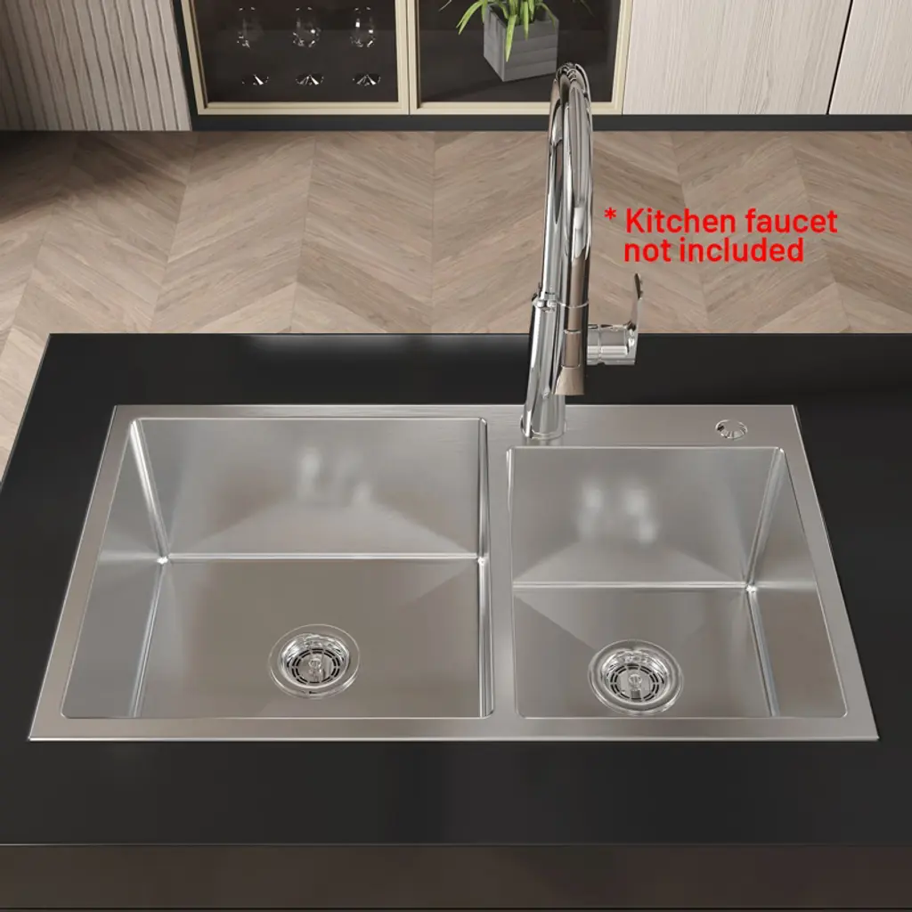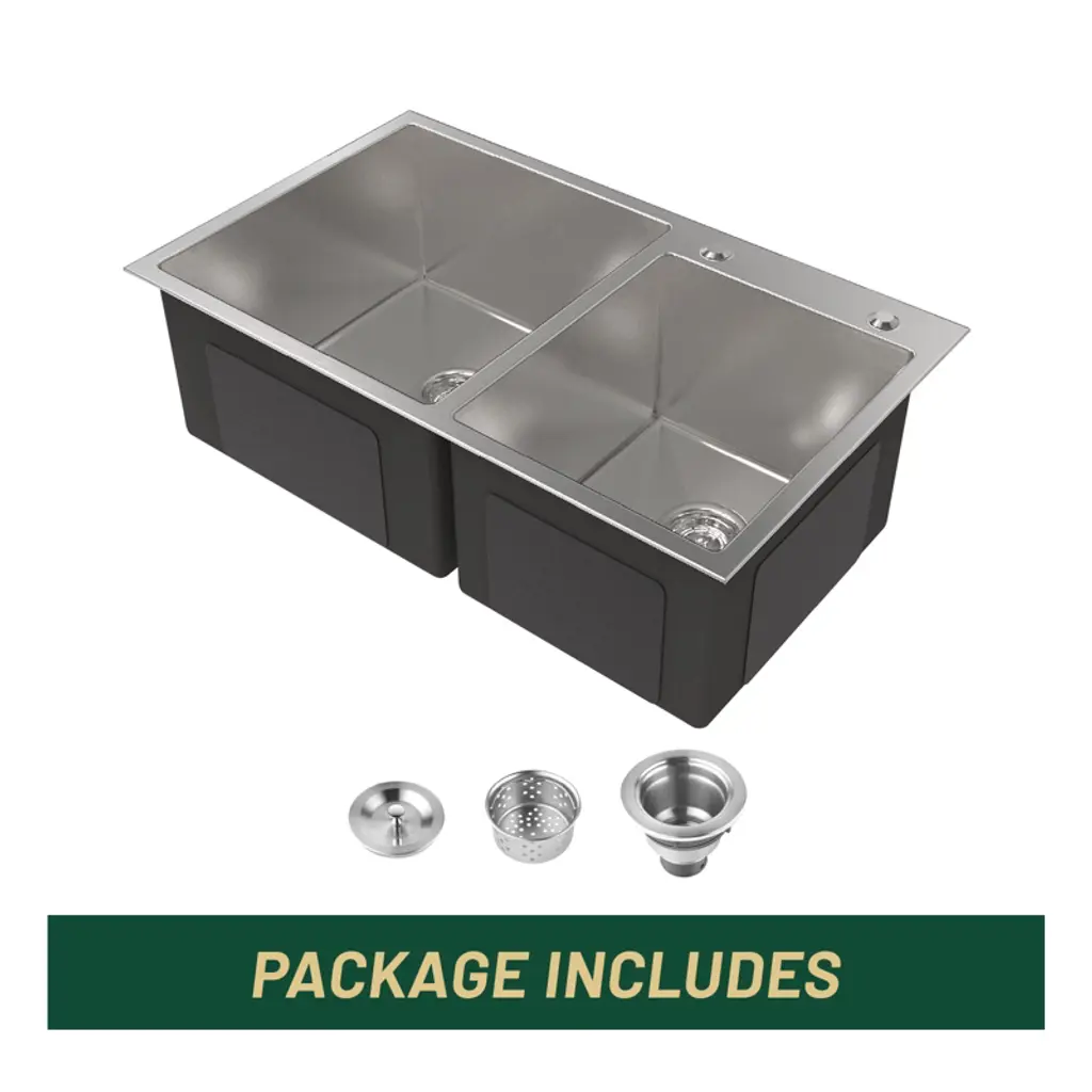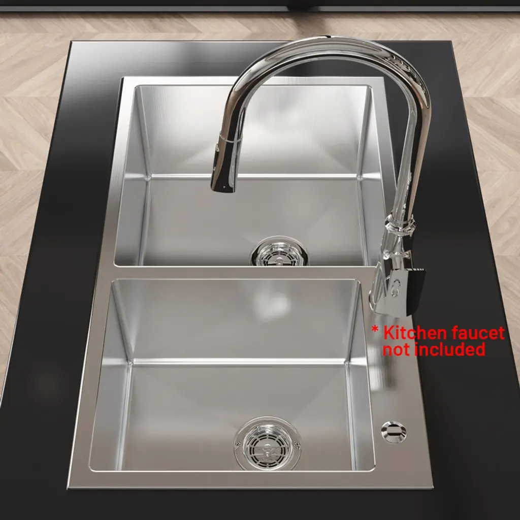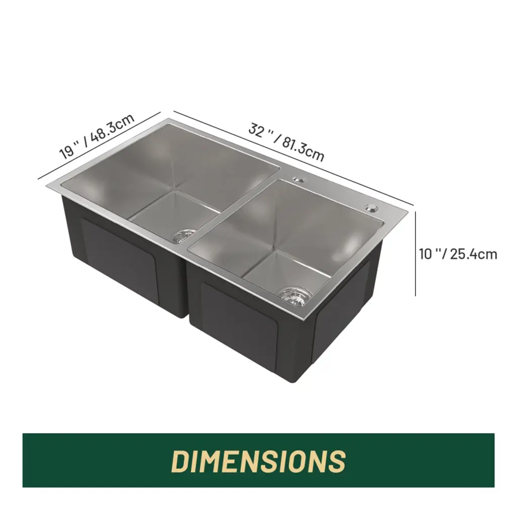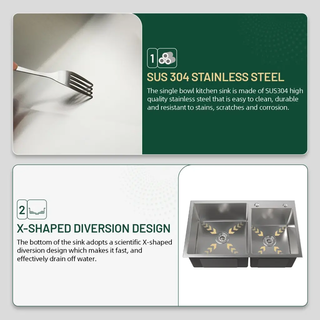 304 STAINLESS STEEL KITCHEN SINKS: Made of 304 stainless steel, the thickness is uniform and the texture is better. Longer service life. The flawless, smooth texture and golden ratio R10 rounded corners make it more aesthetic, and functional. 32 INCH WORKSTATION KITCHEN SINK: Workstation sinks maximize efficiency and help keep the food prep zone tidy. X-SHAPED DIVERSION DESIGN: The bottom of the sink adopts a scientific X-shaped diversion design which makes it fast, and effectively drain off water. EFFECTIVE NOISE REDUCTION: The outer side of the sink's bottom is not only covered with sound-dampening pads but also sprayed with damp-proof paint coating to achieve the effect of noise reduction and moisture absorption, making the sink quieter to use and reducing condensation at the bottom of the sink. DOUBLE BOWL SINK: The double bowl sink offer versatility for washing, rinsing, and food prep simultaneously, and is suitable for all kinds of tabletop in-home improvement items. Ideal for busy kitchens, either home or restaurant, the workstation sink converts your kitchen sink into a work/prep space.
