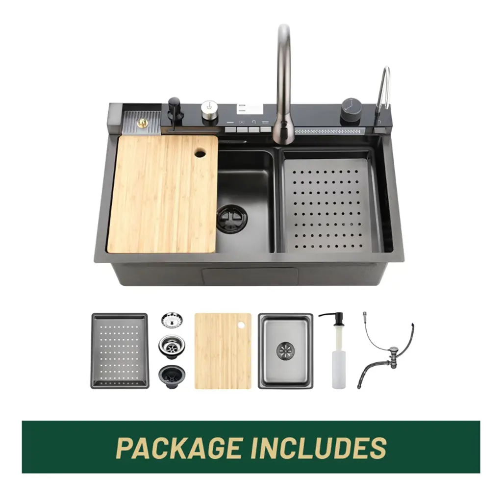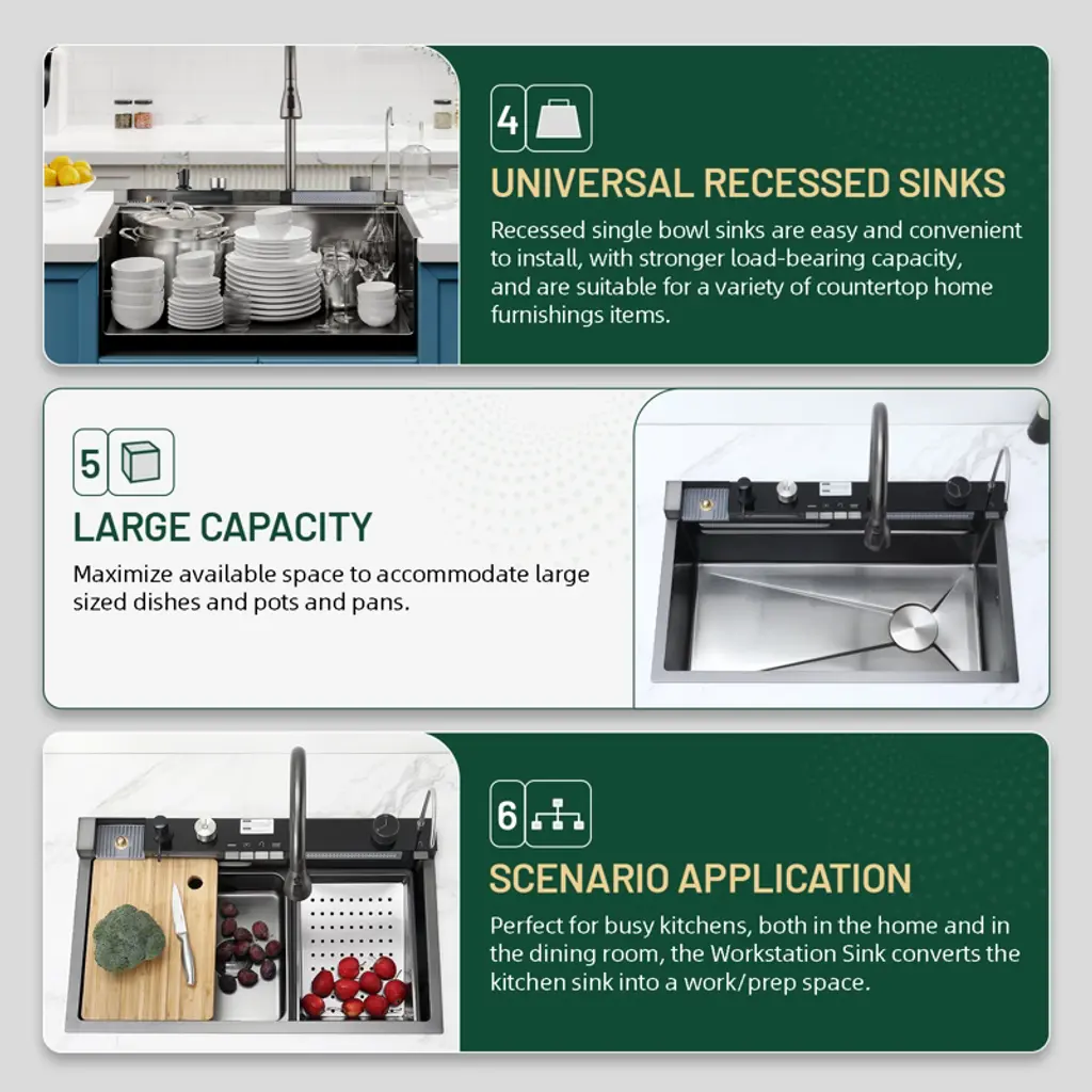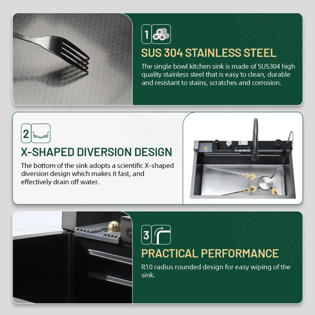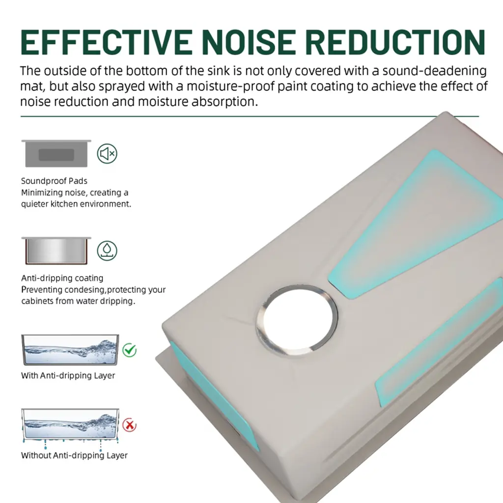 304 STAINLESS STEEL KITCHEN SINKS: Made of 304 stainless steel, the thickness is uniform and the texture is better. Longer service life. The flawless, smooth texture and golden ratio R10 rounded corners make it more aesthetic, and functional. 29.5 INCH WORKSTATION KITCHEN SINK: Workstation sinks maximize efficiency and help keep the food prep zone tidy. X-SHAPED DIVERSION DESIGN: The bottom of the sink adopts a scientific X-shaped diversion design which makes it fast, and effectively drain off water. KITCHEN SINK SETS with SINGLE TRACK: Designed with an integrated single-tier rail for sliding built-in custom accessories, the Workstation Sink provides you with a versatile, efficient space for all your kitchen tasks. The package includes the deep kitchen sink, kitchen faucet,cutting board, drainage basin and drain. EFFECTIVE NOISE REDUCTION: The outer side of the sink's bottom is not only covered with sound-dampening pads but also sprayed with damp-proof paint coating to achieve the effect of noise reduction and moisture absorption, making the sink quieter to use and reducing condensation at the bottom of the sink. SINGLE BOWL SINK: The single bowl sink is simple and convenient to install, has more load-bearing capacity, and is suitable for all kinds of tabletop in-home improvement items. Ideal for busy kitchens, either home or restaurant, the workstation sink converts your kitchen sink into a work/prep space.