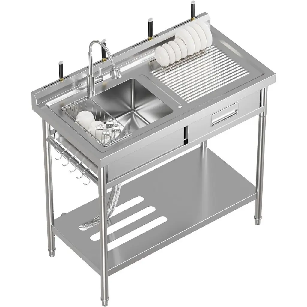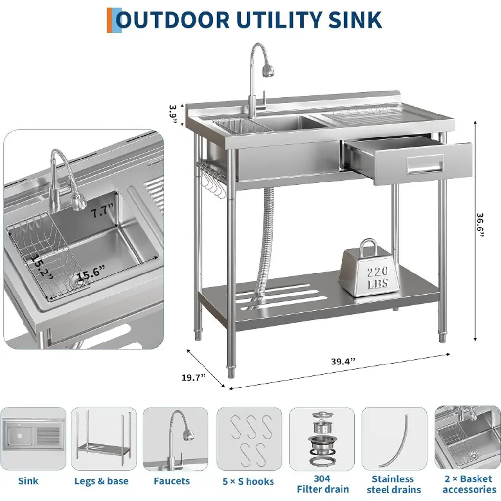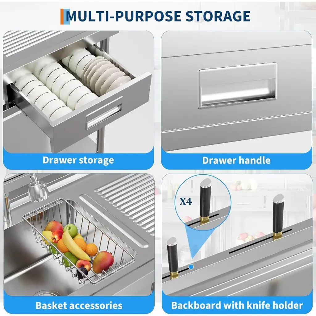 Commercial Stainless Steel Utility Sink, Freestanding Single Bowl Kitchen Sink With Cold & Hot Water Faucet, Built-in Wash Board, Drawer